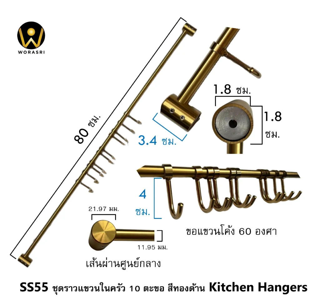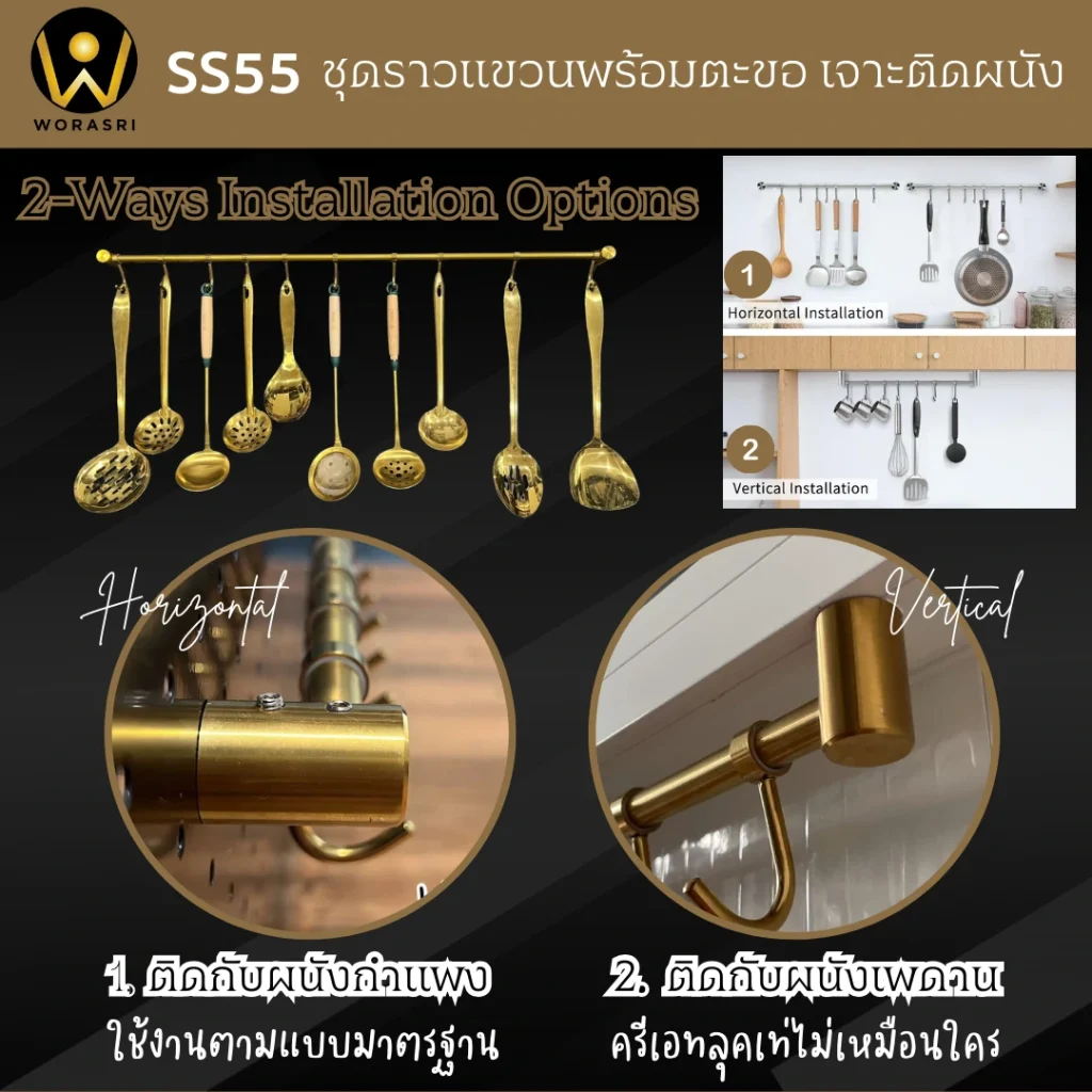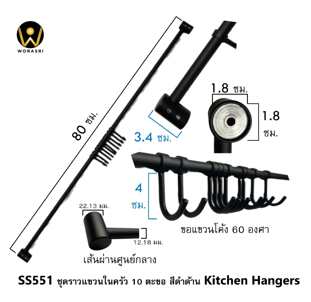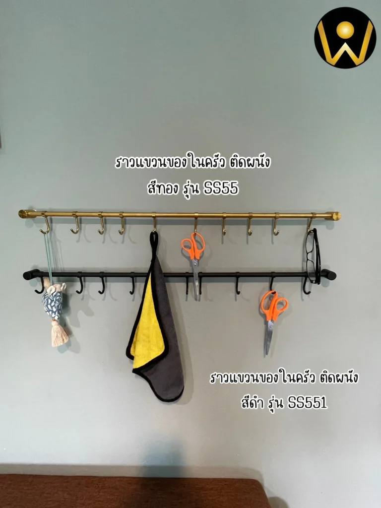 SS55 – SS551 ชุดราวแขวนในครัว 10 ตะขอ สีทองด้าน สีดำด้าน ยาว 80 ซม.