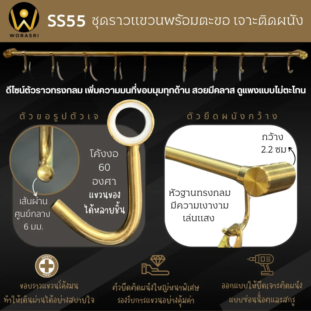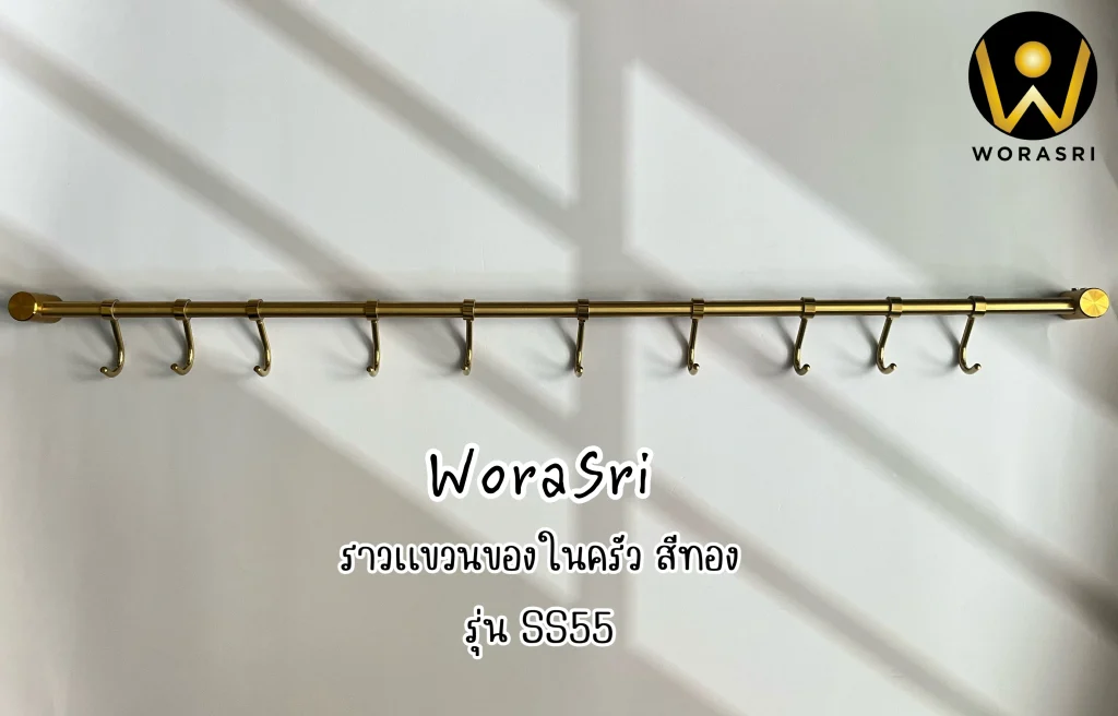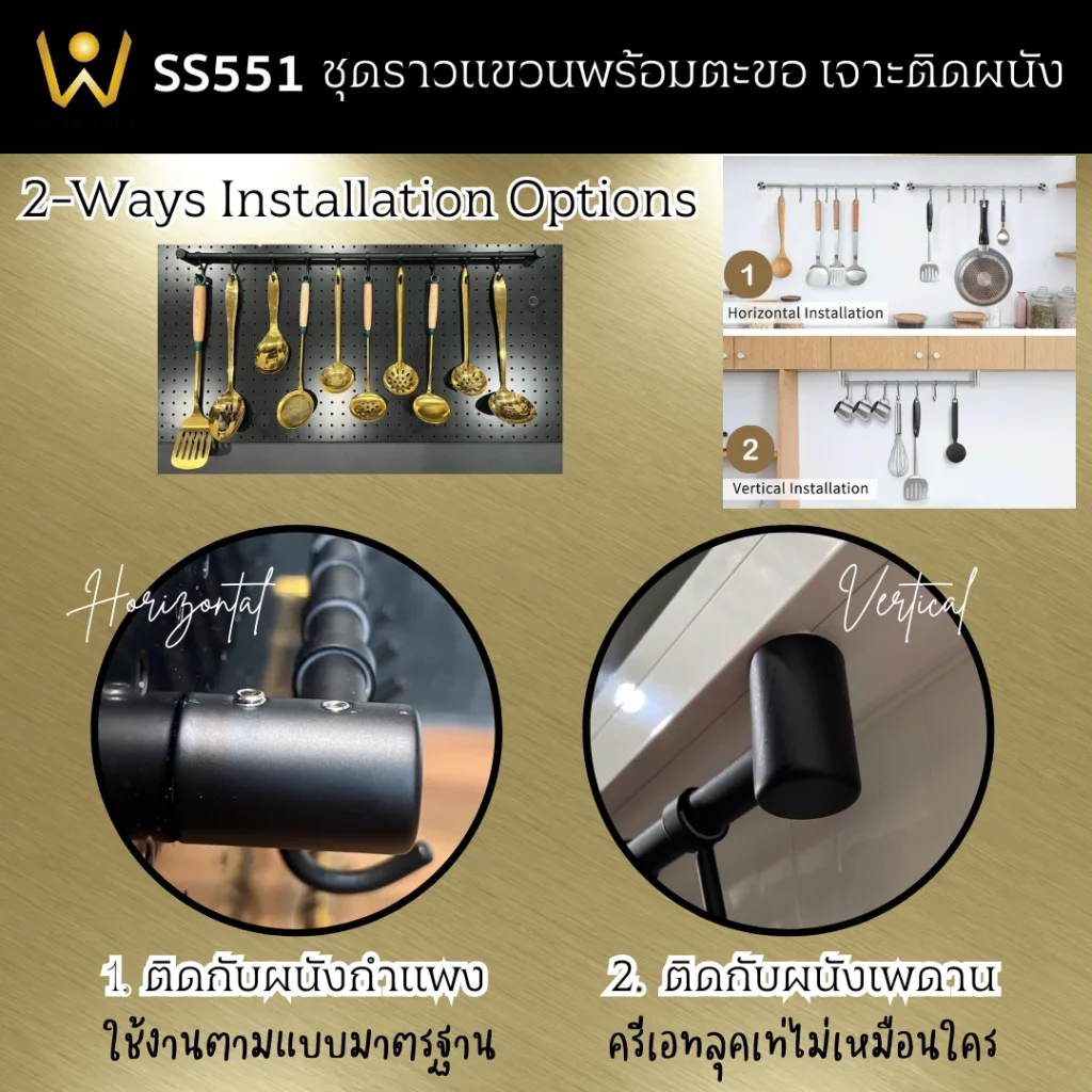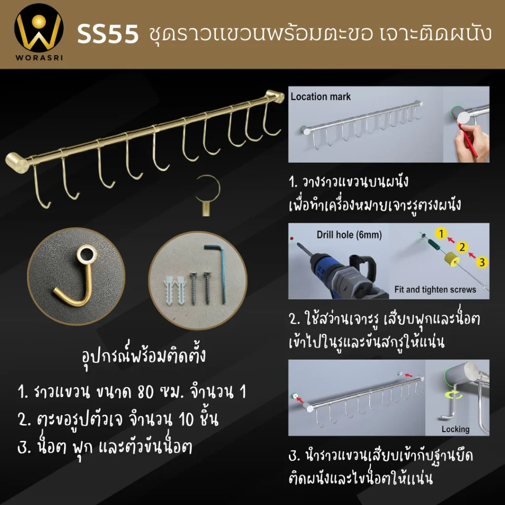 SS55 – SS551 ชุดราวแขวนในครัว 10 ตะขอ สีทองด้าน สีดำด้าน ยาว 80 ซม.