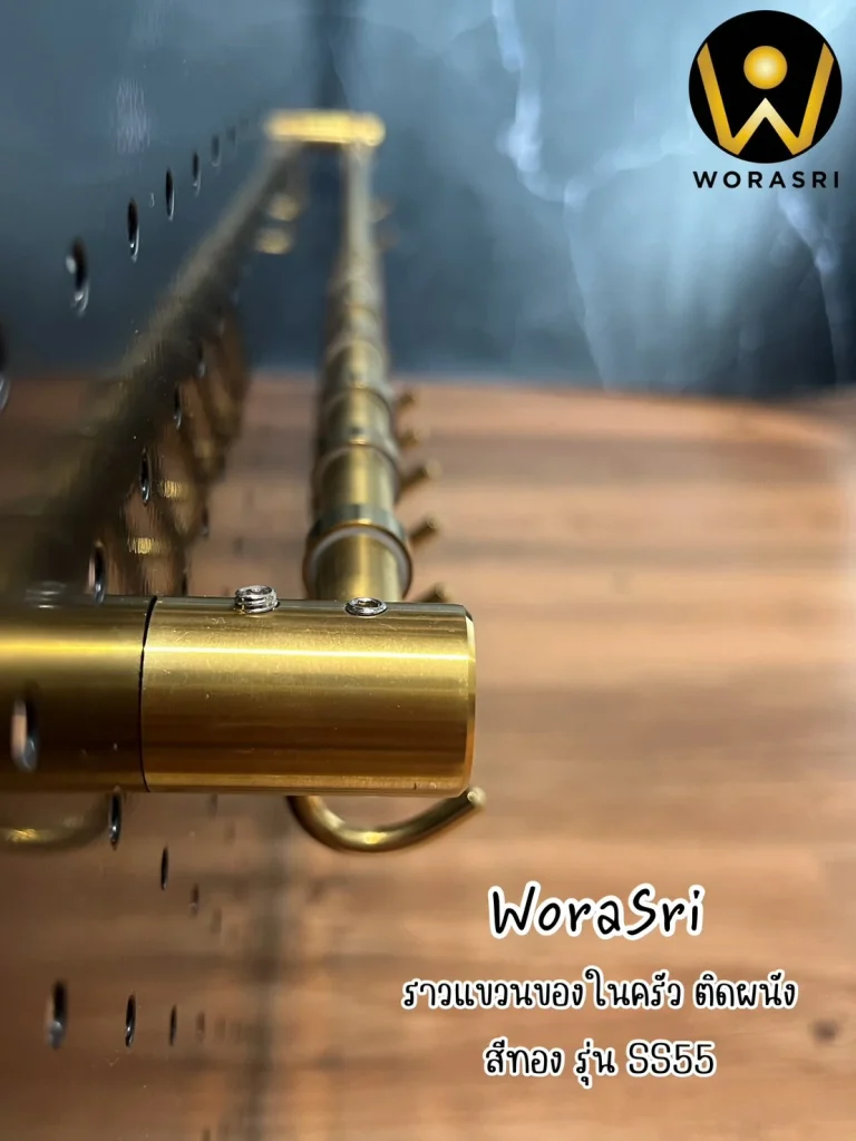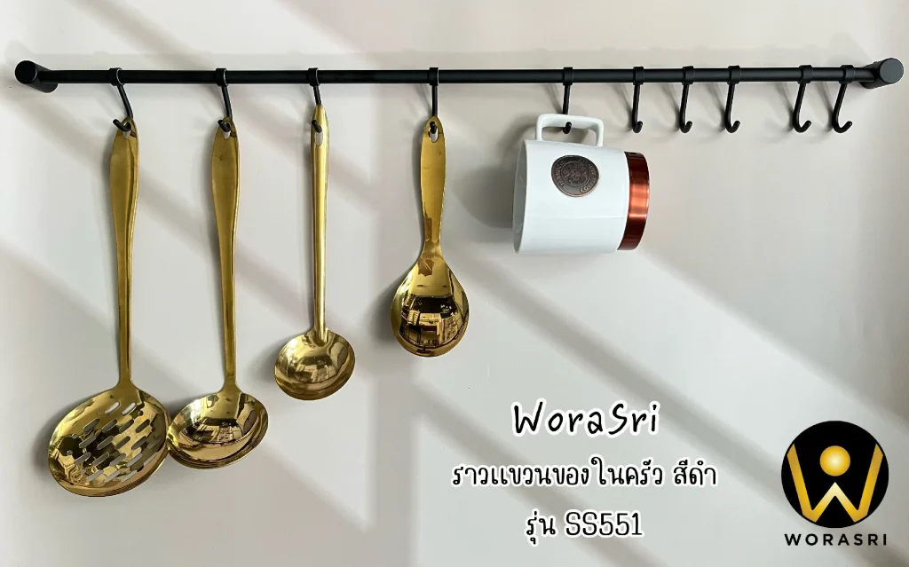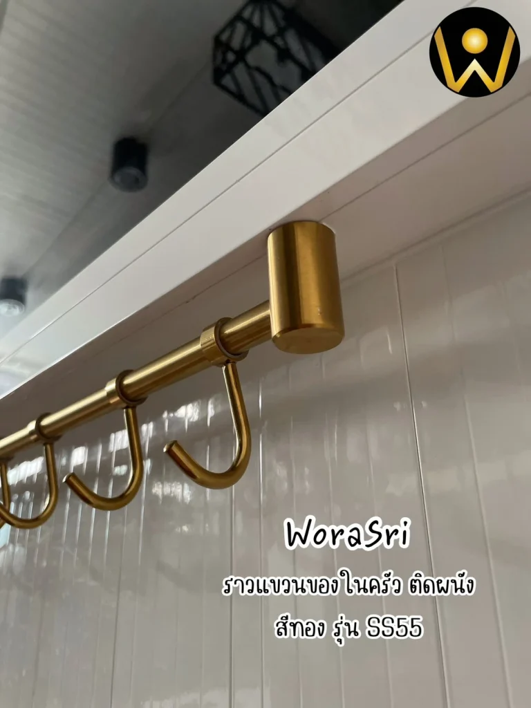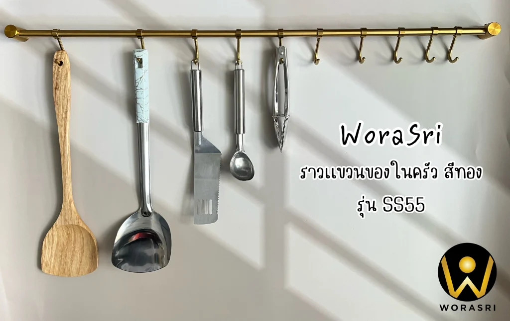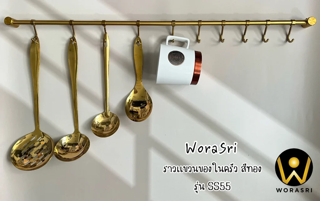 ราวยาวกว่าตะขอเยอะกว่า ก็แขวนได้มากขึ้น ราวแขวนยาวที่มาพร้อมขอแขวนสีทองสวยงาม ผสมผสานความเรียบง่ายเข้ากับความหรูหราด้วยสีทองที่โดดเด่น เหมาะสำหรับแขวนอุปกรณ์ทำครัวต่าง ๆ ได้อย่างลงตัวให้คุณจัดระเบียบครัวได้อย่างมืออาชีพ การหยิบใช้งานได้คล่องตัวเหมือนเชฟเข้าครัว ผลิตจากสแตนเลส 304 มีความแข็งแรงทนทาน มีอายุการใช้งานที่ยาวนาน