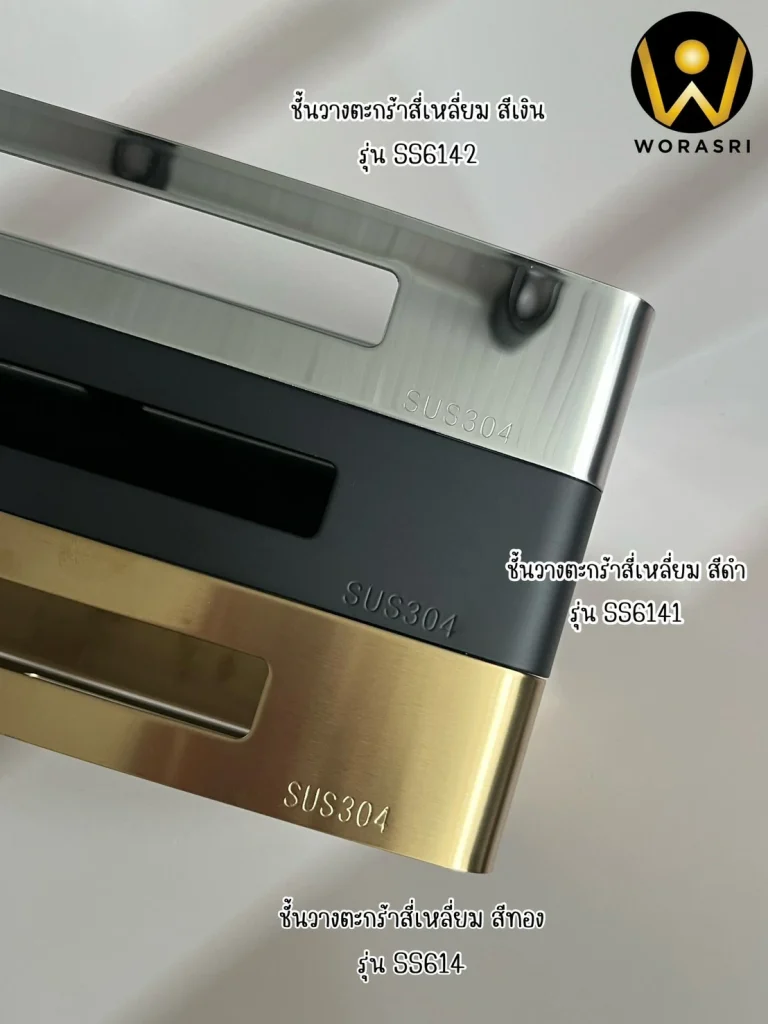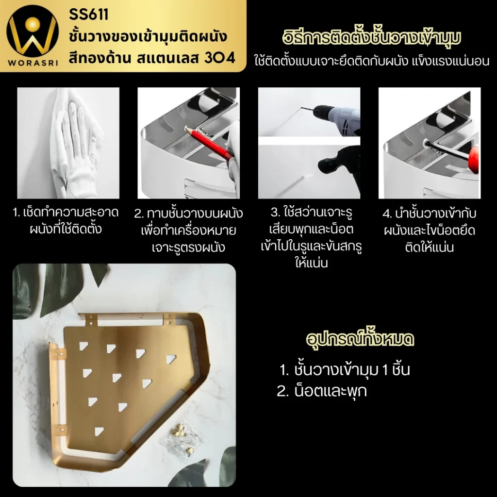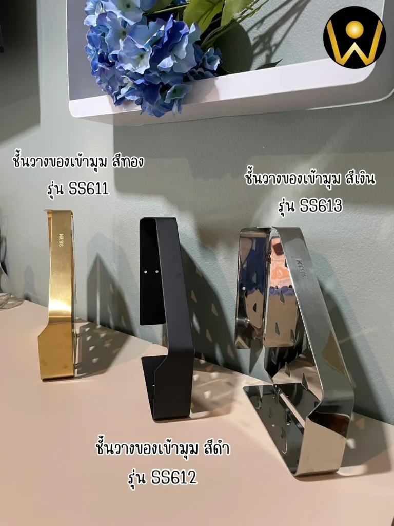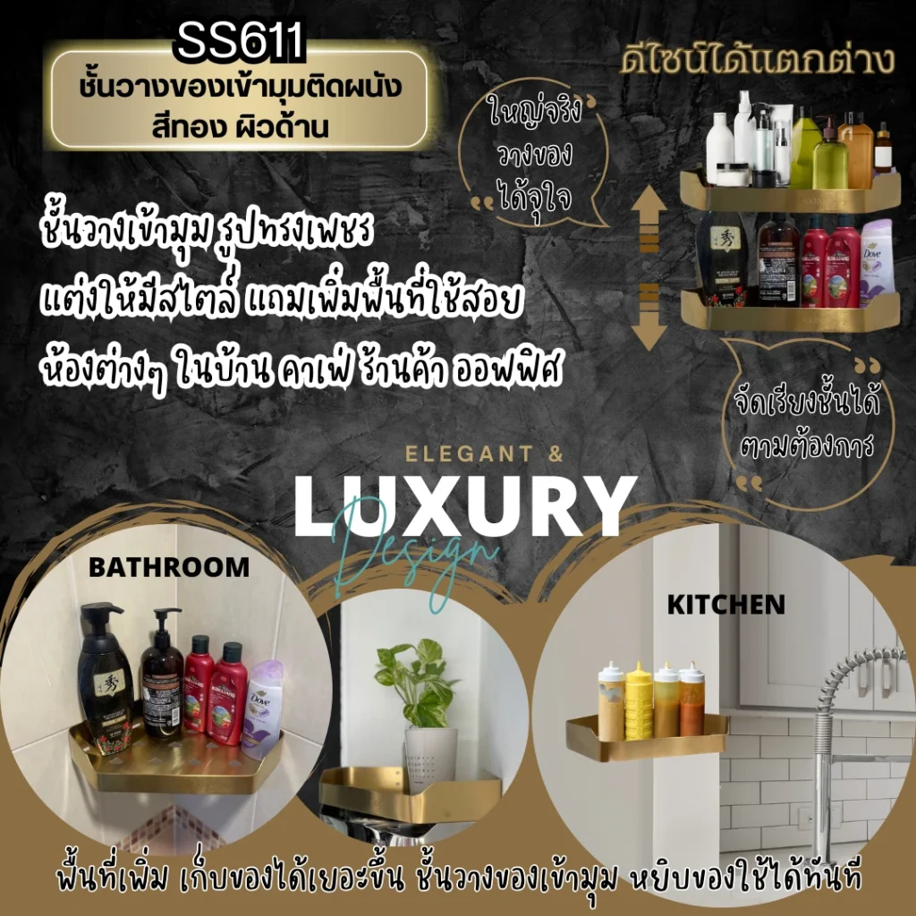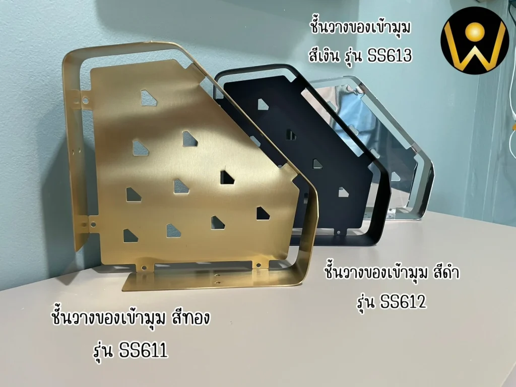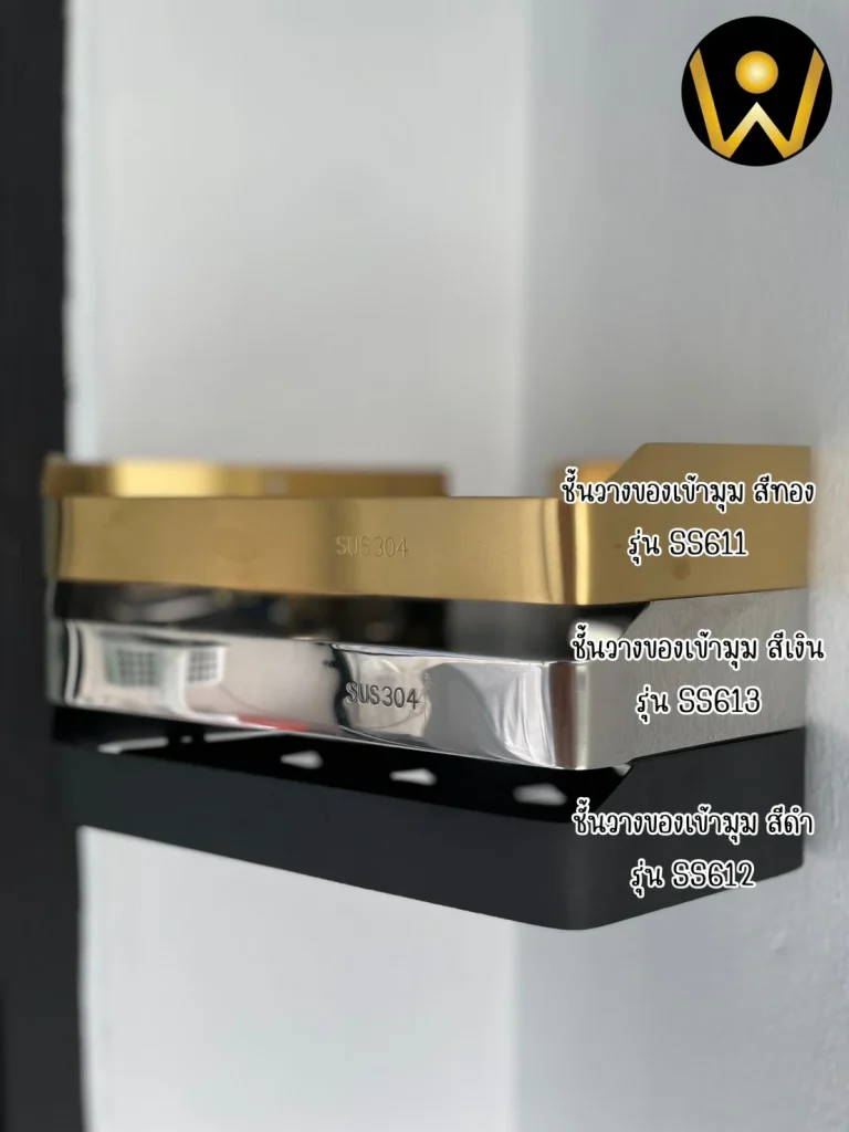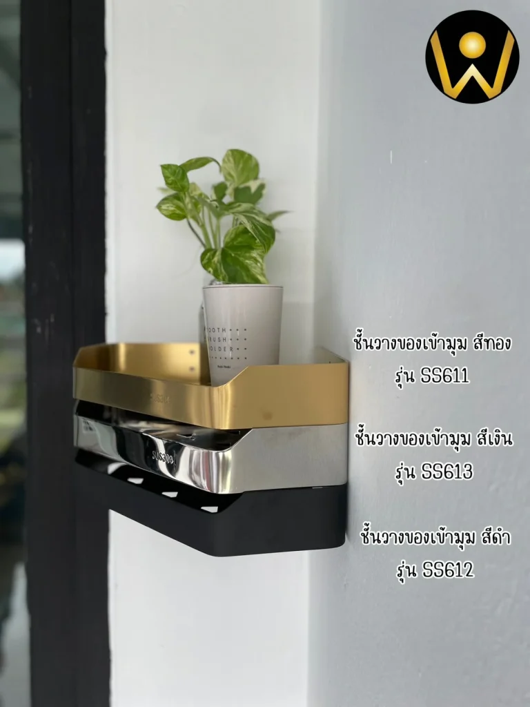 SS611, 612, 613 ชั้นวางเข้ามุมห้องน้ำติดผนัง สีทองด้าน ดำด้าน เงินเงา กว้าง 30 ซม. สแตนเลส 304