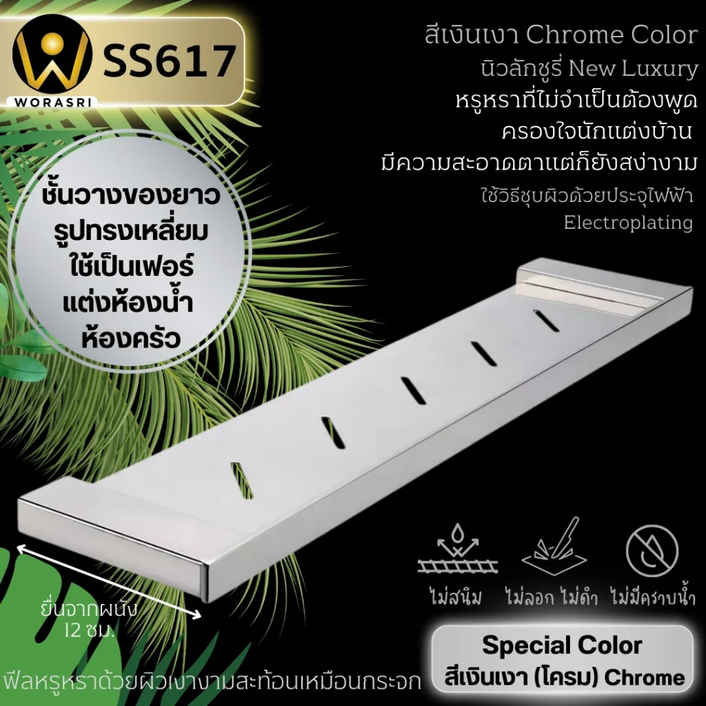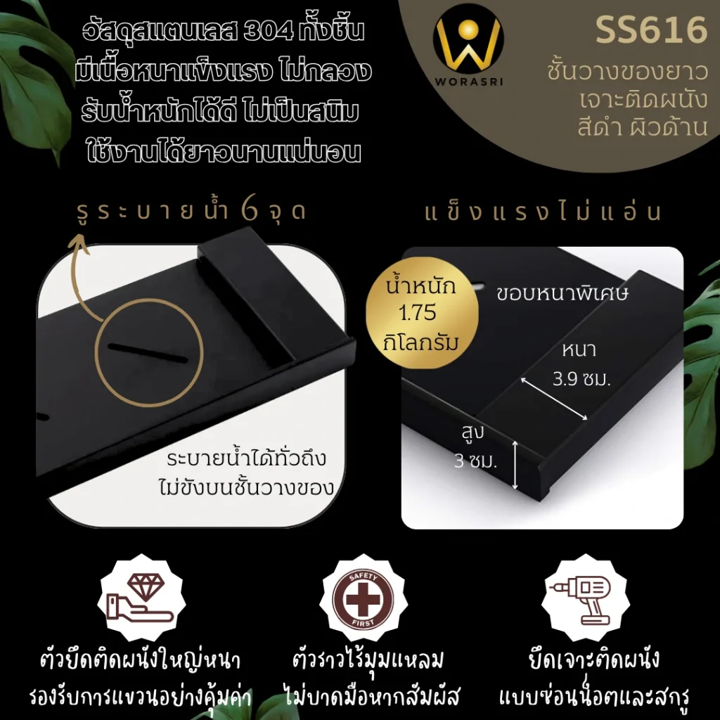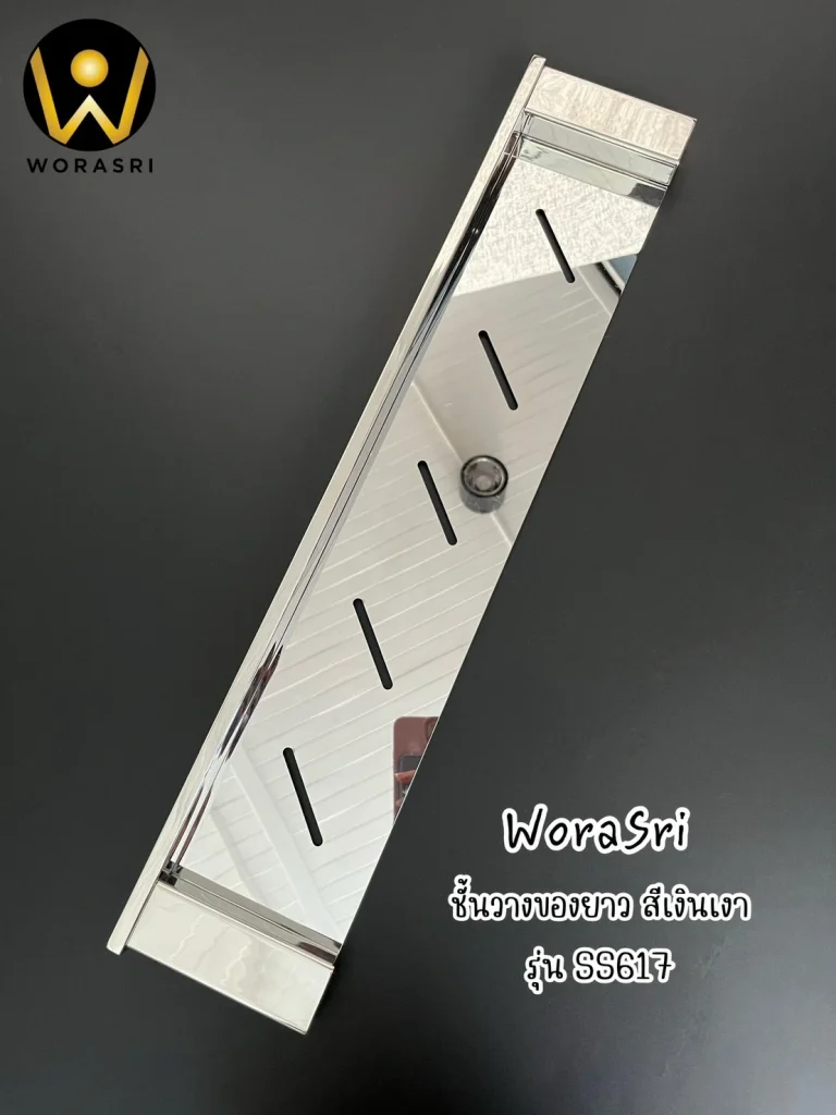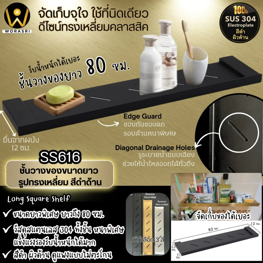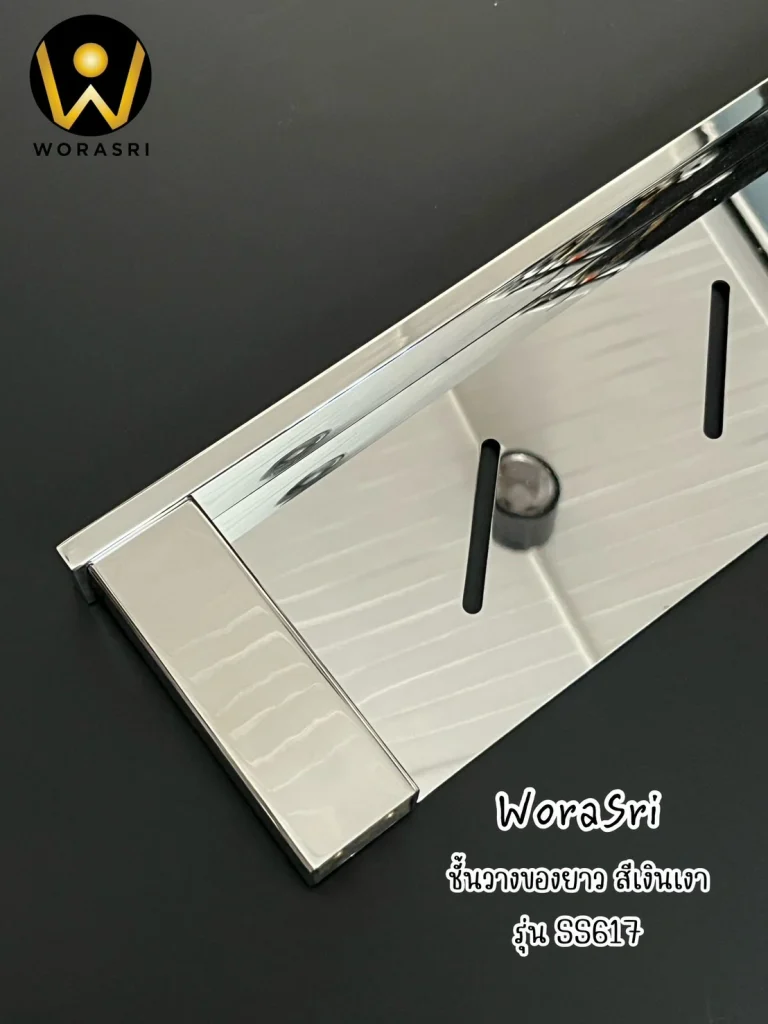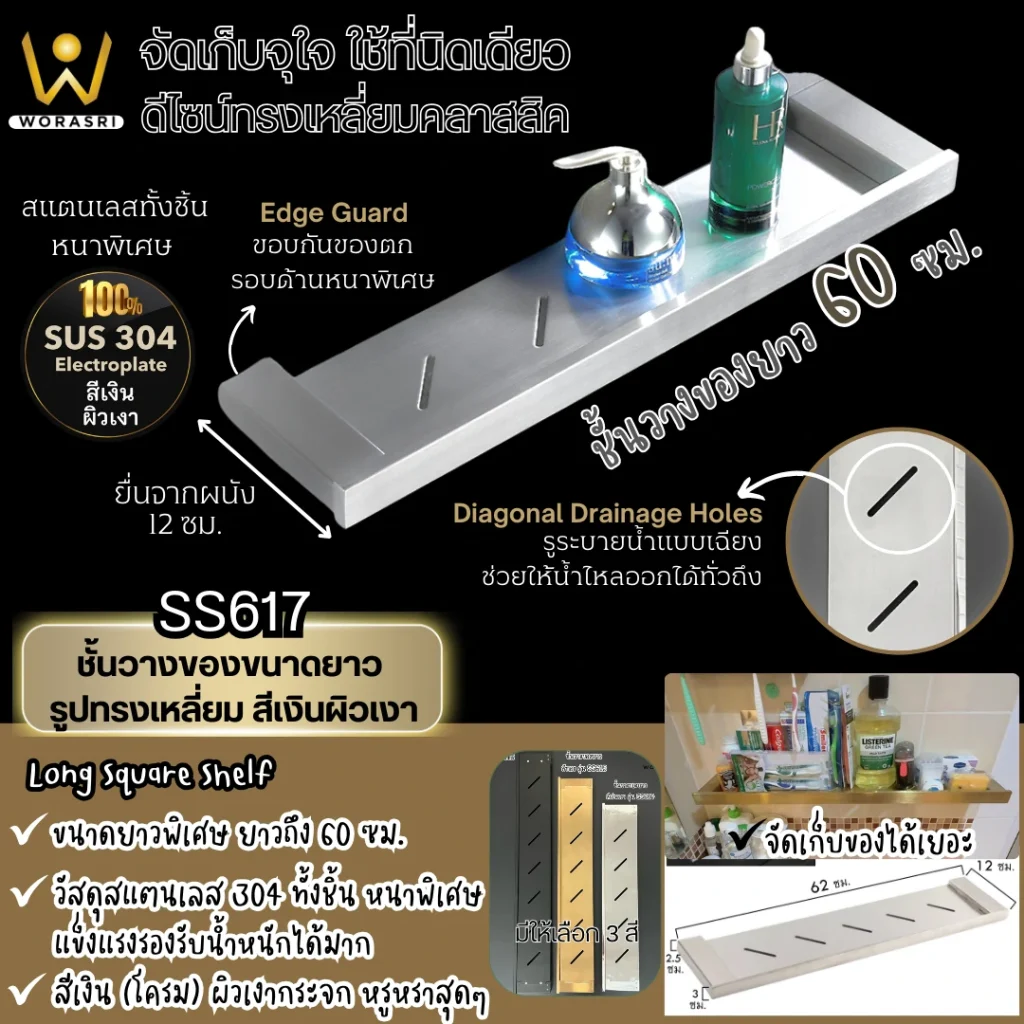จัดเก็บจุใจใช้ที่นิดเดียว เปลี่ยนผนังให้เป็นพื้นที่ใช้สอย ผนังห้องน้ำที่เคยโล่งๆ กลายเป็นพื้นที่เก็บของที่มีประโยชน์ด้วยชั้นวางของยาวติดผนัง หลายครั้งที่คุณต้องการเก็บของหลายๆ ชิ้นในห้องน้ำ แต่ไม่อยากให้ห้องดูอึดอัดเมื่อใส่ชั้นวางหลายๆ ชิ้น หรือเสียเวลาหาของใช้ที่เก็บไว้หลายที่ ชั้นวางของยาวช่วยให้จัดเก็บได้ทุกสิ่งที่ต้องการในที่เดียว ด้วยความยาวของชั้นวางที่สามารถวางของได้อย่างจุใจ ไม่ต้องเก็บหลายที่ให้ยุ่งยากและไม่ต้องรู้สึกว่าห้องน้ำดูคับแคบเกินอีกต่อไปแถมยังมีรูระบายน้ำขังไม่ทำให้สิ่งของเกิดเชื้อราหากวางทิ้งไว้นานๆ ติดตั้งง่ายไม่ซับซ้อน ผลิตจากสแตนเลส 304 เนื้อวัสดุหนาพิเศษมีความแข็งแรงทนทาน รองรับน้ำหนักได้มาก เคลือบสีด้วยกระบวนการ Electroplated ทำให้วัสดุมีความเงางาม ยึดติดแน่นหนา ทนทานต่อการสึกหรอและมีอายุการใช้งานยาวนาน