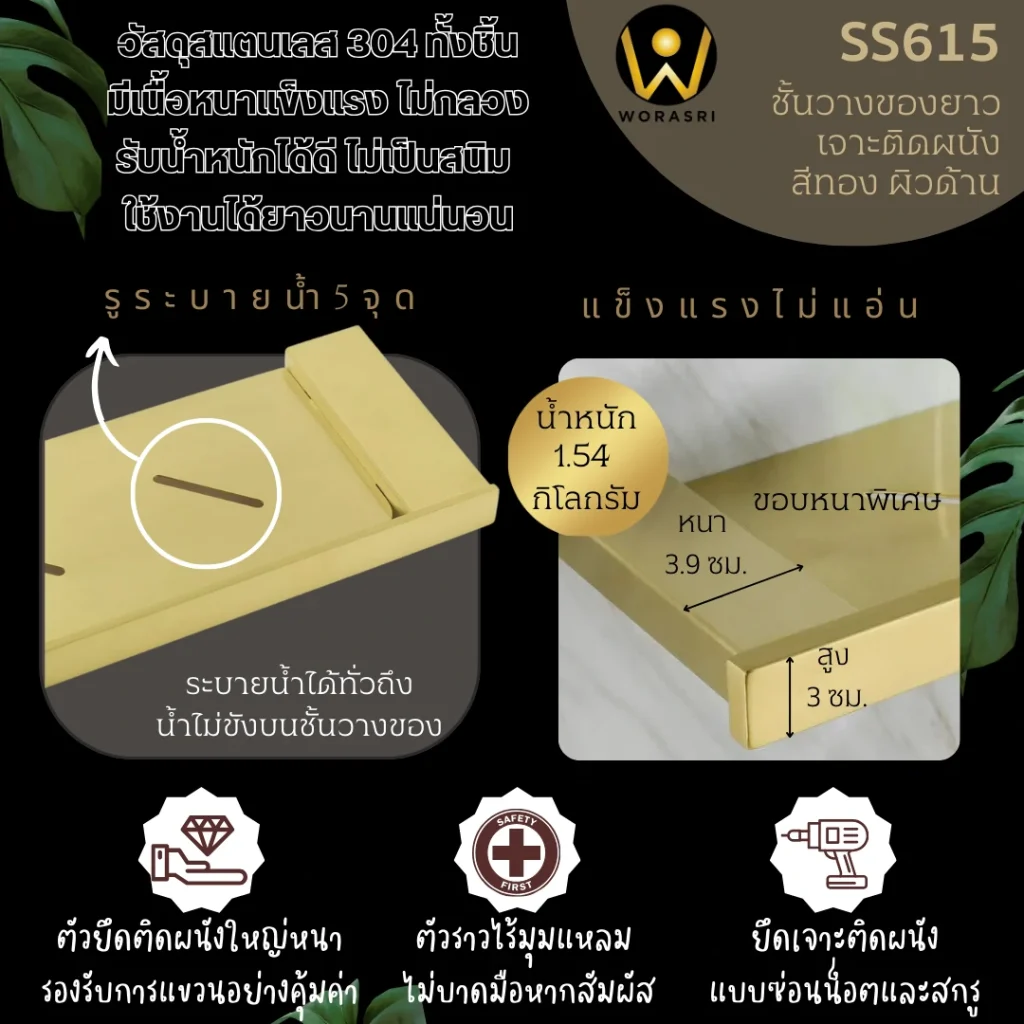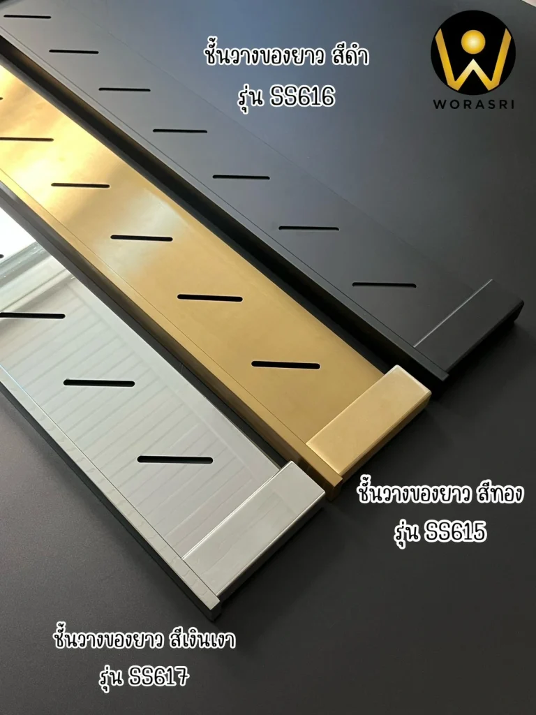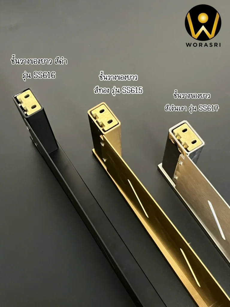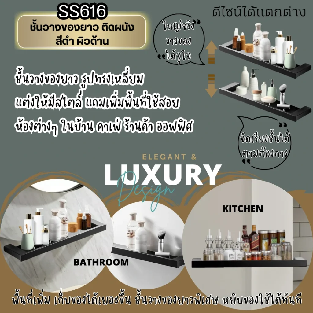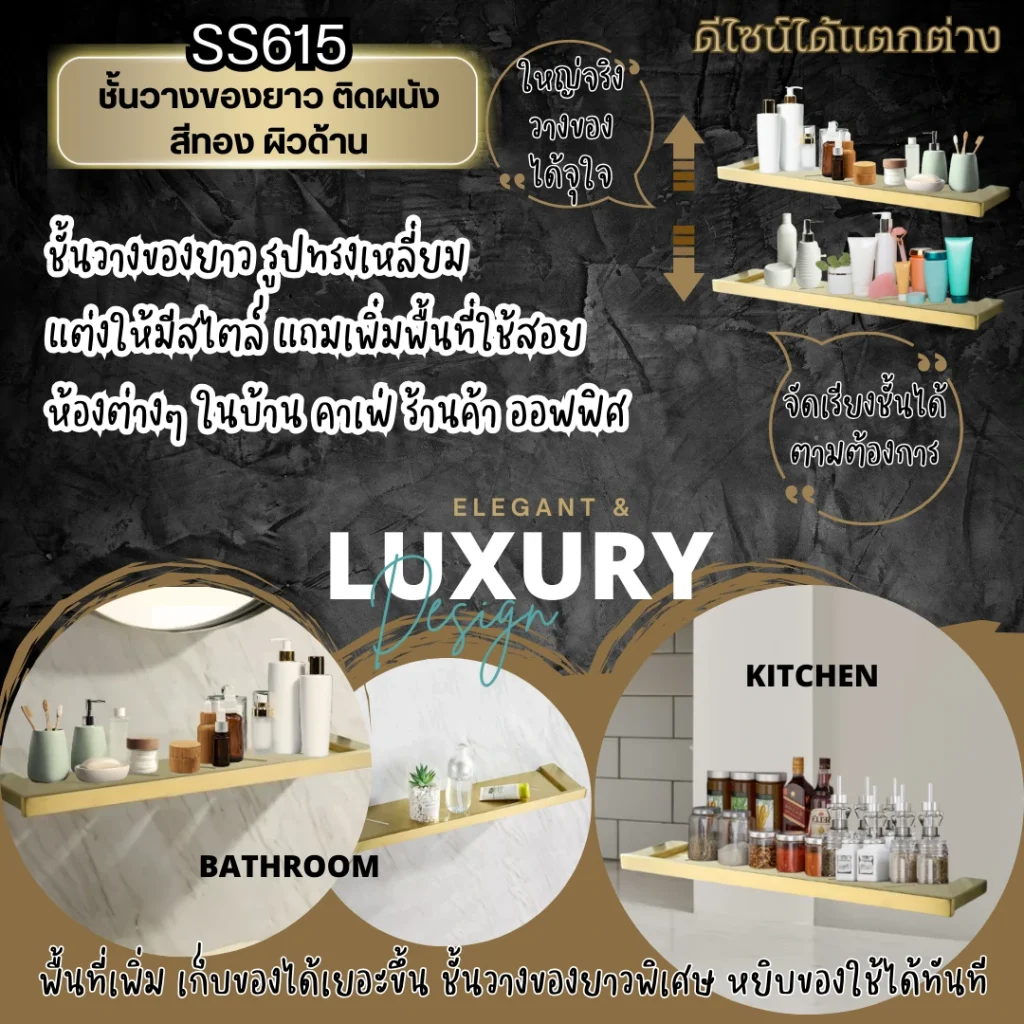 SS615, 616, 617 ชั้นวางของยาวห้องน้ำห้องครัวแขวนติดผนัง สีทองด้าน สีดำด้าน สีเงินเงา ยาว 60 – 80 ซม. สแตนเลส 304