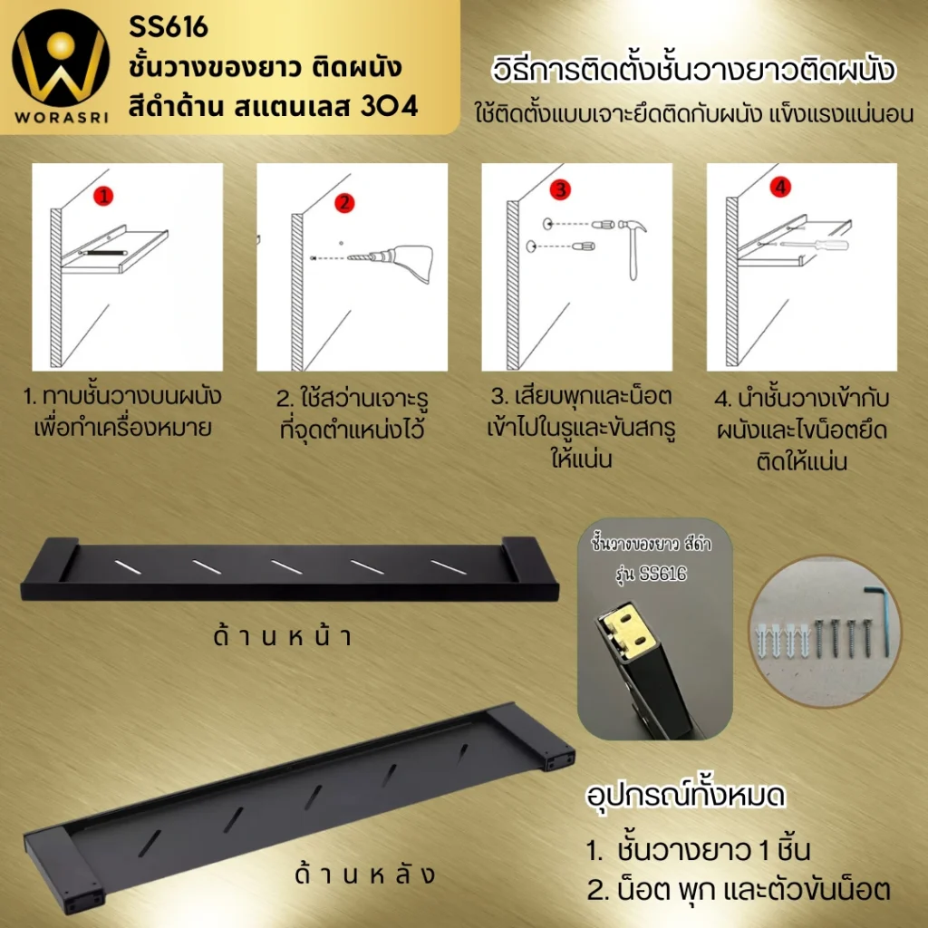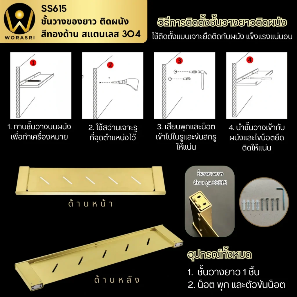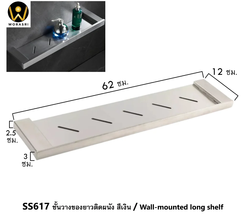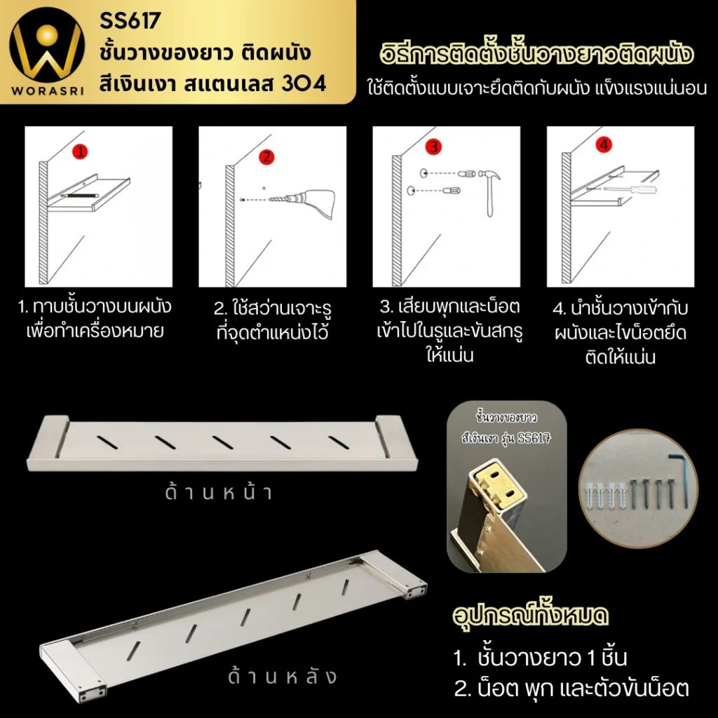 - ชั้นวางของยาวติดผนัง ทำจากสแตนเลสทั้งชิ้นหนาพิเศษ แข็งแรงและทนทาน รองรับน้ำหนักได้มาก รูปทรงคงที่แม้ใช้งานหนักจากการใช้งานในชีวิตประจำวัน