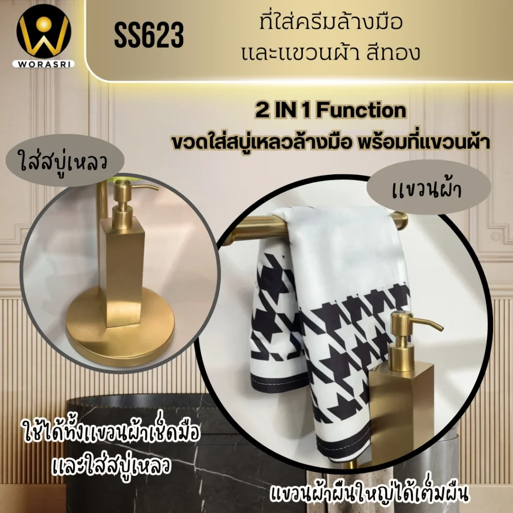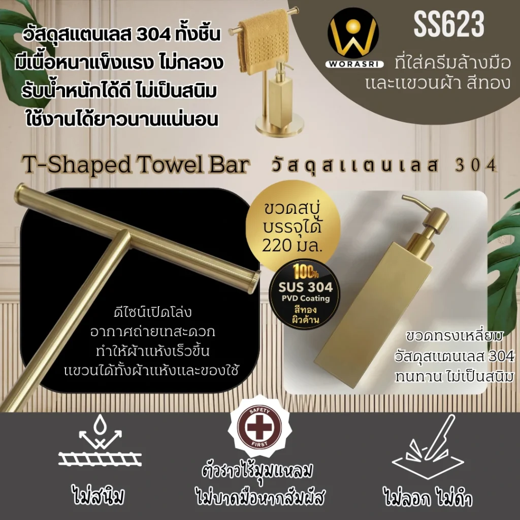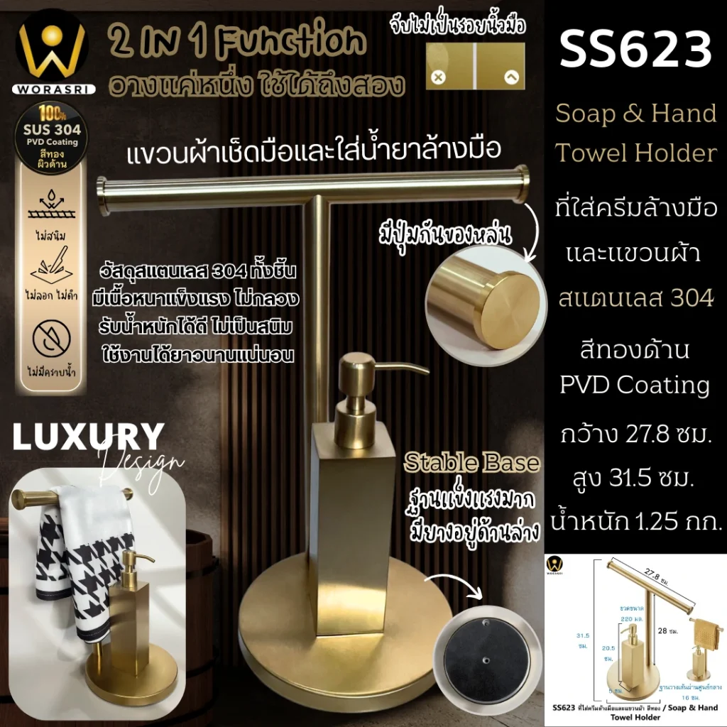 - ขวดใส่สบู่เหลวพร้อมที่แขวนผ้าเช็ดมือ ทำจากสแตนเลสทั้งชิ้น แข็งแรง รูปทรงคงที่แม้ใช้งานหนักจากการใช้งานในชีวิตประจำวัน มีความทนทานต่อการออกซิเดชั่น ทำให้ไม่ก่อให้เกิดสนิม