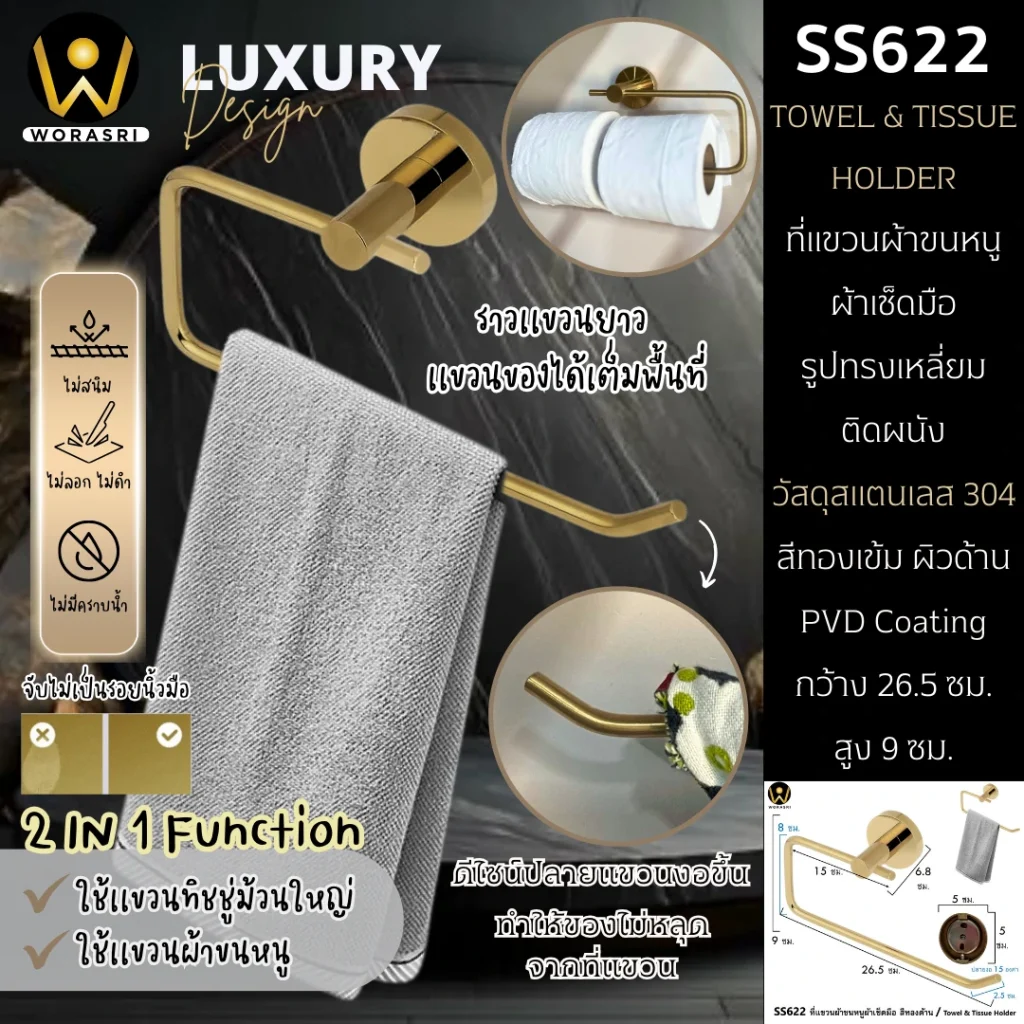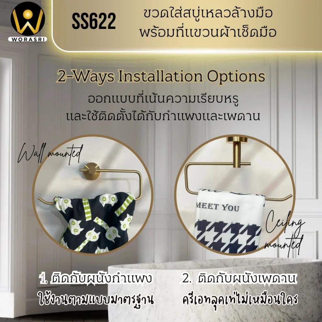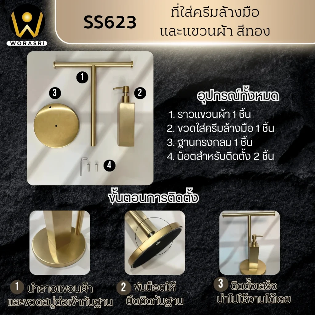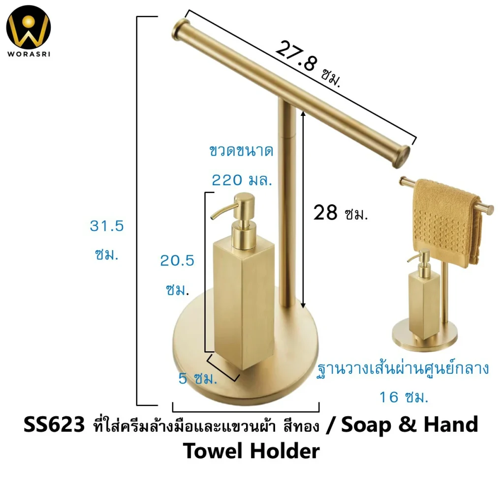 - ขวดใส่สบู่เหลวพร้อมที่แขวนผ้าเช็ดมือ ทำจากสแตนเลสทั้งชิ้น แข็งแรง รูปทรงคงที่แม้ใช้งานหนักจากการใช้งานในชีวิตประจำวัน มีความทนทานต่อการออกซิเดชั่น ทำให้ไม่ก่อให้เกิดสนิม