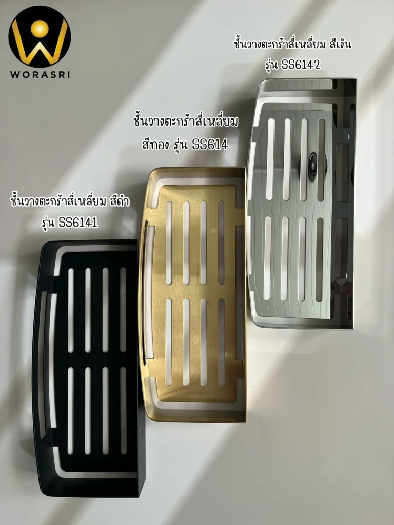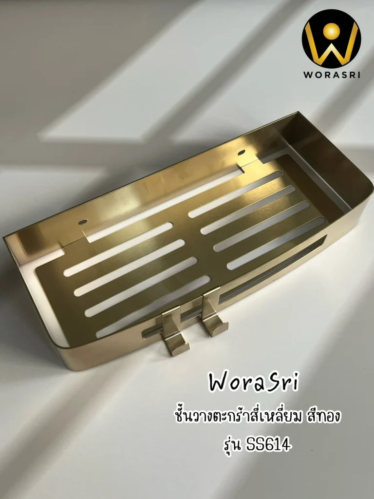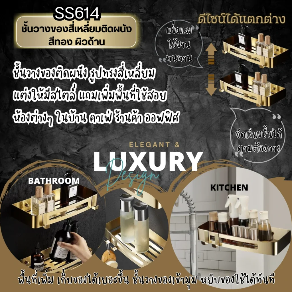 ชั้นวางตะแกรงเข้ามุมราวแขวนอุปกรณ์ครัว สีทอง Golden Kitchen Rack & Wall Storage พื้นที่เพิ่ม ก็เก็บของได้เยอะขึ้น ชั้นวางของเข้ามุม เพิ่มความสะดวกในการใช้ของที่ต้องการได้ในทันที มีดีไซน์ที่เลียนแบบรูปเพชรดูทันสมัยช่วยให้ห้องน้ำดูสวยแล้วยังสะดวกต่อการใช้งาน มีรูระบายน้ำขังไม่ทำให้สิ่งของเกิดเชื้อราหากวางทิ้งไว้นานๆ ติดตั้งง่ายไม่ซับซ้อน ผลิตจากสแตนเลส 304 เนื้อวัสดุหนาพิเศษมีความแข็งแรงทนทาน รองรับน้ำหนักได้มาก เคลือบสีด้วยกระบวนการ Electroplated ทำให้วัสดุมีความเงางาม ยึดติดแน่นหนา ทนทานต่อการสึกหรอและมีอายุการใช้งานยาวนาน
