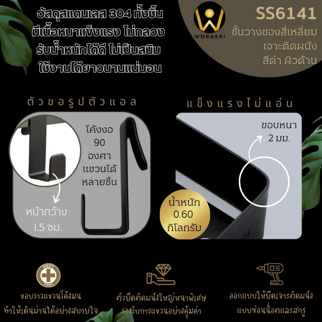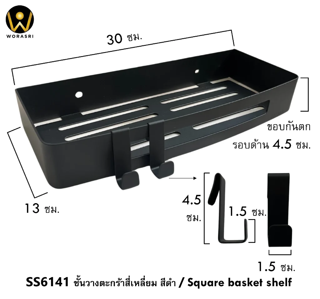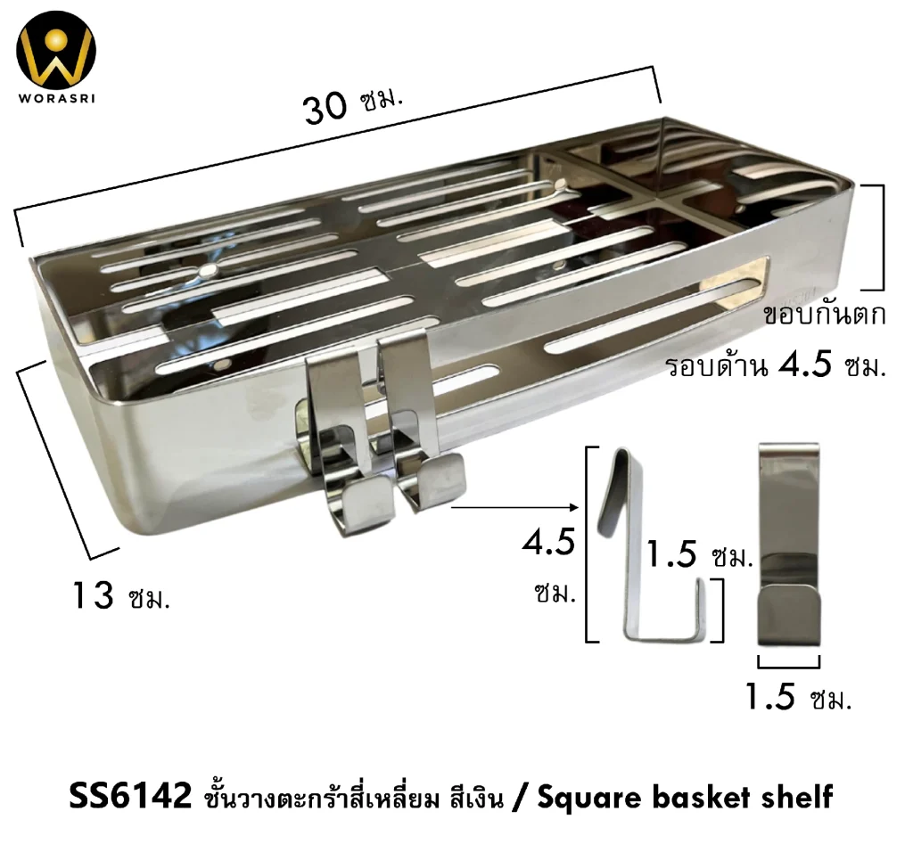 - ชั้นวางตะกร้าสี่เหลี่ยมติดผนัง ทำจากสแตนเลสทั้งชิ้นหนาพิเศษ 2 มม. แข็งแรงและทนทาน รองรับน้ำหนักได้มาก