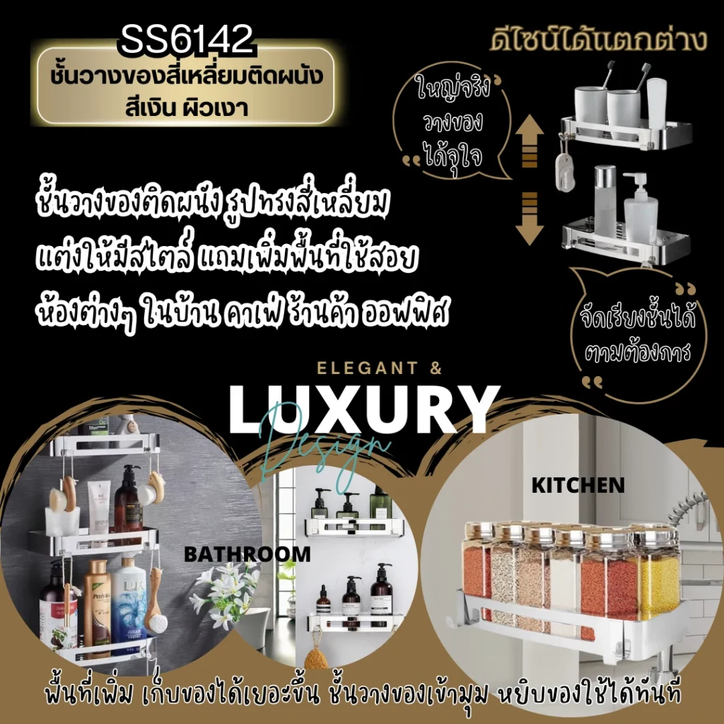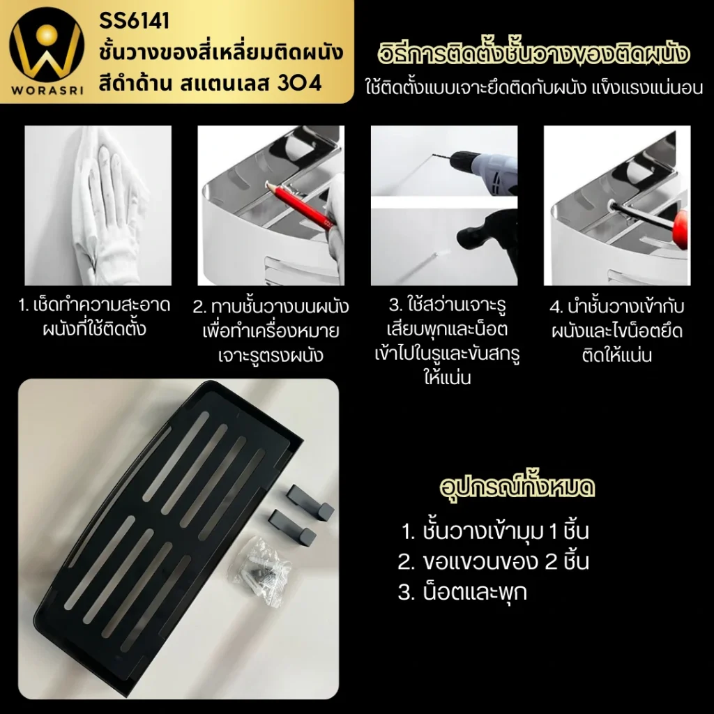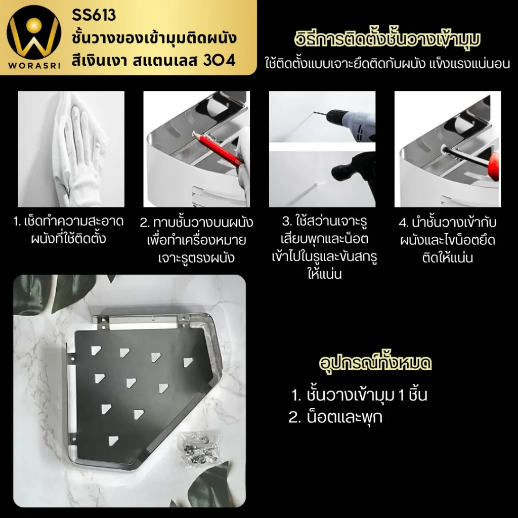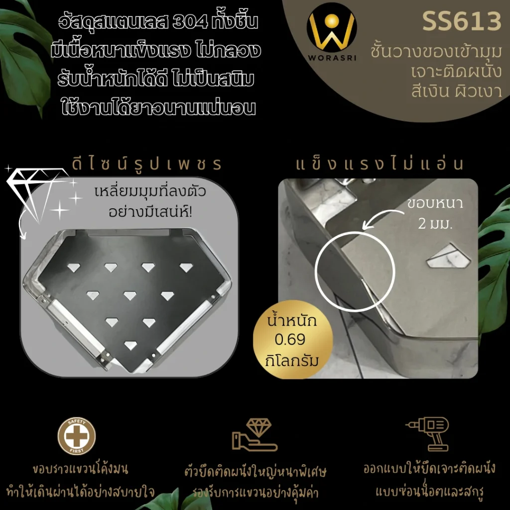 - ชั้นวางเข้ามุมติดผนัง ทำจากสแตนเลสทั้งชิ้นหนาพิเศษ 2 มม. แข็งแรงและทนทานกว่าชั้นวางทั่วไป รูปทรงคงที่แม้ใช้งานหนักจากการใช้งานในชีวิตประจำวัน