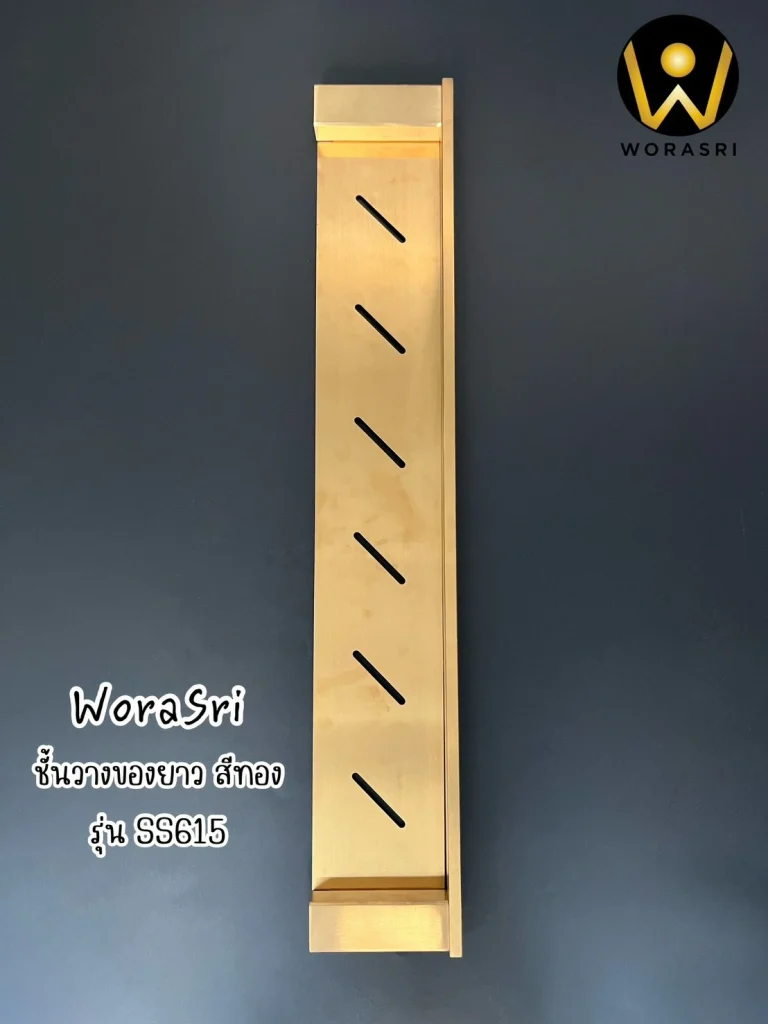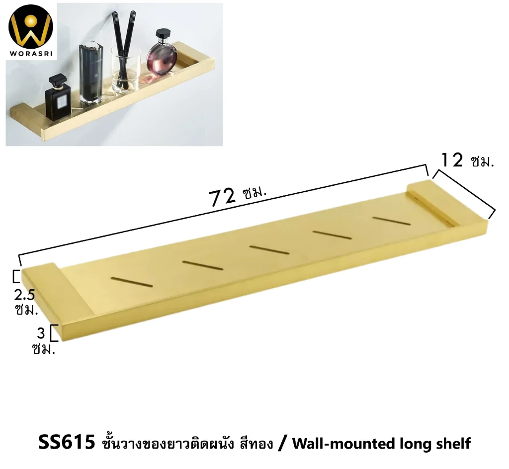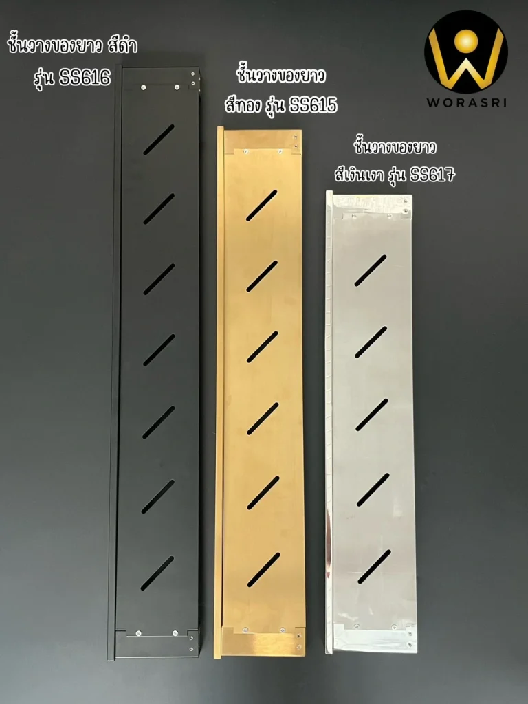 - รุ่น SS615 สีทองด้าน ขนาดยาว 72 ซม. x ลึก 12 ซม. x ขอบกันตกด้านข้างสูง 2.5 ซม. x ขอบกันตกด้านข้างหนา 3.9 ซม. x ขอบกันตกด้านหน้าสูง 3 ซม. x ขอบกันตกด้านหน้าหนา 1 ซม. น้ำหนัก 1.54 กิโลกรัม