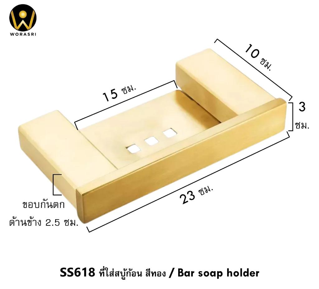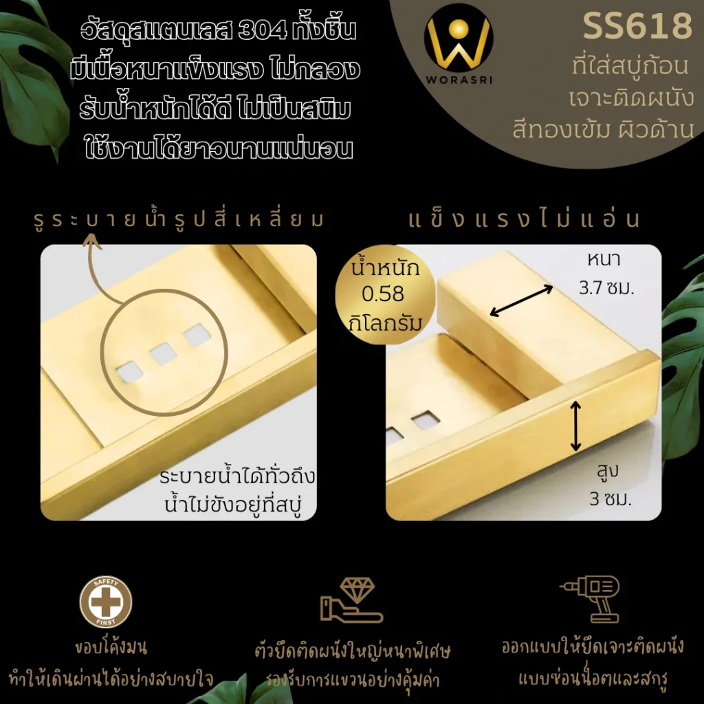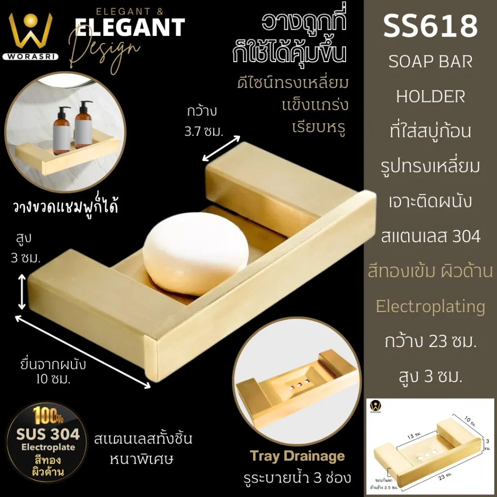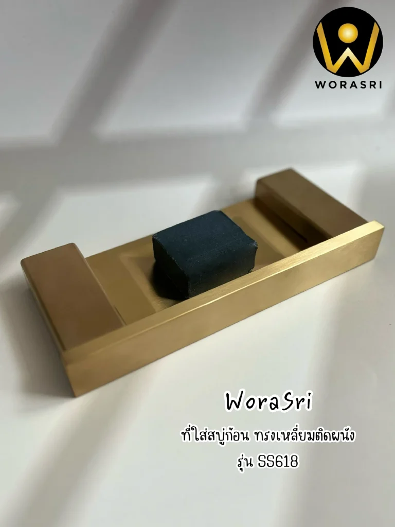 วางถูกที่ ก็ใช้ได้คุ้มขึ้น ที่ใส่สบู่ก้อนทรงเหลี่ยมสีทองด้าน ไอเทมที่ช่วยยกระดับห้องน้ำของคุณให้หรูหรายิ่งขึ้น การออกแบบที่เน้นความสะดวกในการใช้งาน พื้นที่วางสบู่มีขอบกันตกรอบด้าน เพื่อป้องกันสบู่ลื่นหล่น มีร่องตื้นสี่เหลี่ยมพร้อมช่องระบายน้ำขนาดเล็ก 3 ช่องที่ช่วยให้สบู่แห้งเร็วลดการเกิดน้ำขังและการละลายของสบู่โดยไม่จำเป็น ผลิตจากสแตนเลส 304 เนื้อวัสดุหนาพิเศษมีความแข็งแรงทนทาน รองรับน้ำหนักได้มาก เคลือบสีด้วยกระบวนการ Electroplated ทำให้วัสดุมีความเงางาม ยึดติดแน่นหนา ทนทานต่อการสึกหรอและมีอายุการใช้งานยาวนาน