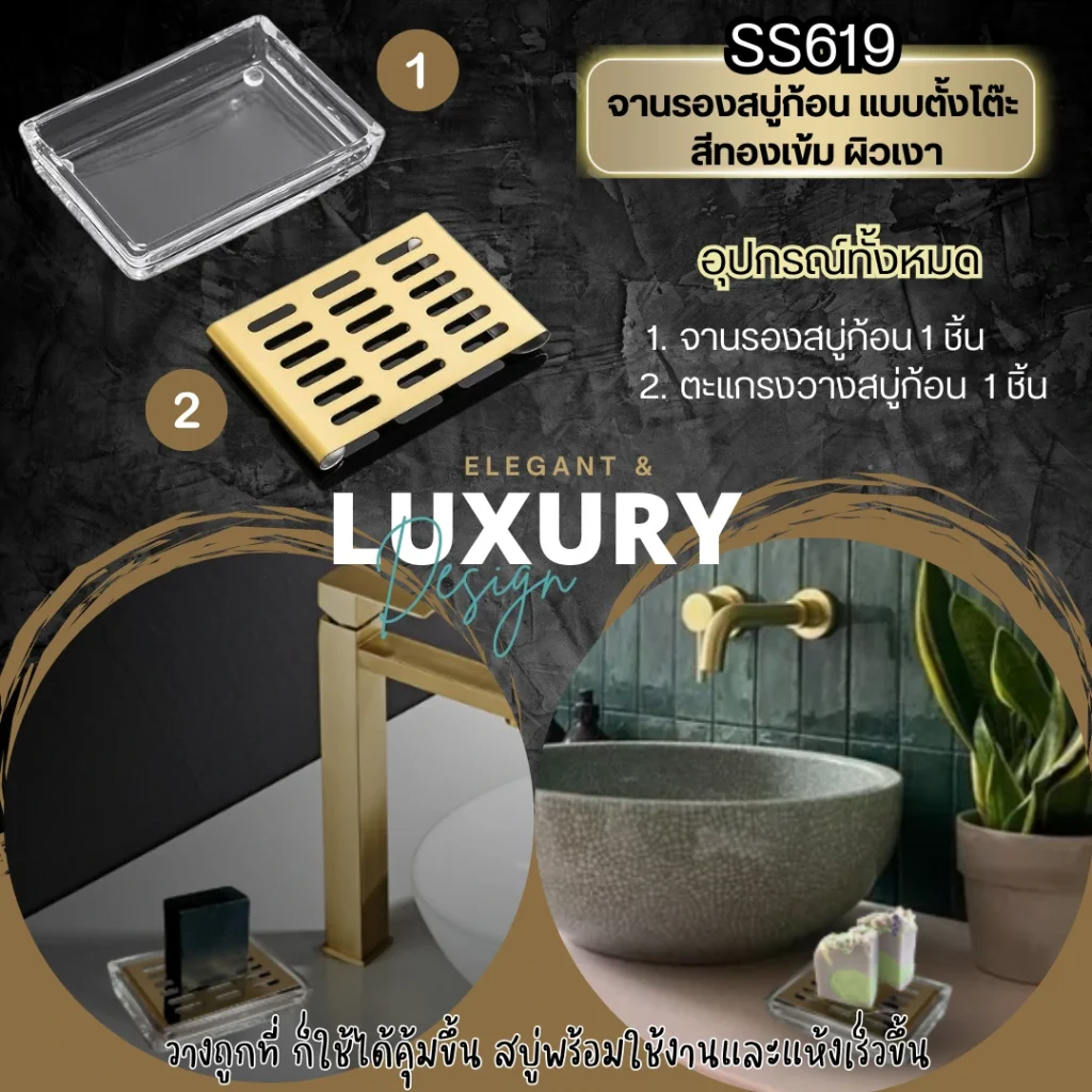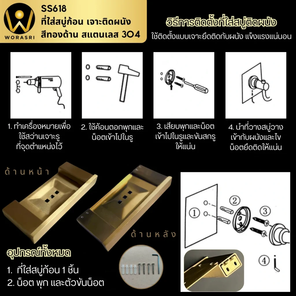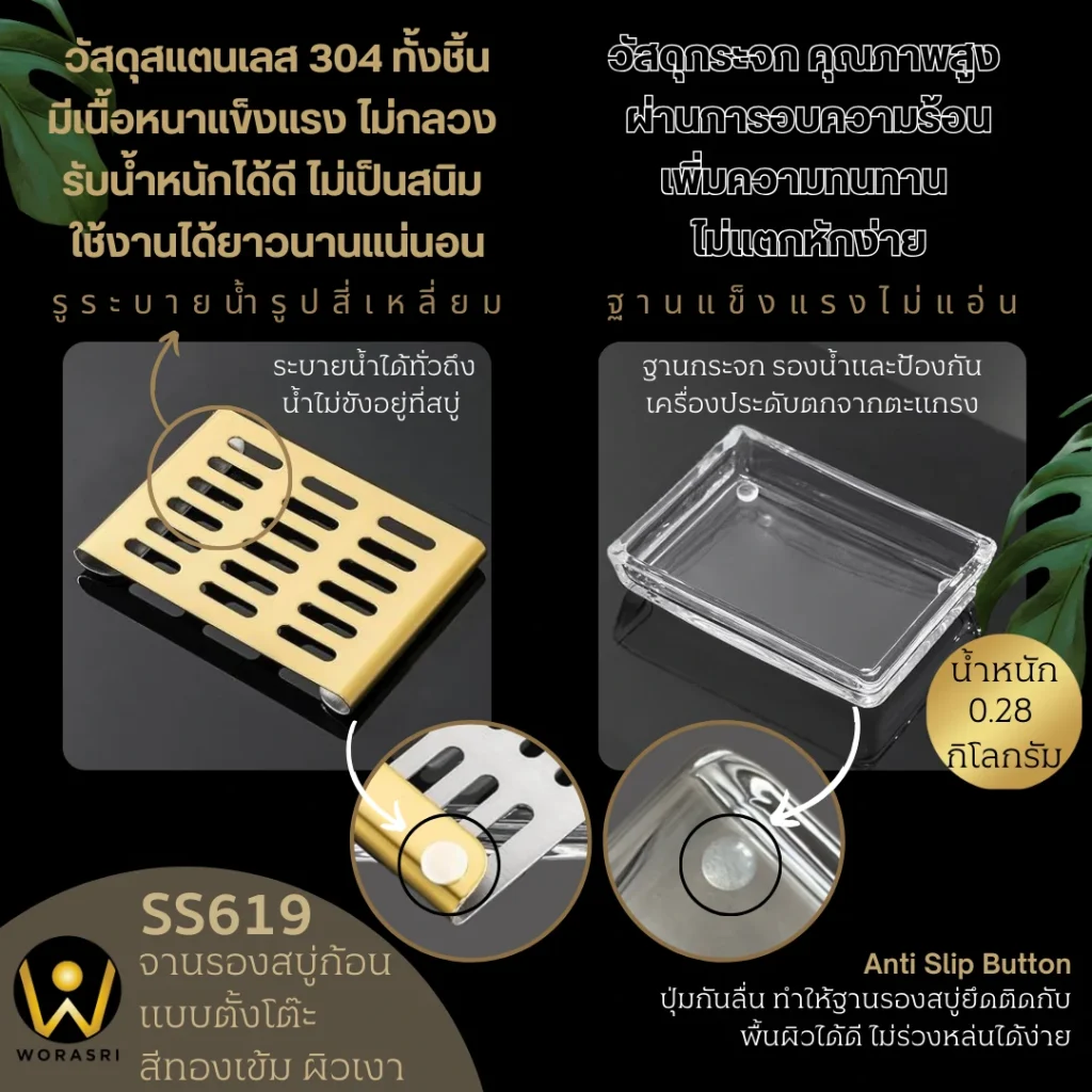 วางถูกที่ ก็ใช้ได้คุ้มขึ้น ที่ใส่สบู่ก้อนทรงเหลี่ยมสีทองด้าน ไอเทมที่ช่วยยกระดับห้องน้ำของคุณให้หรูหรายิ่งขึ้น การออกแบบที่เน้นความสะดวกในการใช้งาน พื้นที่วางสบู่มีขอบกันตกรอบด้าน เพื่อป้องกันสบู่ลื่นหล่น มีร่องตื้นสี่เหลี่ยมพร้อมช่องระบายน้ำขนาดเล็ก 3 ช่องที่ช่วยให้สบู่แห้งเร็วลดการเกิดน้ำขังและการละลายของสบู่โดยไม่จำเป็น ผลิตจากสแตนเลส 304 เนื้อวัสดุหนาพิเศษมีความแข็งแรงทนทาน รองรับน้ำหนักได้มาก เคลือบสีด้วยกระบวนการ Electroplated ทำให้วัสดุมีความเงางาม ยึดติดแน่นหนา ทนทานต่อการสึกหรอและมีอายุการใช้งานยาวนาน