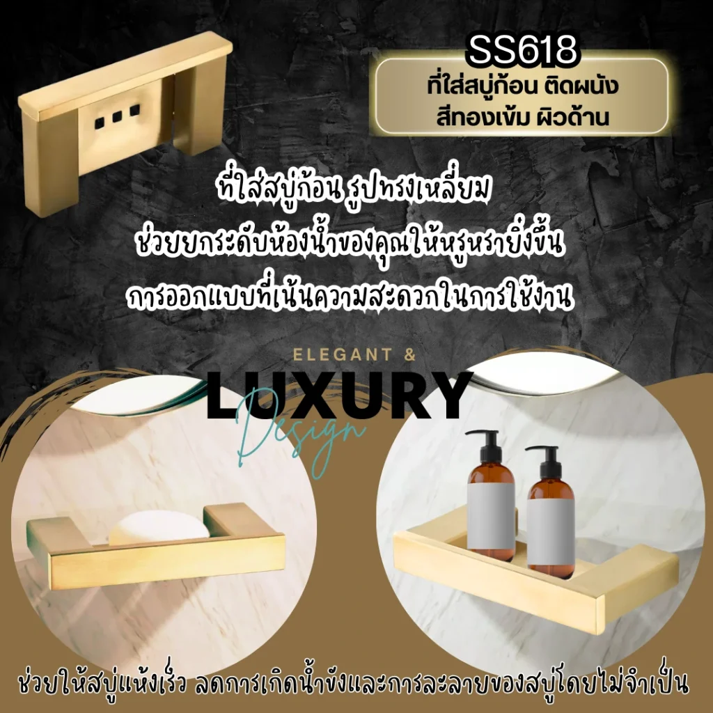 SS618 ที่วางใส่สบู่ก้อนทรงเหลี่ยมติดผนัง สแตนเลส 304 สีทองด้าน