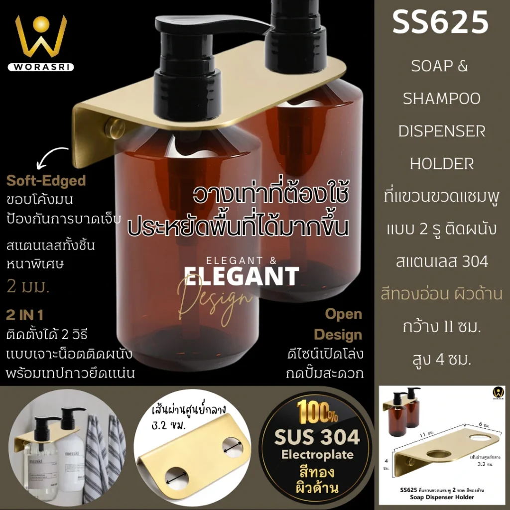 SS625 ที่แขวนขวดแชมพู สบู่เหลว สบู่ล้างมือติดผนัง แบบ 2 ขวด สแตนเลส 304 สีทองด้าน (Brushed Gold Soap Dispenser Holder)