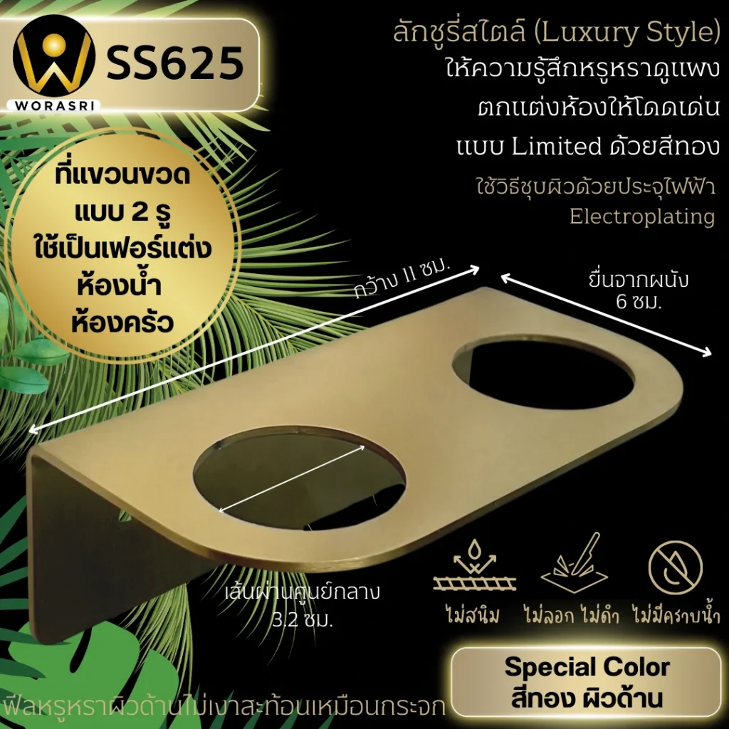 – รุ่น SS625 ขนาดหน้ากว้าง 11 ซม. x ลึก 6 ซม. x สูง 4 ซม. x เส้นผ่านศูนย์กลางที่แขวนขวด 3.2 ซม. หนา 2 มม. จำนวน 2 รู น้ำหนัก 130 กรัม