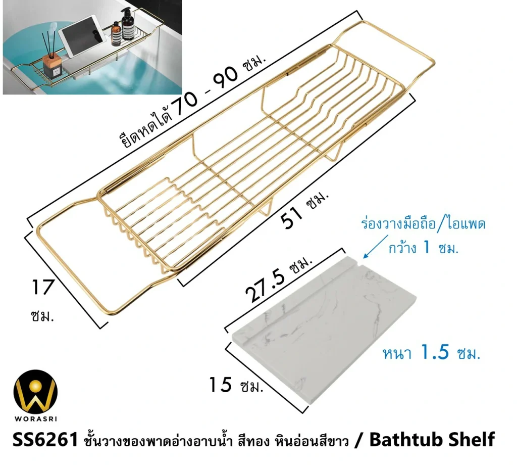 - ขนาดชั้นวางอ่างอาบน้ำกว้าง 17 ซม. x สูง 6 ซม. x ยืดได้ถึง 70 ถึง 90 ซม.