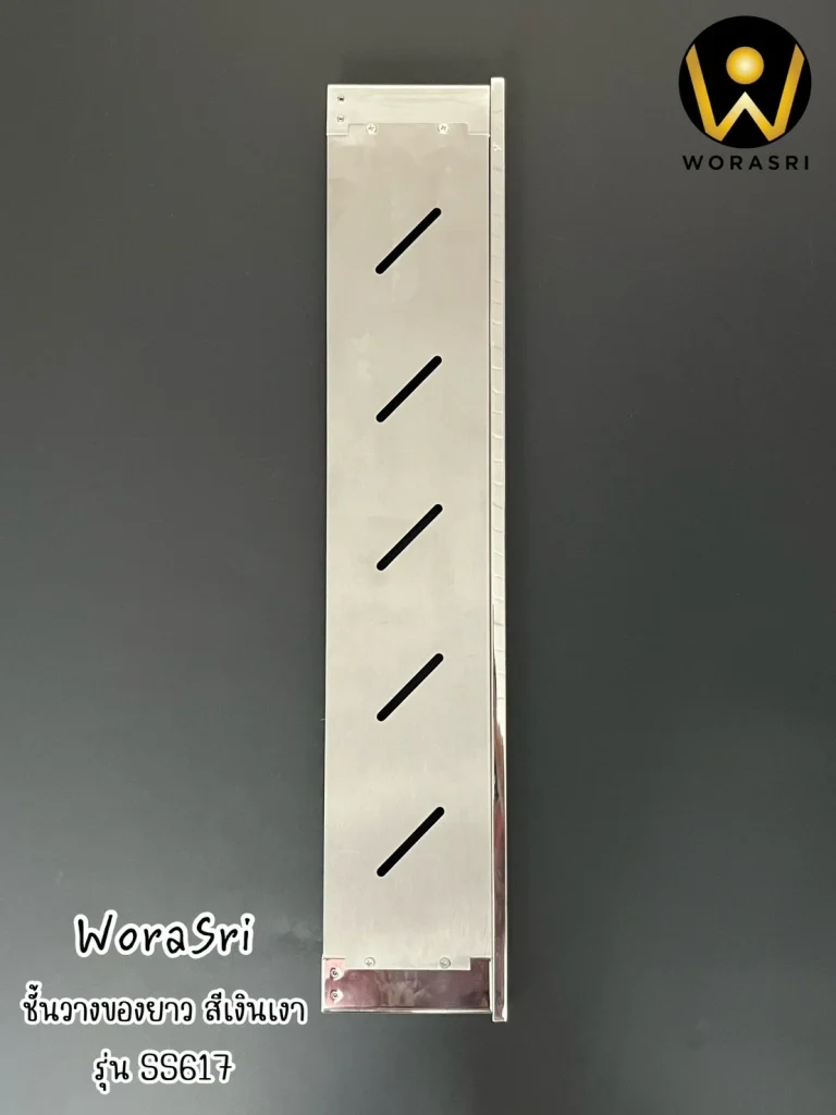 - รุ่น SS615 สีเงินเงา ขนาดยาว 62 ซม. x ลึก 12 ซม. x ขอบกันตกด้านข้างสูง 2.5 ซม. x ขอบกันตกด้านข้างหนา 3.9 ซม. x ขอบกันตกด้านหน้าสูง 3 ซม. x ขอบกันตกด้านหน้าหนา 1 ซม. น้ำหนัก 1.35 กิโลกรัม