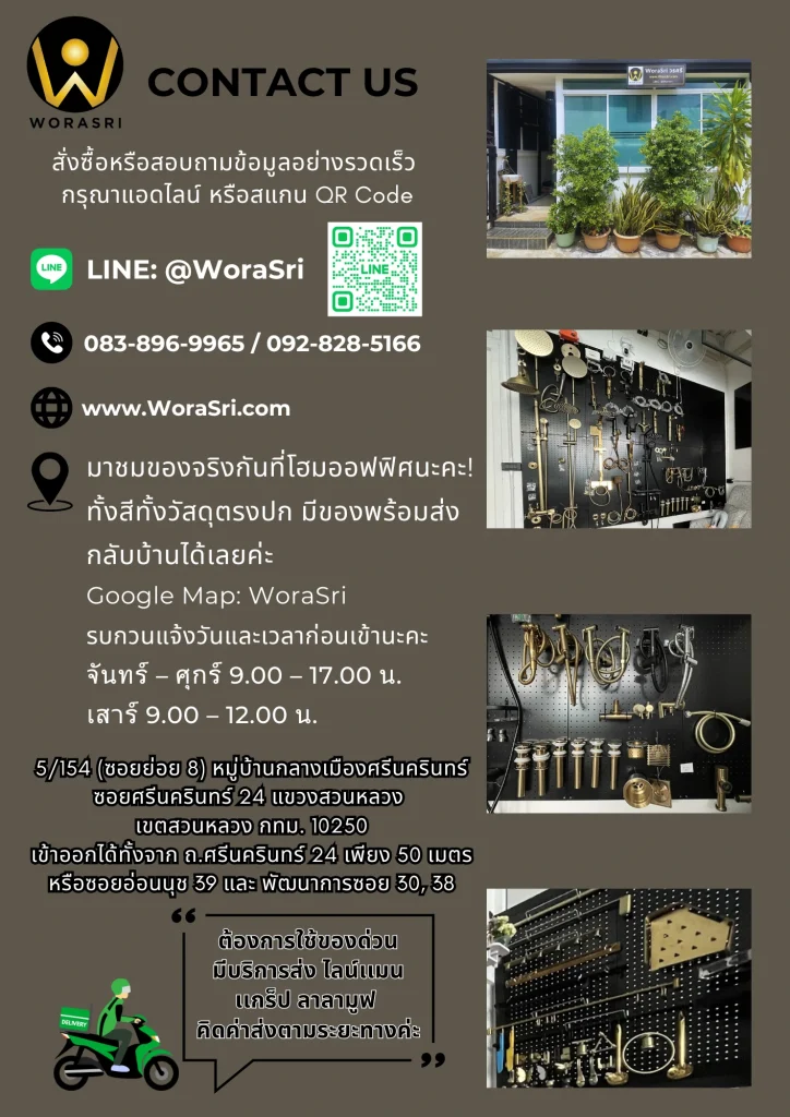 WoraSri (วรศรี) โรงงานผู้ผลิตและจำหน่ายก๊อกน้ำทองเหลืองแท้ ของตกแต่งบ้าน ขายปลีก – ส่ง ก๊อกอ่างล้างหน้า ก๊อกอ่างล้างมือ ก๊อกอ่างล้างจาน ก๊อกตกแต่งสวน ก๊อกบอลสนาม ก๊อกติดผนัง ก๊อกซิงค์ ก๊อกขึ้นจากเคาน์เตอร์ ก๊อกห้องครัว ก๊อกและอุปกรณ์ห้องน้ำ ชุดเรนชาวเวอร์ ฝักบัว สายฉีดชำระ ชั้นวางของอเนกประสงค์ ฮุคตะขอราวแขวน มือจับประตูทองเหลืองช้าง