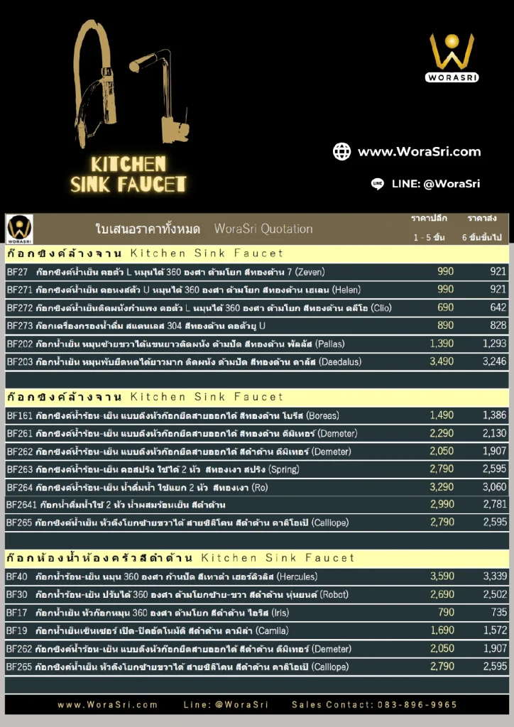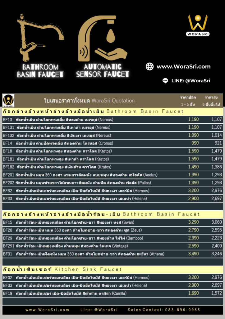 ใบเสนอราคาสินค้าก๊อกน้ำและอุปกรณ์ สินค้าที่เป็นสีทอง สีที่หายากและทำยาก มีที่นี่ครบไม่ว่าจะเป็น ก๊อกห้องน้ำ ก๊อกห้องครัว ชุดเรนชาวเวอร์ สายฉีดชำระ ฝักบัว อุปกรณ์ห้องน้ำต่าง ๆ สต็อปวาลว์ ชุดท่อน้ำทิ้ง ตะแกรงระบายน้ำ สะดืออ่าง ขอแขวนของ ราวแขวนผ้า ที่ใส่ทิชชู่ ของใช้ในครัว