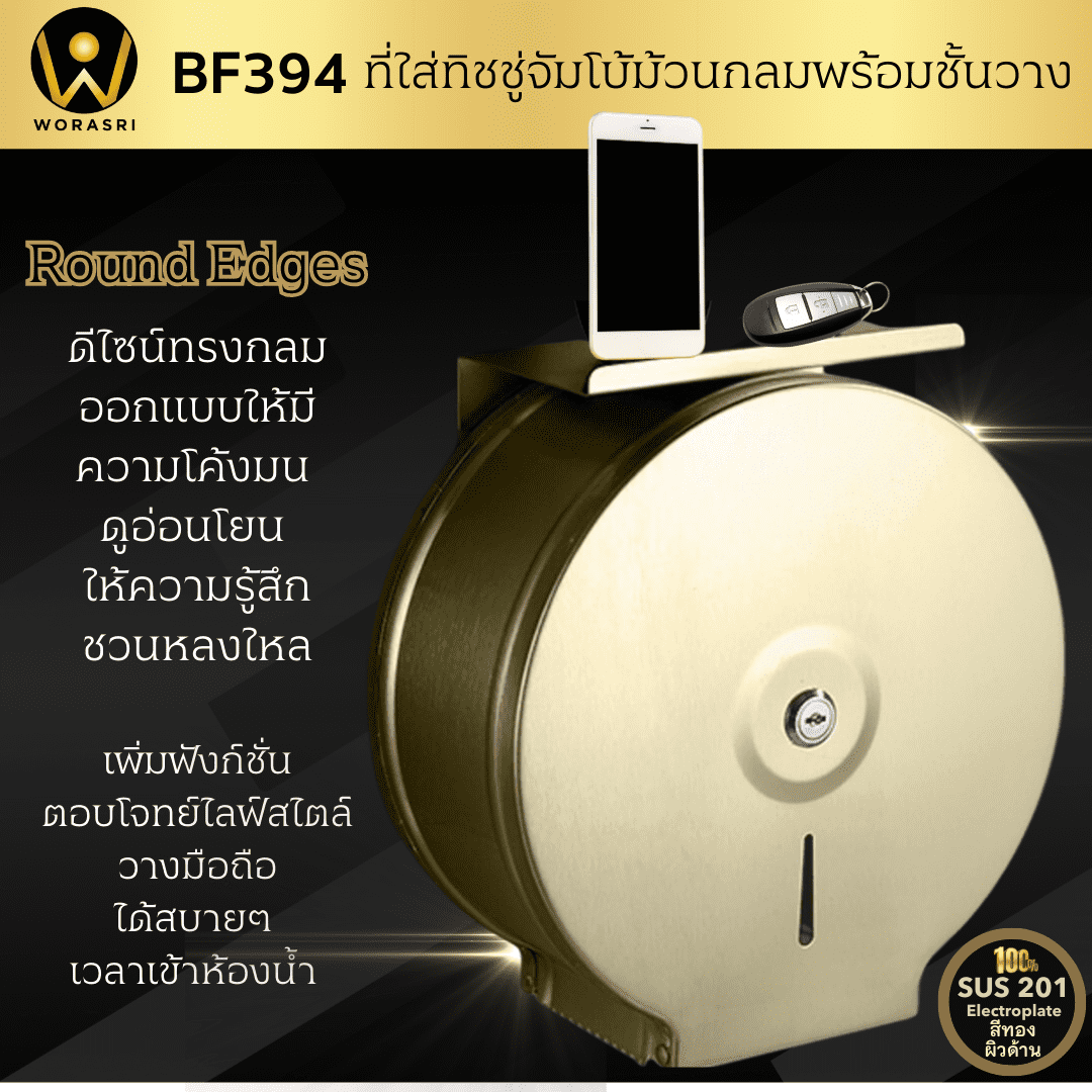 จะใช้ในสถานที่สาธารณะ ไม่ว่าจะเป็น โรงแรม ห้างสรรพสินค้า โรงเรียน โรงพยาบาล สนามกีฬา คาเฟ่ หรือบ้านที่มีผู้อาศัยเยอะก็เลือกใช้ตัวนี้ ตอบโจทย์เรื่องไม่ต้องเปลี่ยนทิชชู่บ่อยๆ ค่ะ และยังมีดีไซน์ที่สวย และสีทองที่ยกระดับให้ดูหรูหราขึ้น สวยตะโกนแบบฟีลผู้ดีเลยค่ะ มีให้เลือก 2 รุ่นนะคะ รุ่น BF394 สำหรับทิชชู่แบบม้วน และ BF395 สำหรับกระดาษแบบแผ่นพับค่ะ