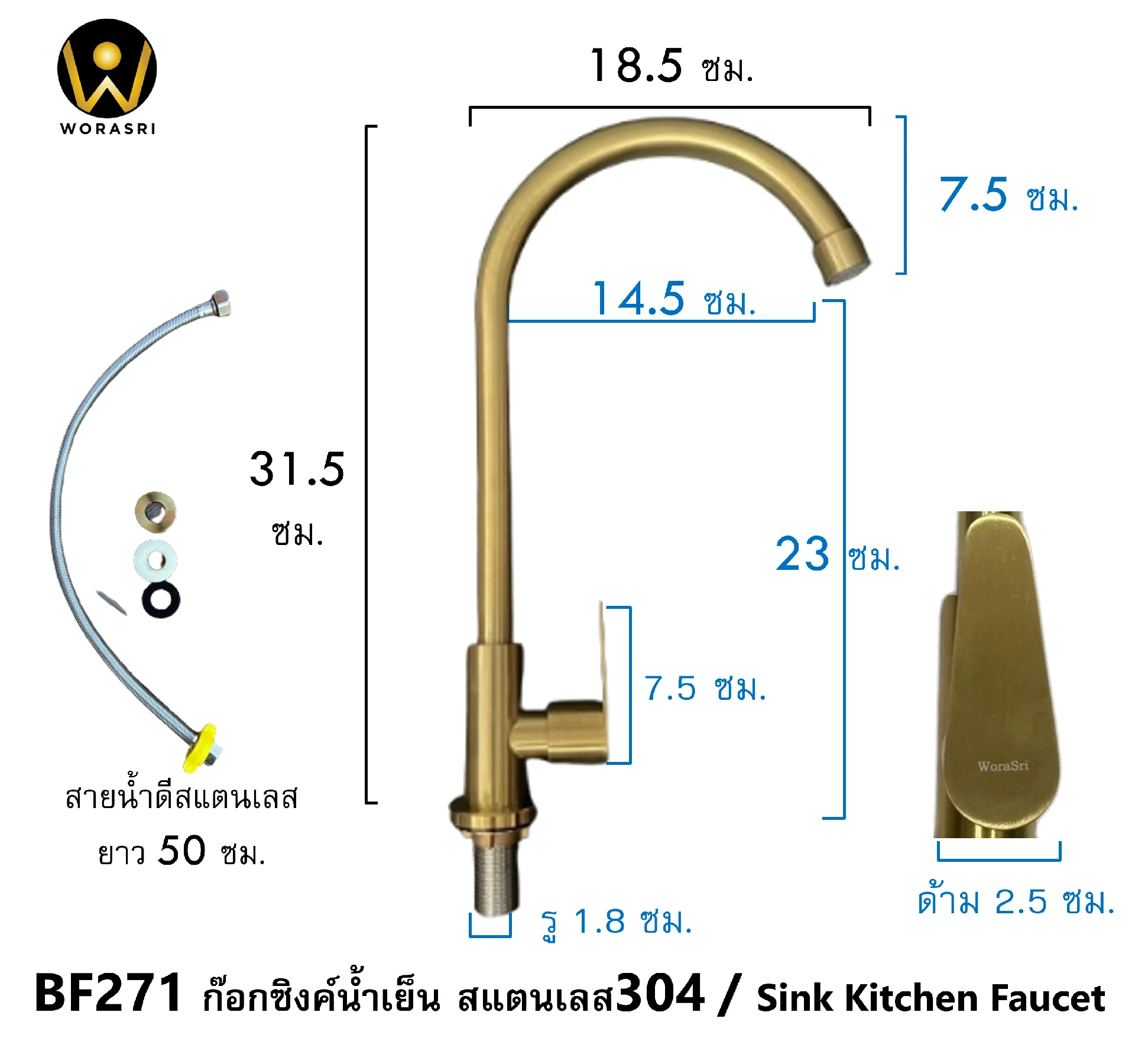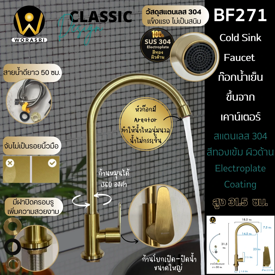 ก๊อกซิงค์ตัวUน้ำเย็นห้องครัวสีทอง สแตนเลส 304 BF271 Golden Cold Sink Faucet
