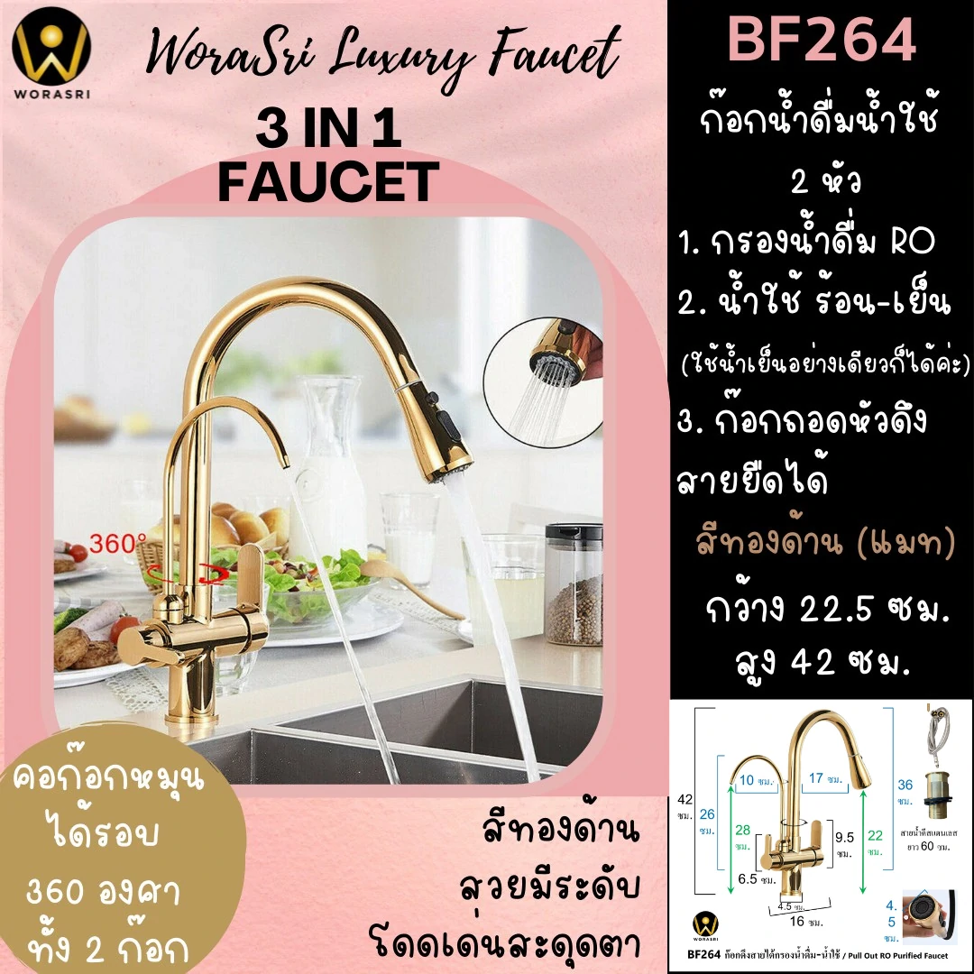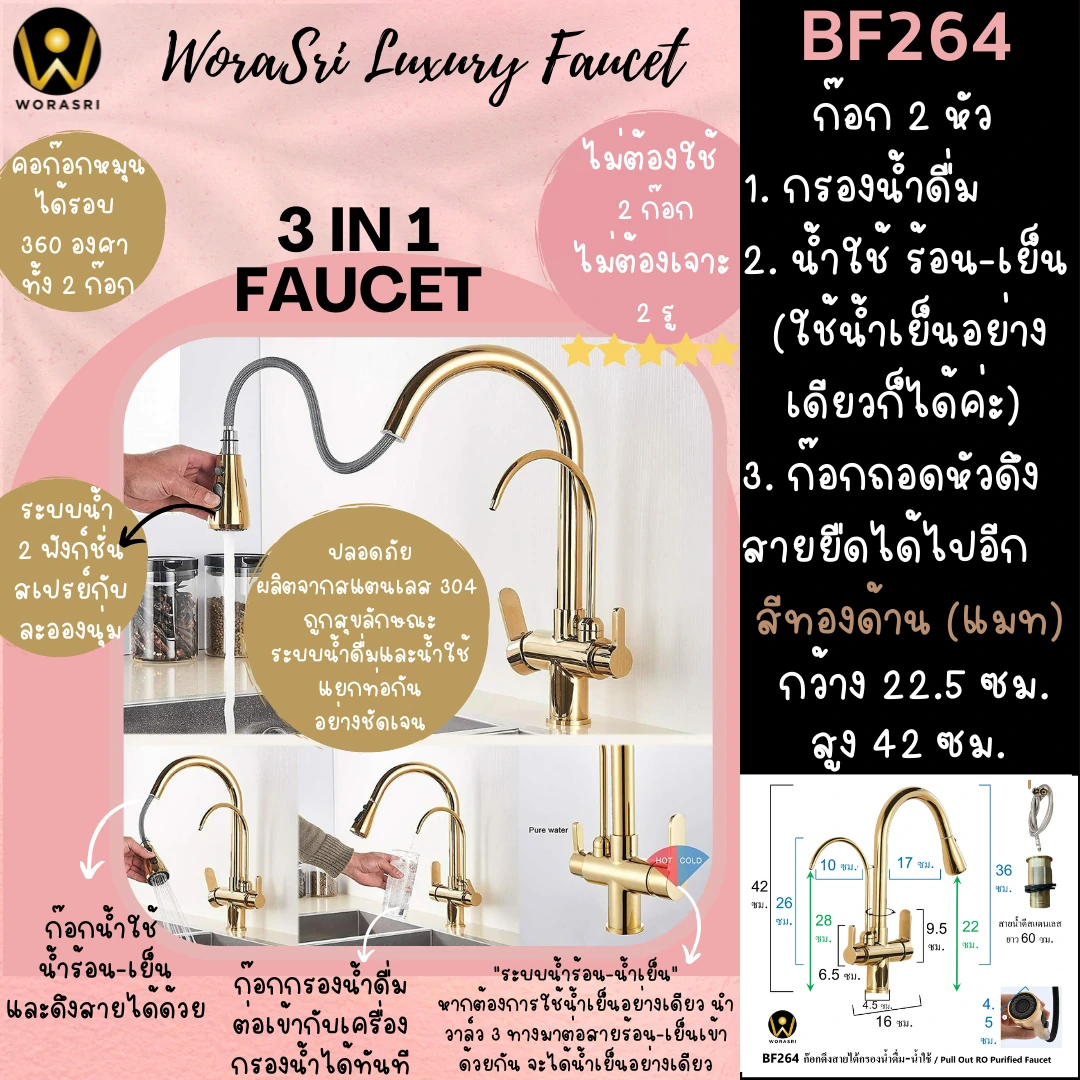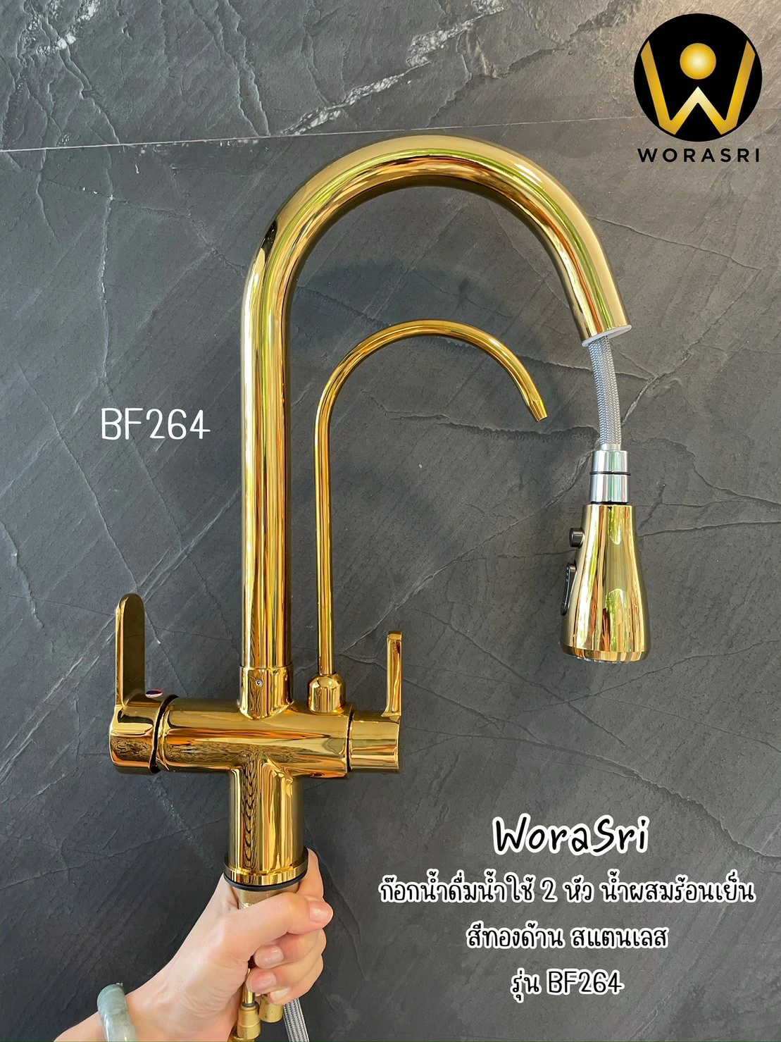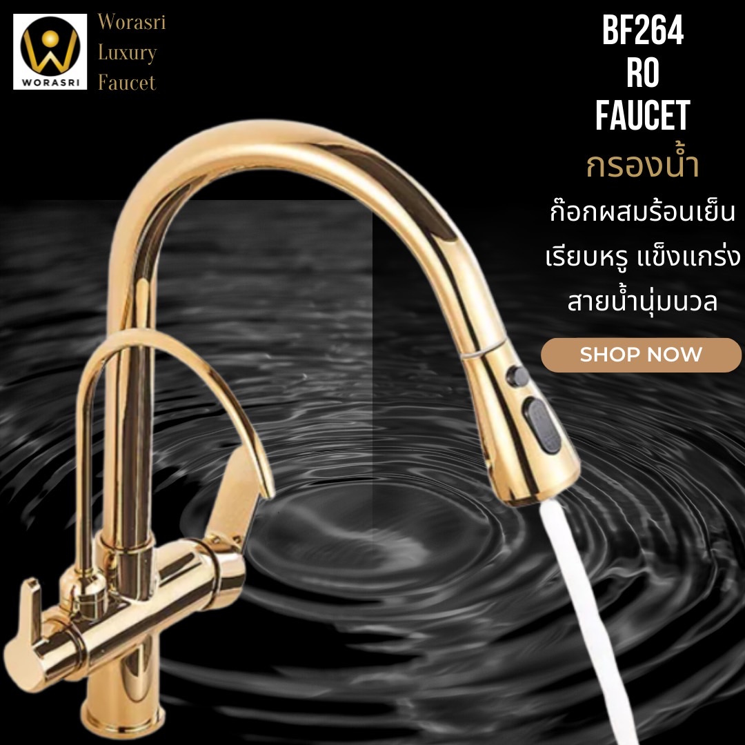 ก๊อกกรองน้ำดื่มดึงสาย2หัวสีทองเงา BF264 Pull Out with Purified Faucet