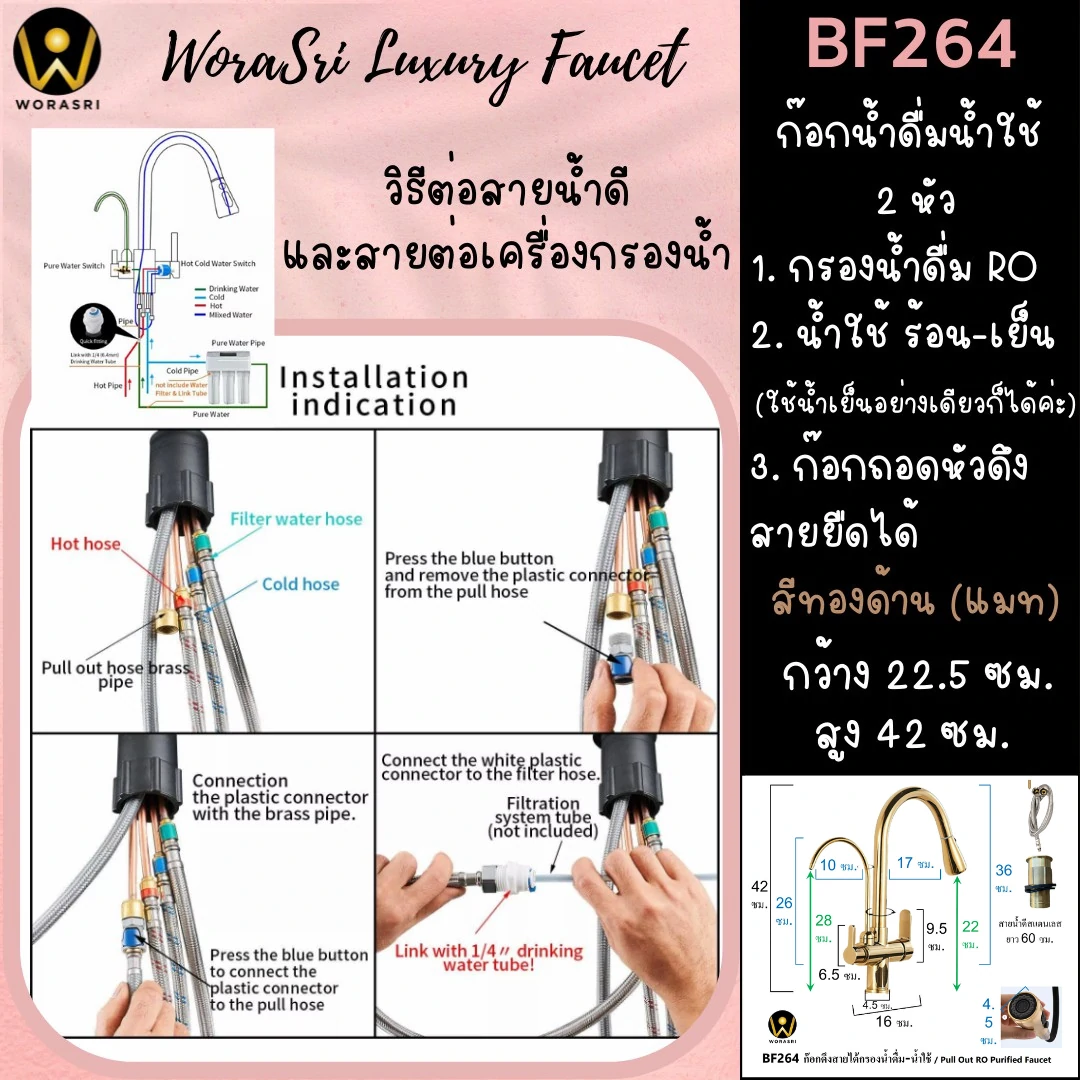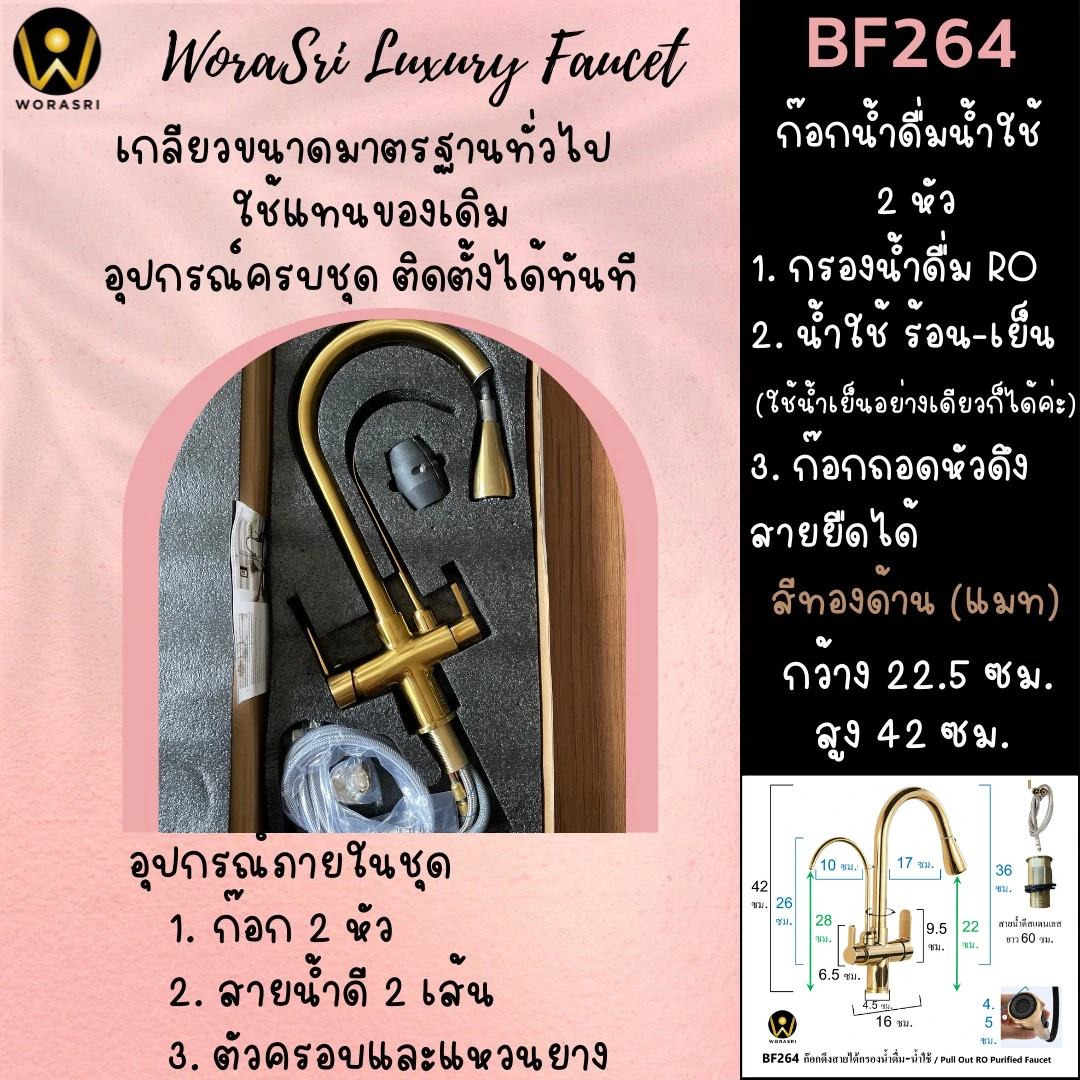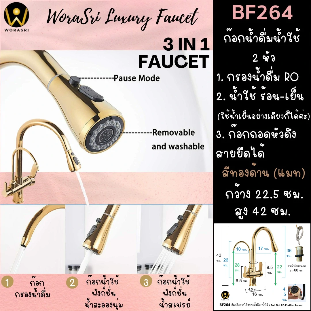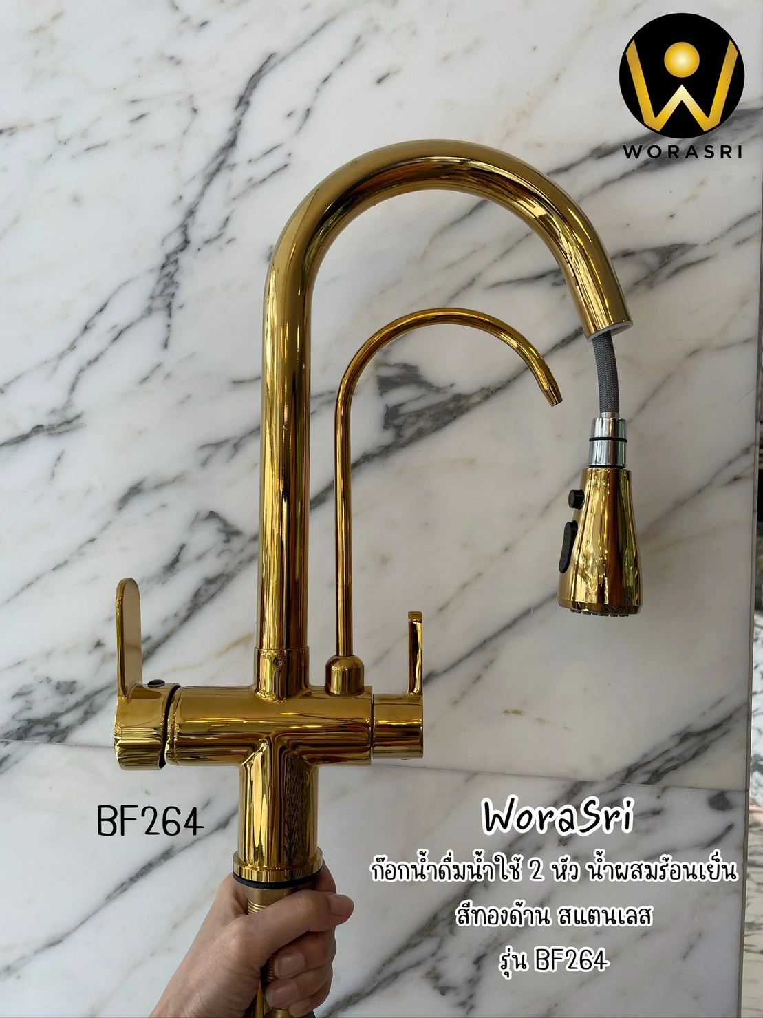 ก๊อกกรองน้ำดื่มดึงสาย2หัวสีทองเงา BF264 Pull Out with Purified Faucet