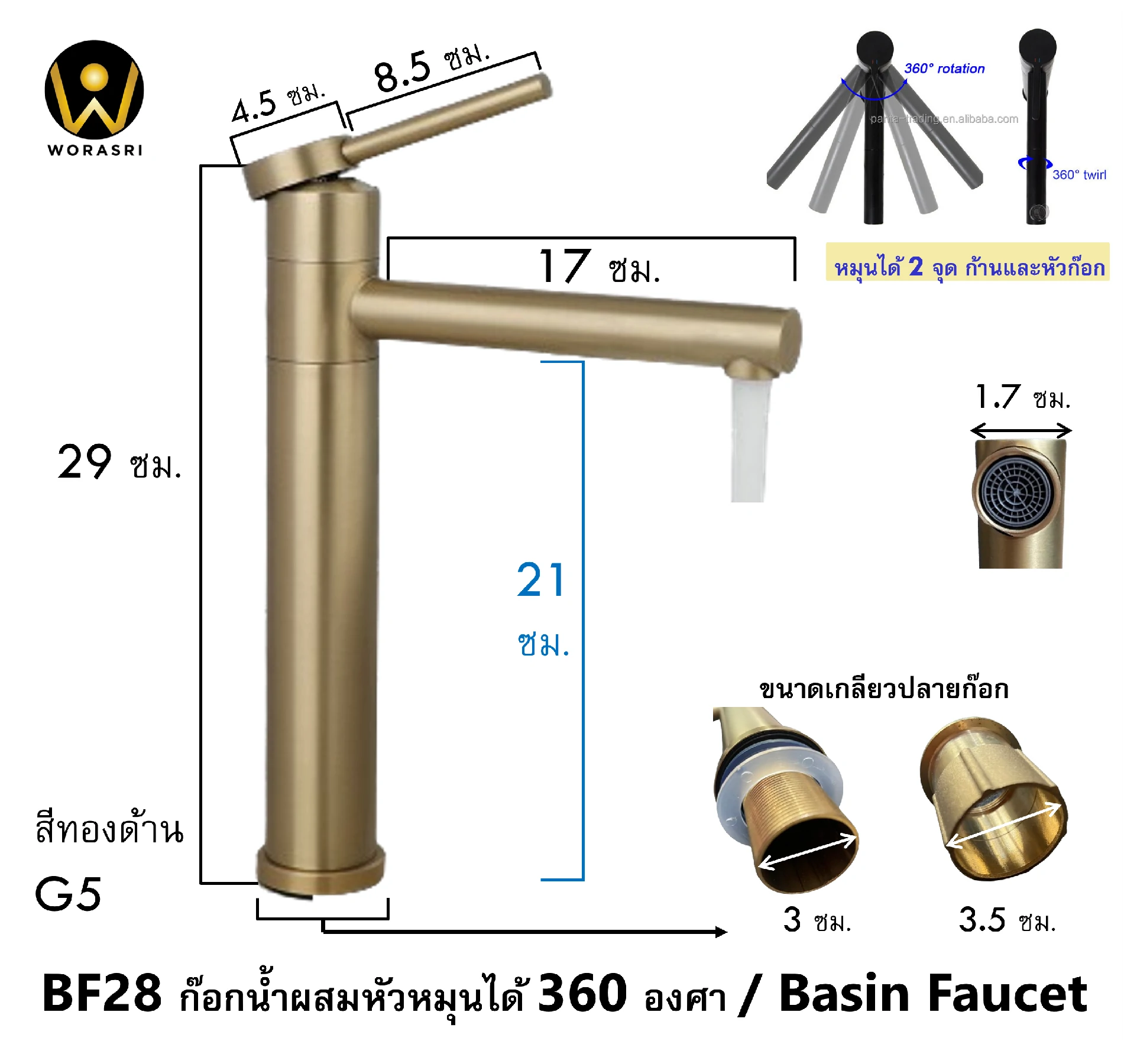 - ก๊อกสูง 29 ซม. พวกก๊อกยื่น 17 ซม.