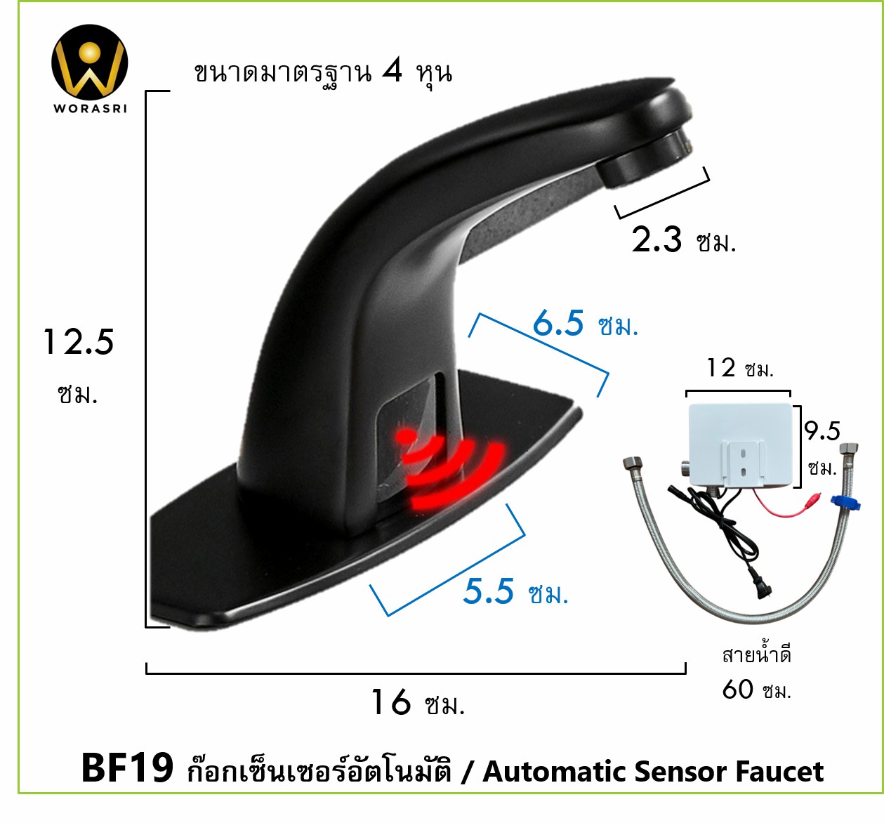 - เปิด-ปิดแบบอัตโนมัติโดยไม่ต้องสัมผัส ลดแบคทีเรียตกค้าง ติดตั้งง่าย แทนก๊อกอ่างล้างหน้าเดิมได้ทันที