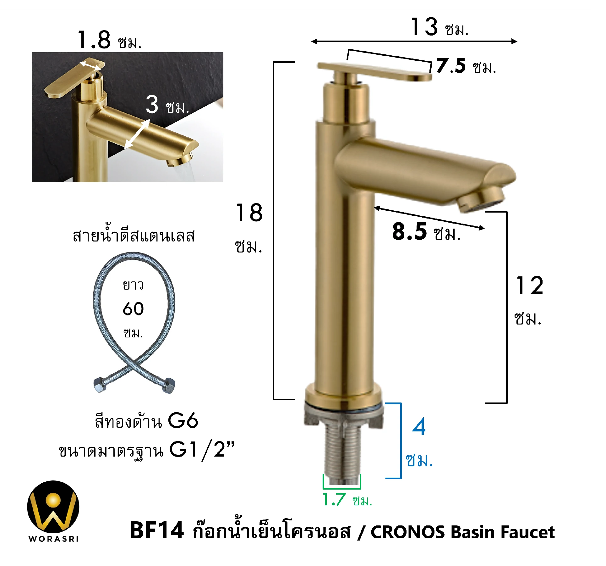 - ก้านพวยก๊อกน้ำสูงจากฐาน 12 ซม.