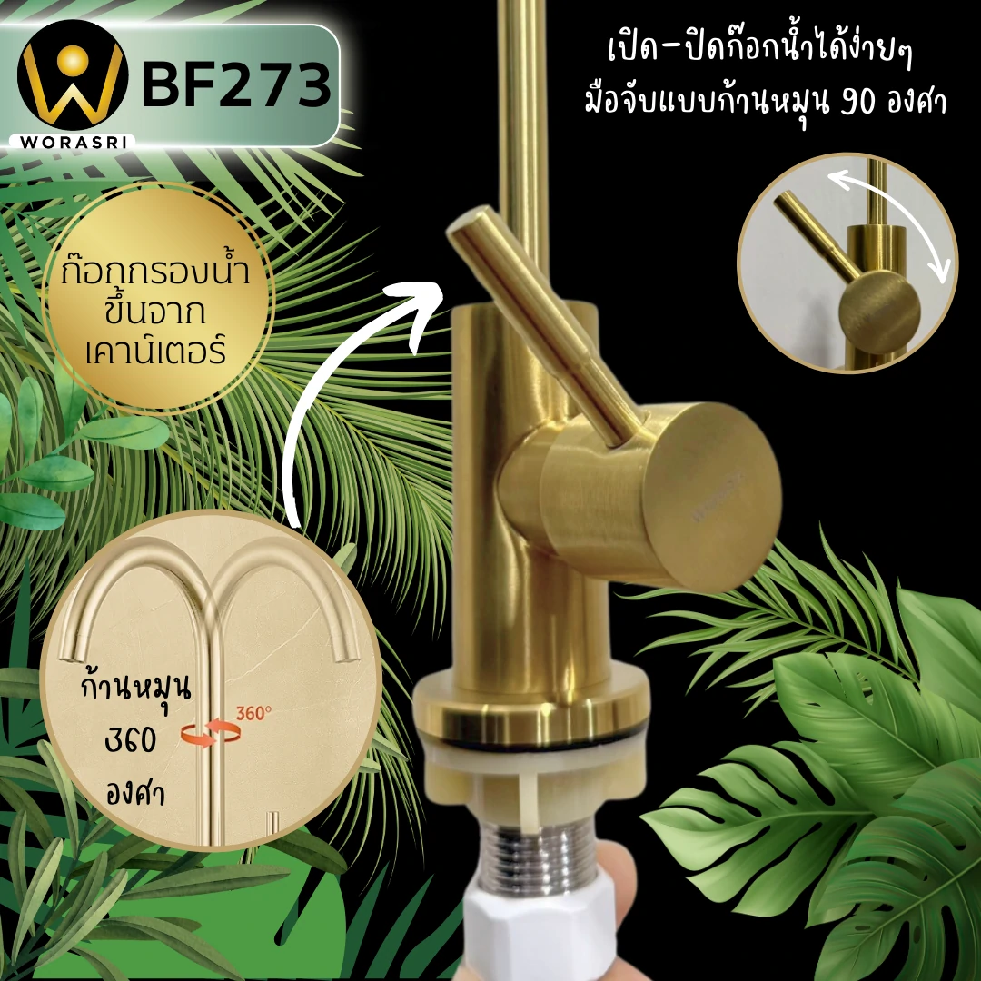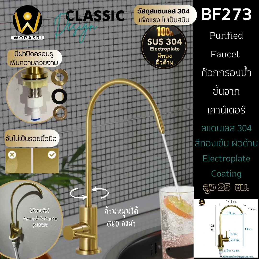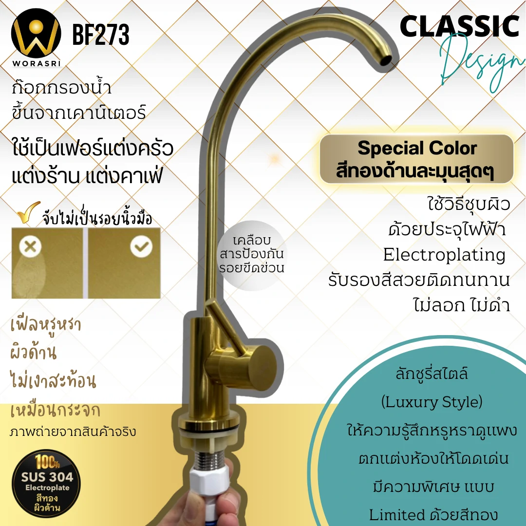 ก๊อกเครื่องกรองน้ำดื่มคอตัวยู น้ำเย็น สแตนเลส 304 สีทองด้าน BF273 Golden Purified Sink Faucet
