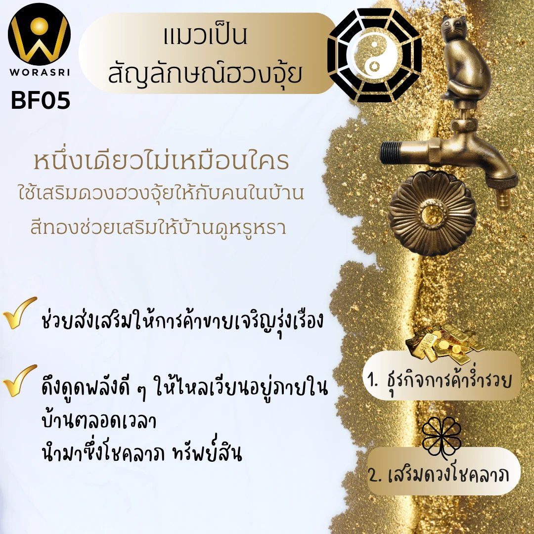 - Feng Shui essentials for your Home: 1 เดียวไม่เหมือนใคร ก๊อกน้ำทองเหลืองรูปสัตว์ใช้เสริมดวงฮวงจุ้ยให้กับคนในบ้าน ไม่ว่าจะเป็นเรื่องความรัก อำนาจ หน้าที่การงาน หรือแคล้วคลาดจากอันตราย แถมยังเป็นของตกแต่งบ้านให้สวยงามน่าอยู่อาศัยอีกด้วย