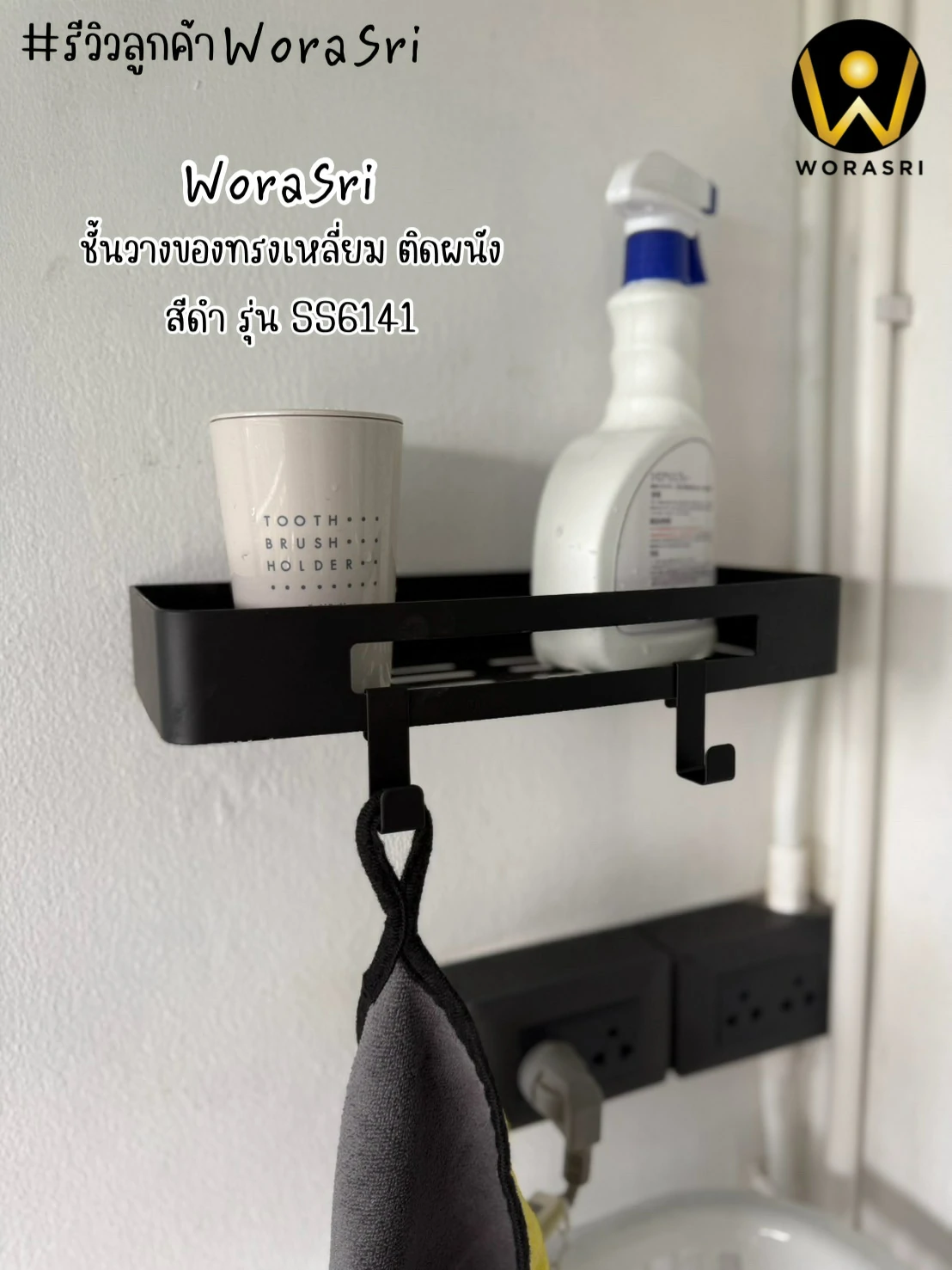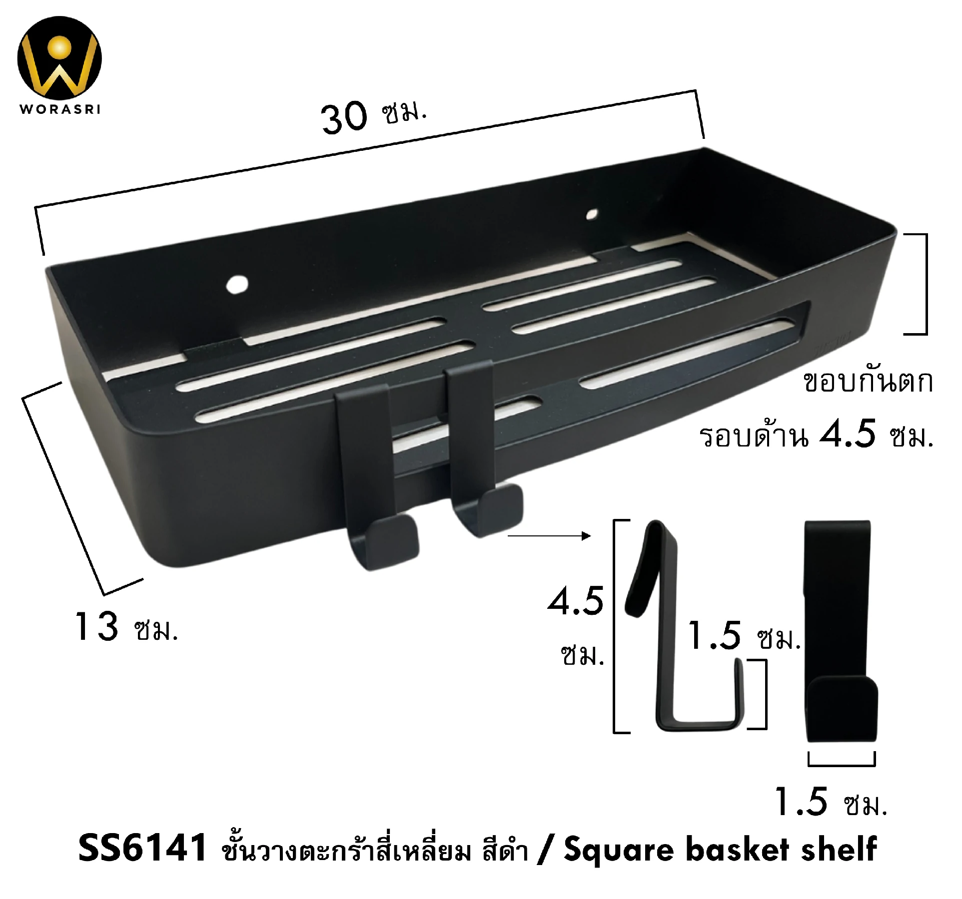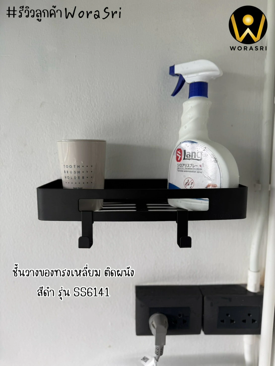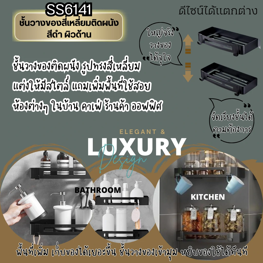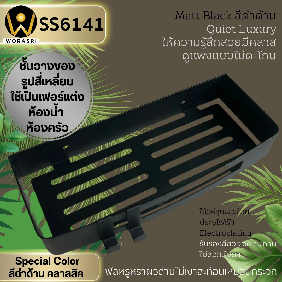 ชั้นวางของตะแกรงแขวนติดผนังสีดำ พื้นที่เพิ่ม ก็เก็บของได้เยอะขึ้น ใครที่ชอบการอาบน้ำแบบจัดเต็ม ใช้ของเยอะแต่ไม่รู้จะวางที่ไหน ชั้นวางตะกร้าสี่เหลี่ยม ไอเทมที่ออกแบบมาเพื่อตอบโจทย์การใช้งานโดยเฉพาะกระทัดรัดไม่เปลืองพื้นที่ แต่ได้ทั้งวางของและแขวนของแบบ 2 IN 1 ที่สำคัญตัวฐานเป็นตะแกรงที่ช่วยให้ระบายน้ำได้เร็วไม่มีน้ำขังไม่เกิดเชื้อราแน่นอน ติดตั้งง่ายไม่ซับซ้อน ผลิตจากสแตนเลส 304 เนื้อวัสดุหนาพิเศษมีความแข็งแรงทนทาน รองรับน้ำหนักได้มาก เคลือบสีด้วยกระบวนการ Electroplated ทำให้วัสดุมีความเงางาม ยึดติดแน่นหนา ทนทานต่อการสึกหรอและมีอายุการใช้งานยาวนาน 1. รุ่น SS614 สีทองด้าน Brushed Gold 2. รุ่น SS6141 สีดำด้าน Matt Black 3. รุ่น SS6142 สีเงินเงา Chrome Plated คุณสมบัติเด่น ชั้นวางของตะแกรงห้องน้ำห้องครัวแขวนติดผนัง ดียังไง 1. 2 IN 1 Function: ฟังก์ชั่น 2 IN 1 ชั้นวางตะกร้าออกแบบมาให้ใช้งานได้ทั้งวางและแขวนเครื่องใช้ต่างๆ ช่วยจัดระเบียบและประหยัดพื้นที่ให้คุณใช้ได้ทั้งสองอย่างพร้อมกัน 2. Square Design: ดีไซน์รูปสี่เหลี่ยมผืนผ้า ชั้นวางตะกร้าสี่เหลี่ยม ดีไซน์รูปเลขาคณิตเพื่อใช้งานได้คุ้มค่า จัดเก็บได้มากขึ้น มีขอบกันของตกรอบด้าน ขอบด้านหน้ามีช่องเว้นไว้ให้เห็นชื่อฉลากสินค้าได้อย่างชัดเจนโดยไม่ต้องหยิบขึ้นมา ดีไซน์ทันสมัยเพิ่มมิติและความโดดเด่นให้กับห้องน้ำ พร้อมการจัดเก็บที่มีประสิทธิภาพและสะดวกสบาย