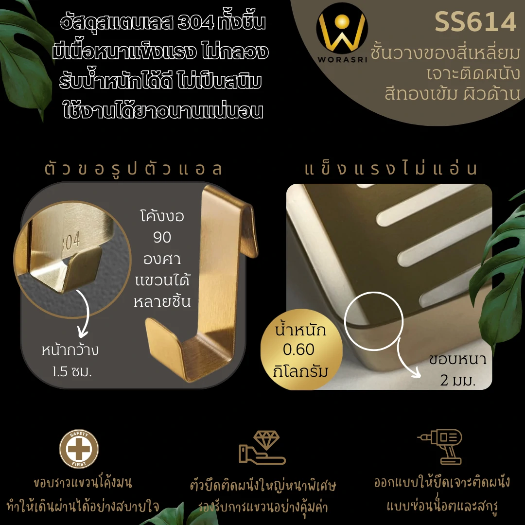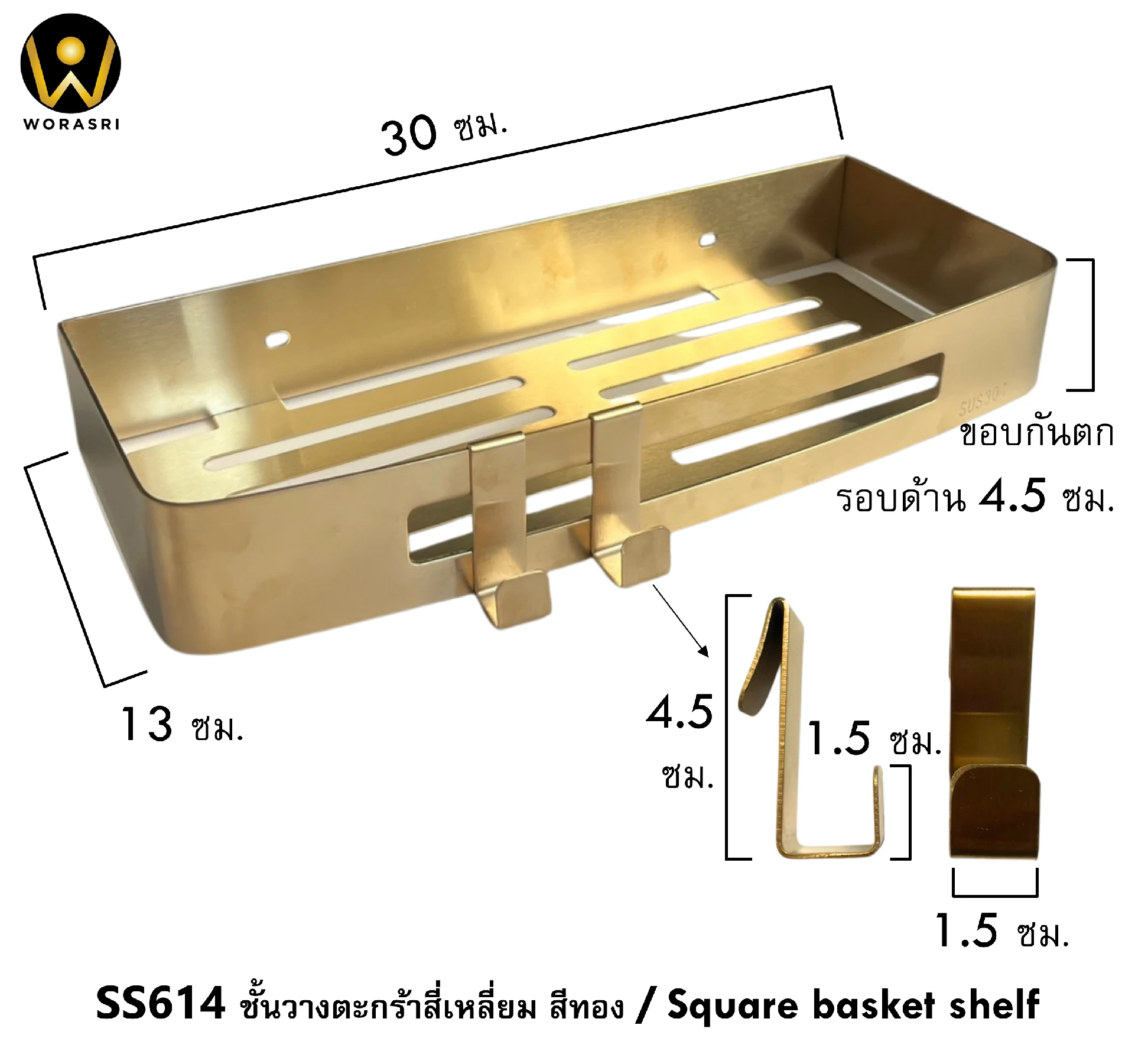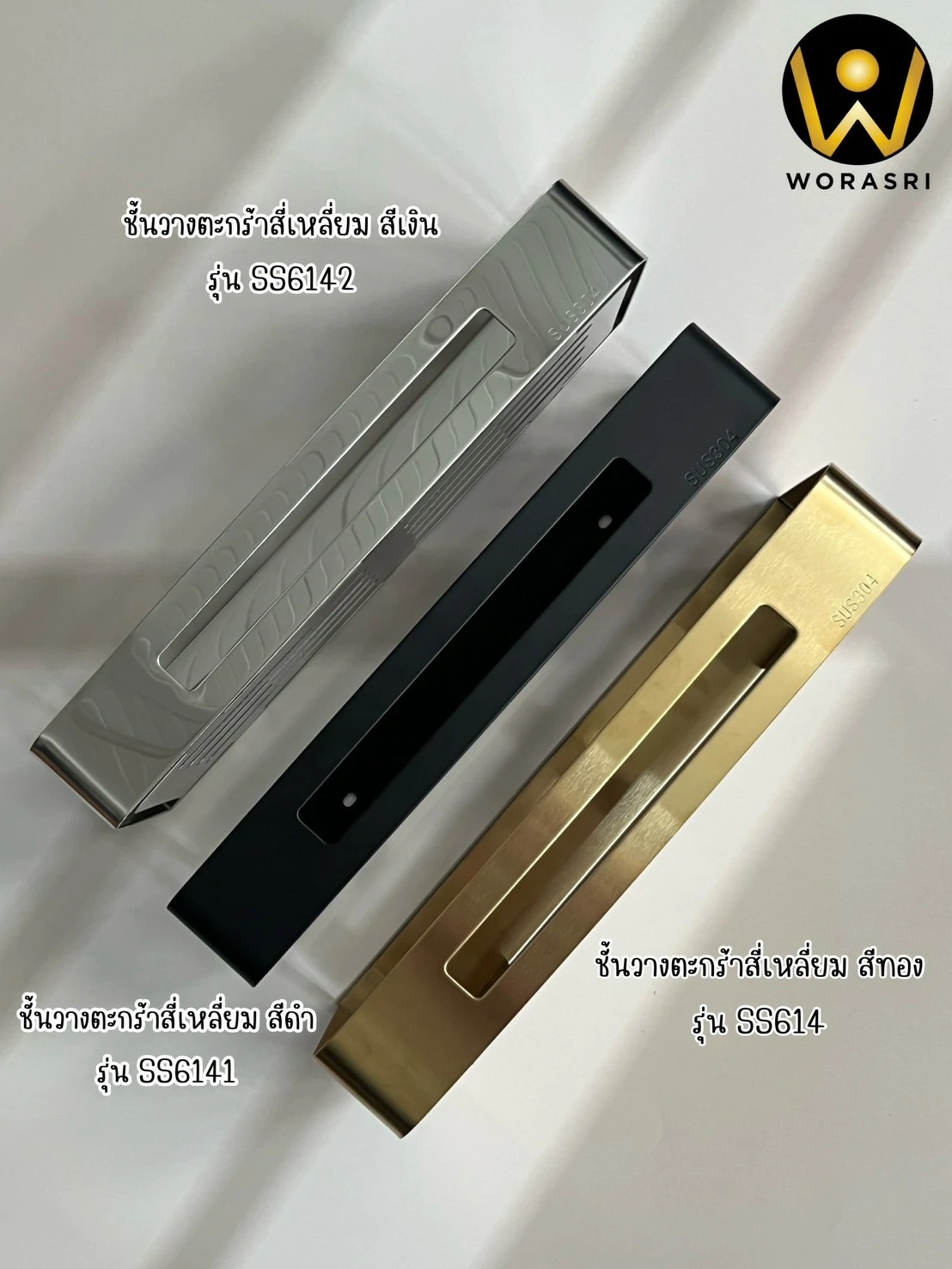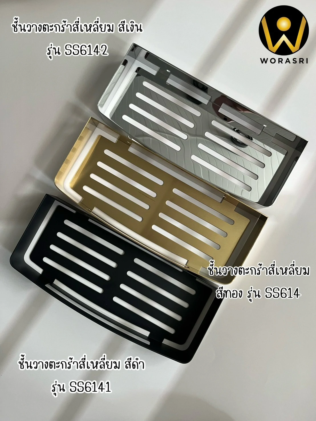 ชั้นวางของตะแกรงแขวนติดผนังสีทอง พื้นที่เพิ่ม ก็เก็บของได้เยอะขึ้น ใครที่ชอบการอาบน้ำแบบจัดเต็ม ใช้ของเยอะแต่ไม่รู้จะวางที่ไหน ชั้นวางตะกร้าสี่เหลี่ยม ไอเทมที่ออกแบบมาเพื่อตอบโจทย์การใช้งานโดยเฉพาะกระทัดรัดไม่เปลืองพื้นที่ แต่ได้ทั้งวางของและแขวนของแบบ 2 IN 1 ที่สำคัญตัวฐานเป็นตะแกรงที่ช่วยให้ระบายน้ำได้เร็วไม่มีน้ำขังไม่เกิดเชื้อราแน่นอน ติดตั้งง่ายไม่ซับซ้อน ผลิตจากสแตนเลส 304 เนื้อวัสดุหนาพิเศษมีความแข็งแรงทนทาน รองรับน้ำหนักได้มาก เคลือบสีด้วยกระบวนการ Electroplated ทำให้วัสดุมีความเงางาม ยึดติดแน่นหนา ทนทานต่อการสึกหรอและมีอายุการใช้งานยาวนาน 1. รุ่น SS614 สีทองด้าน Brushed Gold 2. รุ่น SS6141 สีดำด้าน Matt Black 3. รุ่น SS6142 สีเงินเงา Chrome Plated คุณสมบัติเด่น ชั้นวางของตะแกรงห้องน้ำห้องครัวแขวนติดผนัง ดียังไง 1. 2 IN 1 Function: ฟังก์ชั่น 2 IN 1 ชั้นวางตะกร้าออกแบบมาให้ใช้งานได้ทั้งวางและแขวนเครื่องใช้ต่างๆ ช่วยจัดระเบียบและประหยัดพื้นที่ให้คุณใช้ได้ทั้งสองอย่างพร้อมกัน 2. Square Design: ดีไซน์รูปสี่เหลี่ยมผืนผ้า ชั้นวางตะกร้าสี่เหลี่ยม ดีไซน์รูปเลขาคณิตเพื่อใช้งานได้คุ้มค่า จัดเก็บได้มากขึ้น มีขอบกันของตกรอบด้าน ขอบด้านหน้ามีช่องเว้นไว้ให้เห็นชื่อฉลากสินค้าได้อย่างชัดเจนโดยไม่ต้องหยิบขึ้นมา ดีไซน์ทันสมัยเพิ่มมิติและความโดดเด่นให้กับห้องน้ำ พร้อมการจัดเก็บที่มีประสิทธิภาพและสะดวกสบาย