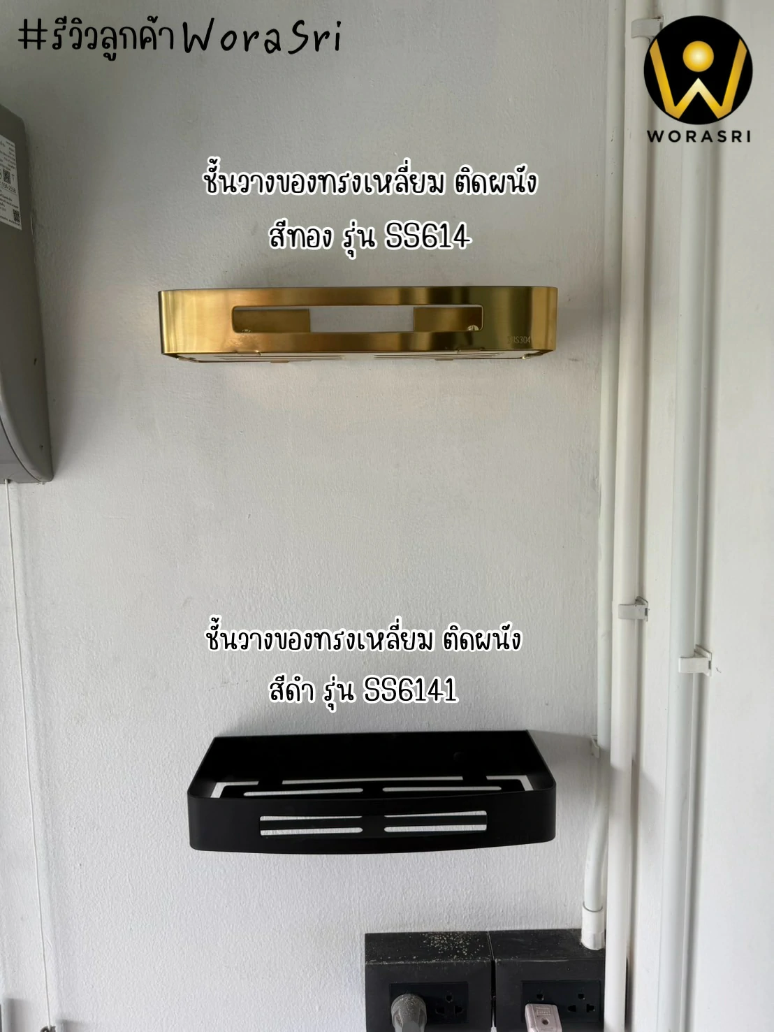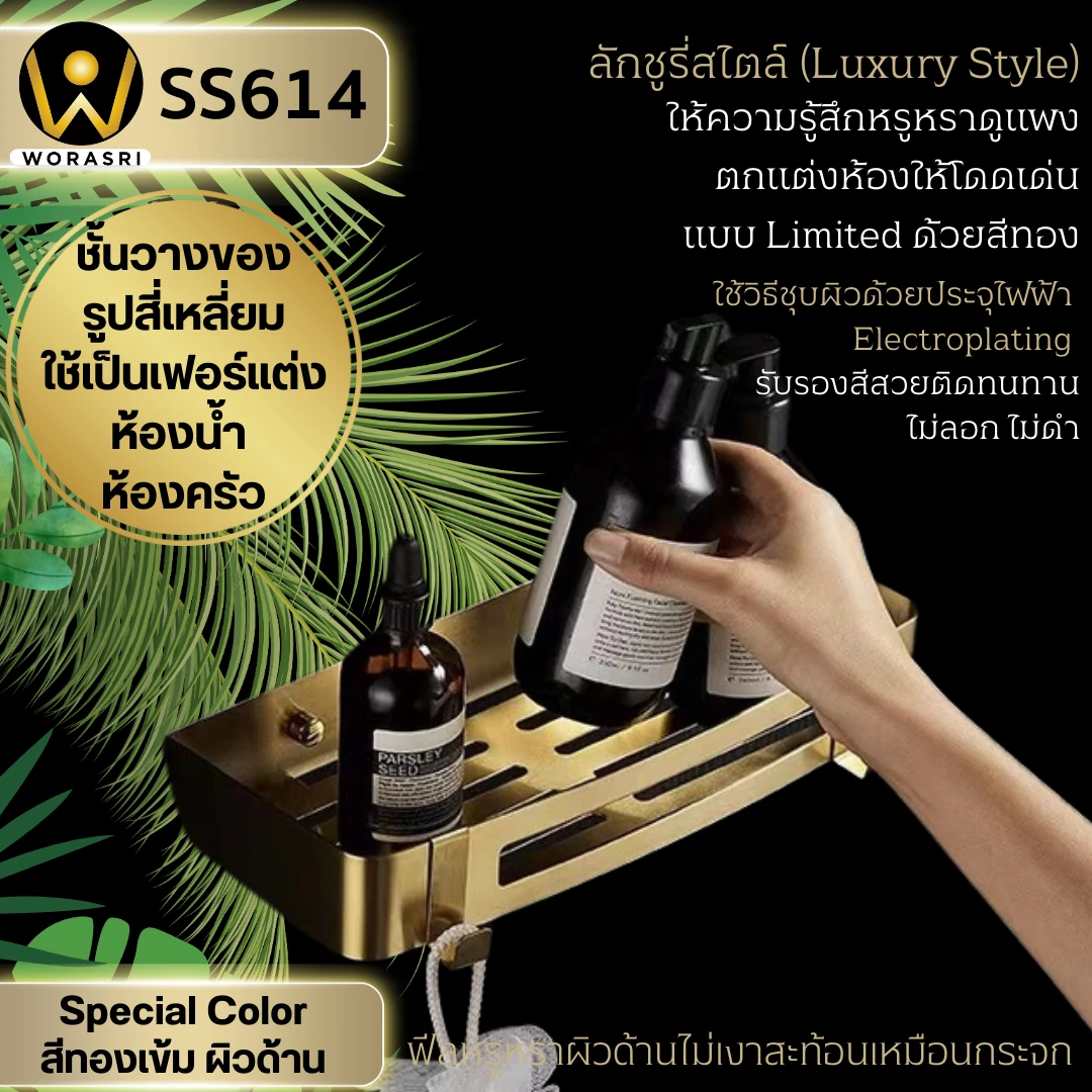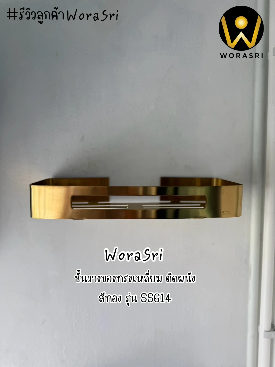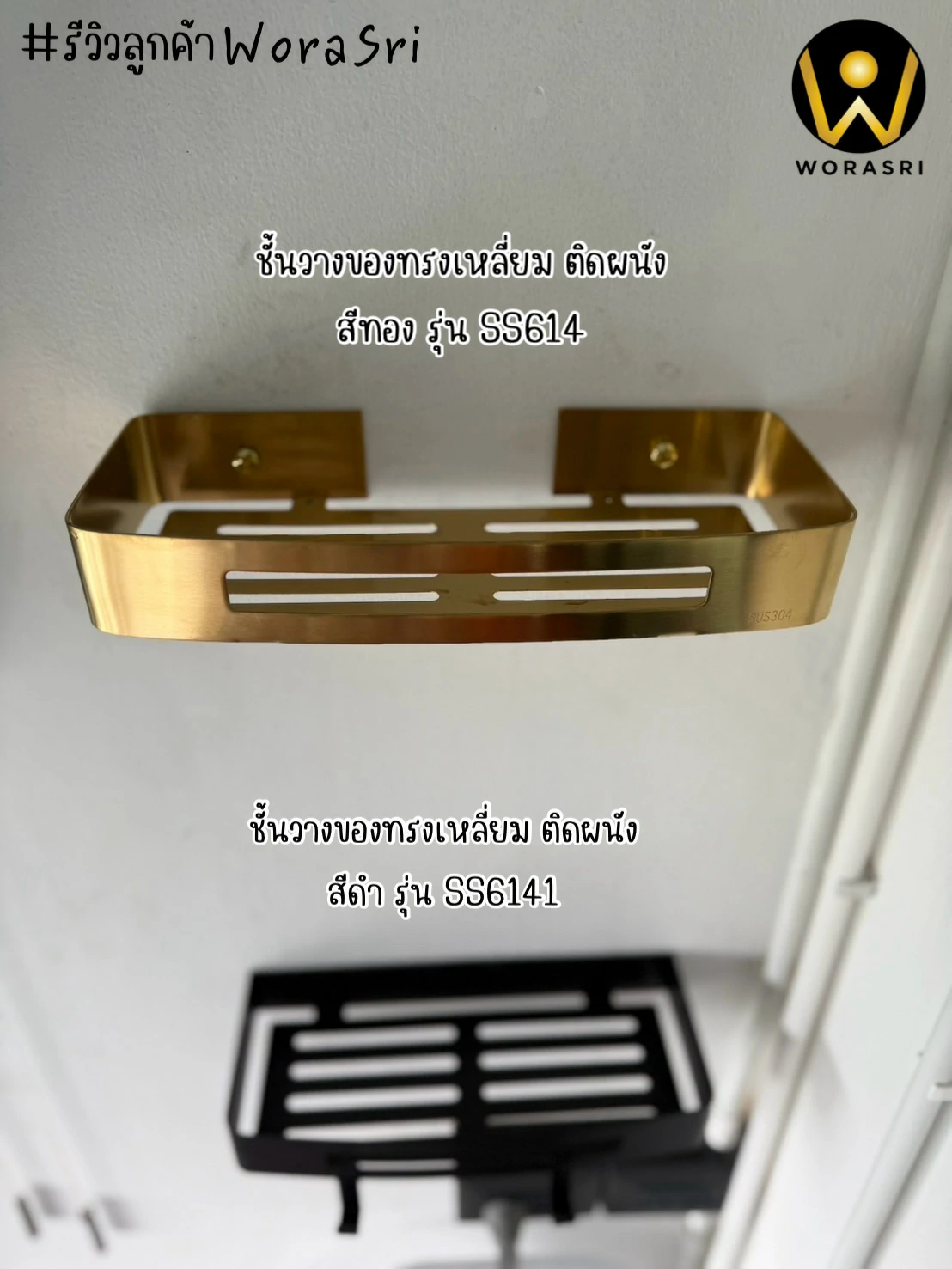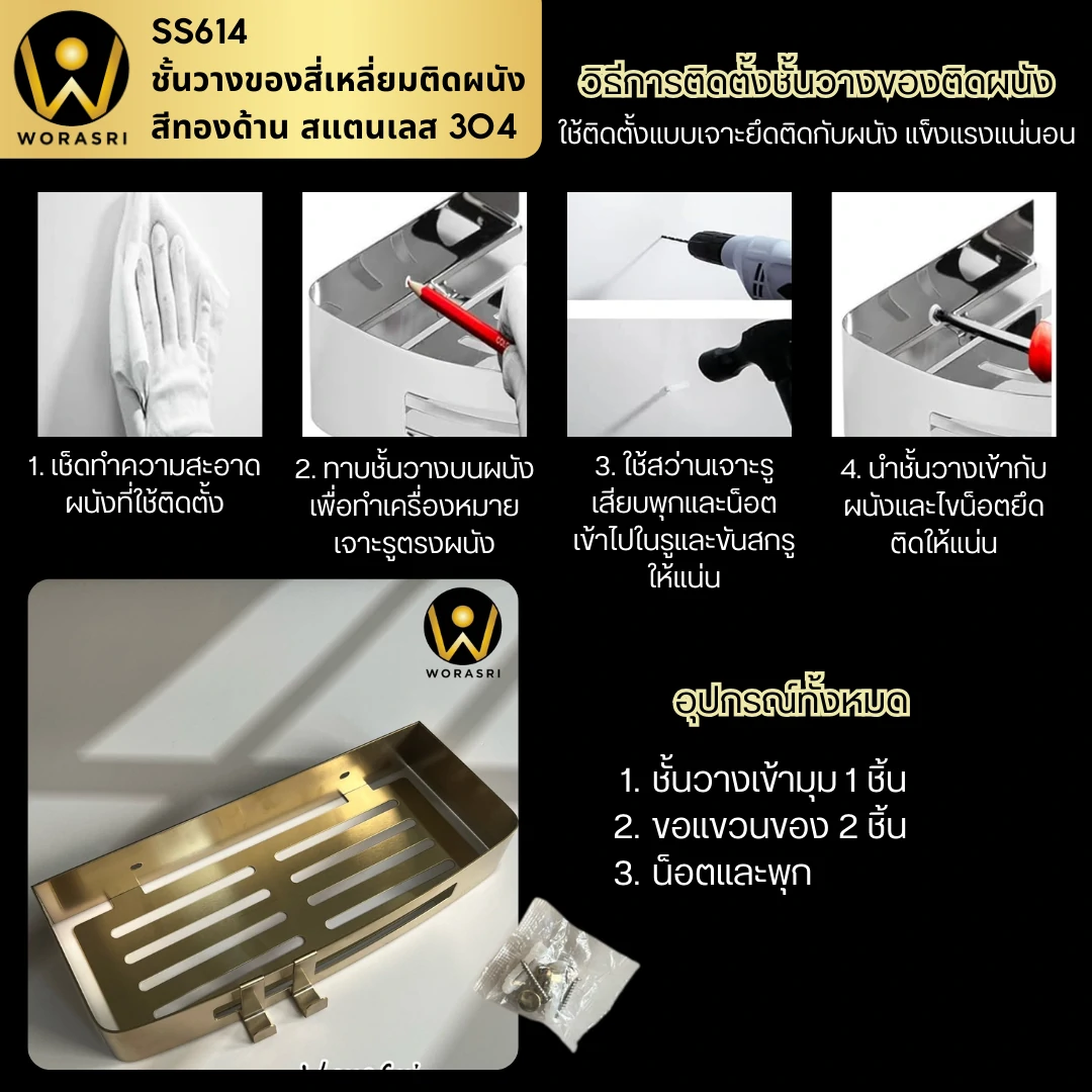 ชั้นวางของตะแกรงแขวนติดผนังสีทอง พื้นที่เพิ่ม ก็เก็บของได้เยอะขึ้น ใครที่ชอบการอาบน้ำแบบจัดเต็ม ใช้ของเยอะแต่ไม่รู้จะวางที่ไหน ชั้นวางตะกร้าสี่เหลี่ยม ไอเทมที่ออกแบบมาเพื่อตอบโจทย์การใช้งานโดยเฉพาะกระทัดรัดไม่เปลืองพื้นที่ แต่ได้ทั้งวางของและแขวนของแบบ 2 IN 1 ที่สำคัญตัวฐานเป็นตะแกรงที่ช่วยให้ระบายน้ำได้เร็วไม่มีน้ำขังไม่เกิดเชื้อราแน่นอน ติดตั้งง่ายไม่ซับซ้อน ผลิตจากสแตนเลส 304 เนื้อวัสดุหนาพิเศษมีความแข็งแรงทนทาน รองรับน้ำหนักได้มาก เคลือบสีด้วยกระบวนการ Electroplated ทำให้วัสดุมีความเงางาม ยึดติดแน่นหนา ทนทานต่อการสึกหรอและมีอายุการใช้งานยาวนาน 1. รุ่น SS614 สีทองด้าน Brushed Gold 2. รุ่น SS6141 สีดำด้าน Matt Black 3. รุ่น SS6142 สีเงินเงา Chrome Plated คุณสมบัติเด่น ชั้นวางของตะแกรงห้องน้ำห้องครัวแขวนติดผนัง ดียังไง 1. 2 IN 1 Function: ฟังก์ชั่น 2 IN 1 ชั้นวางตะกร้าออกแบบมาให้ใช้งานได้ทั้งวางและแขวนเครื่องใช้ต่างๆ ช่วยจัดระเบียบและประหยัดพื้นที่ให้คุณใช้ได้ทั้งสองอย่างพร้อมกัน 2. Square Design: ดีไซน์รูปสี่เหลี่ยมผืนผ้า ชั้นวางตะกร้าสี่เหลี่ยม ดีไซน์รูปเลขาคณิตเพื่อใช้งานได้คุ้มค่า จัดเก็บได้มากขึ้น มีขอบกันของตกรอบด้าน ขอบด้านหน้ามีช่องเว้นไว้ให้เห็นชื่อฉลากสินค้าได้อย่างชัดเจนโดยไม่ต้องหยิบขึ้นมา ดีไซน์ทันสมัยเพิ่มมิติและความโดดเด่นให้กับห้องน้ำ พร้อมการจัดเก็บที่มีประสิทธิภาพและสะดวกสบาย
