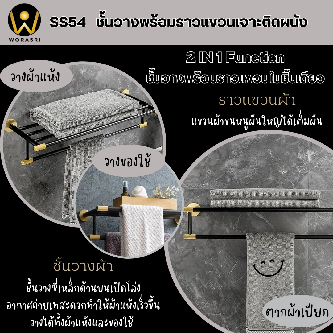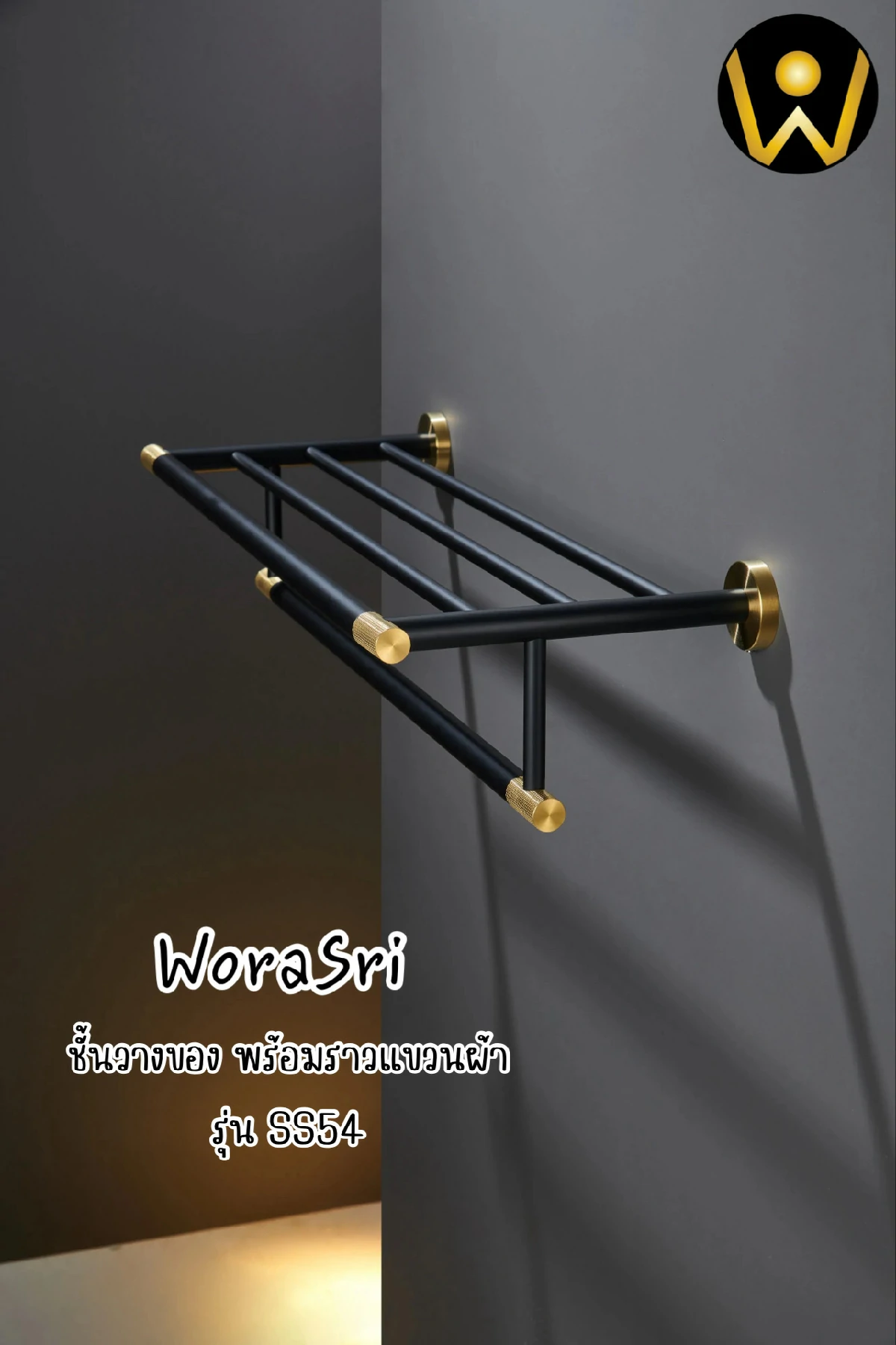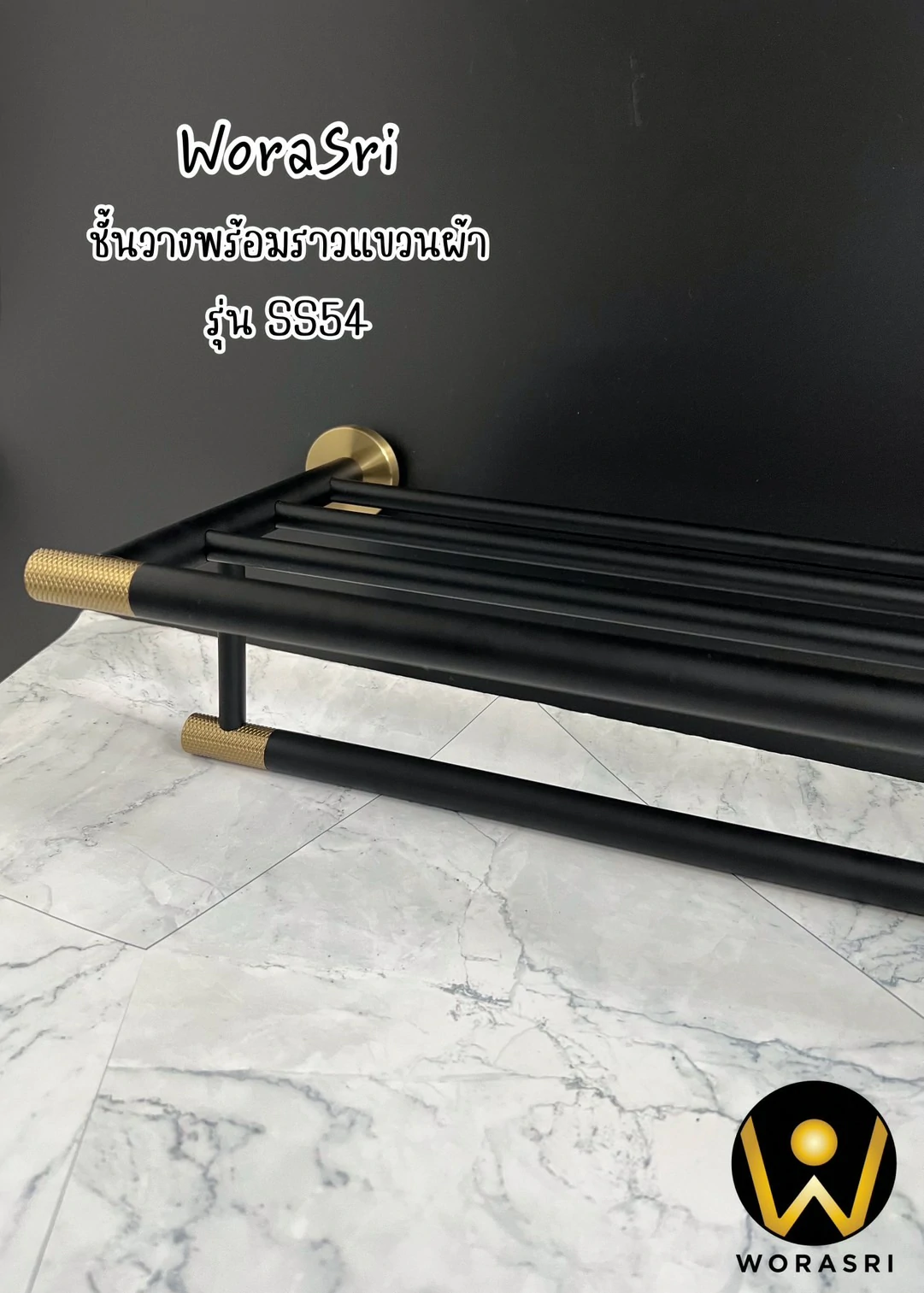 ชั้นวางพร้อมราวแขวนติดผนังสีดำทอง ยาว 60 ซม. SS54 Towel Rack Shelves Black & Gold color