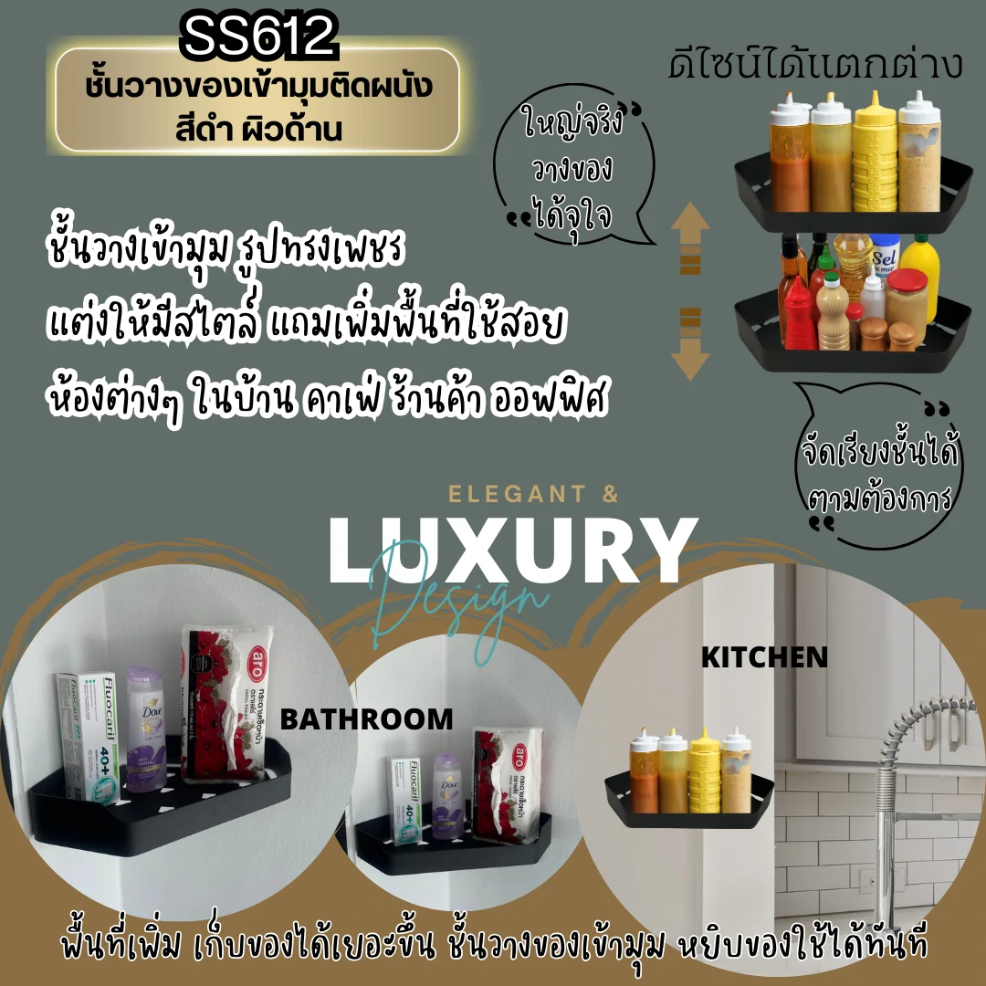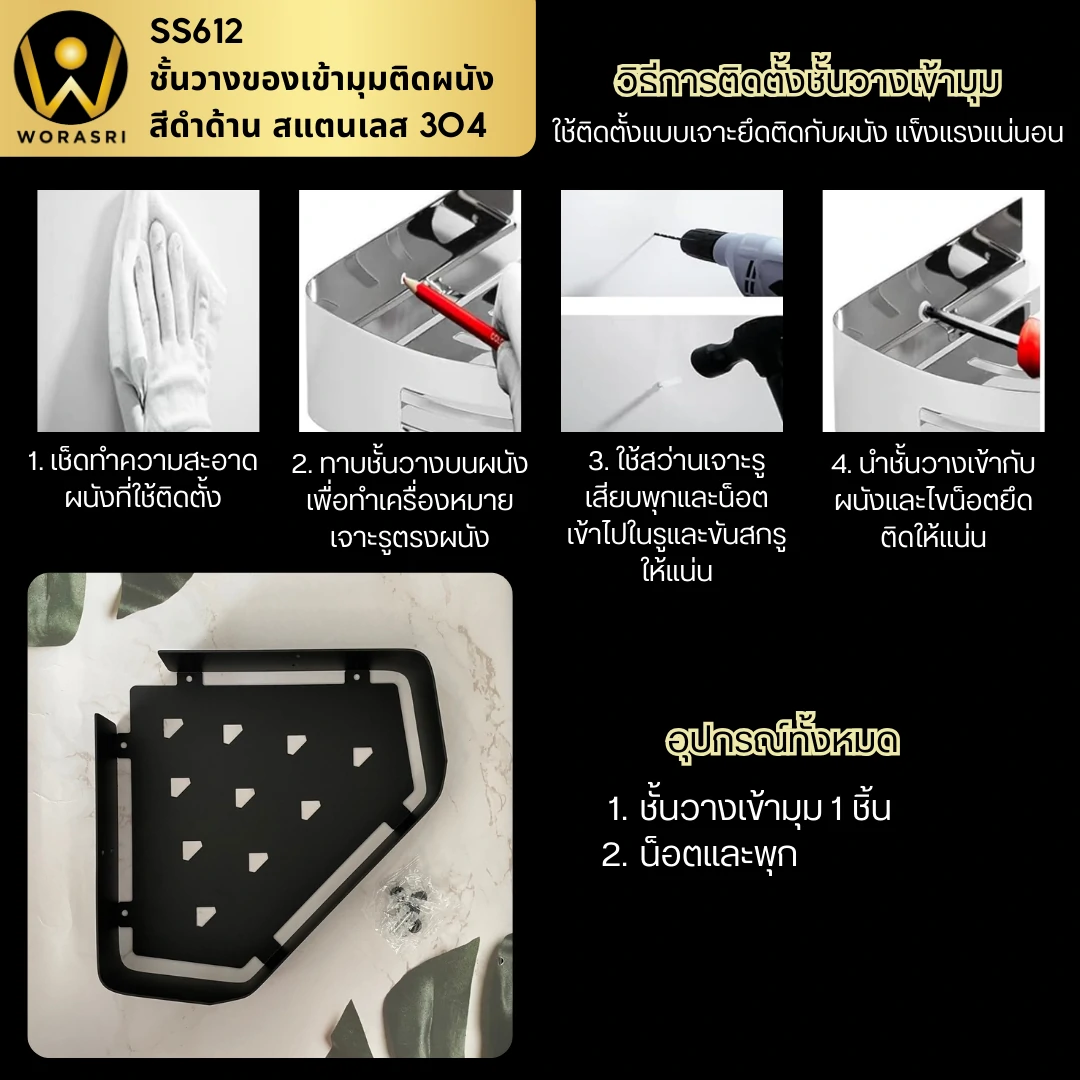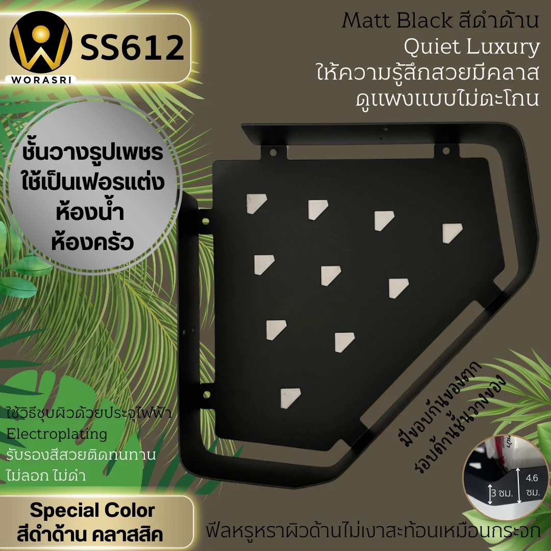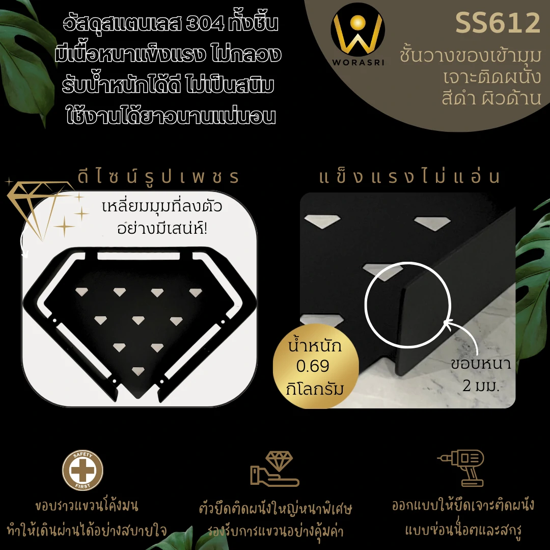 ชั้นวางเข้ามุมห้องน้ำติดผนังสีดำด้าน พื้นที่เพิ่ม ก็เก็บของได้เยอะขึ้น ชั้นวางของเข้ามุม เพิ่มความสะดวกในการใช้ของที่ต้องการได้ในทันที มีดีไซน์ที่เลียนแบบรูปเพชรดูทันสมัยช่วยให้ห้องน้ำดูสวยแล้วยังสะดวกต่อการใช้งาน มีรูระบายน้ำขังไม่ทำให้สิ่งของเกิดเชื้อราหากวางทิ้งไว้นานๆ ติดตั้งง่ายไม่ซับซ้อน ผลิตจากสแตนเลส 304 เนื้อวัสดุหนาพิเศษมีความแข็งแรงทนทาน รองรับน้ำหนักได้มาก เคลือบสีด้วยกระบวนการ Electroplated ทำให้วัสดุมีความเงางาม ยึดติดแน่นหนา ทนทานต่อการสึกหรอและมีอายุการใช้งานยาวนาน
