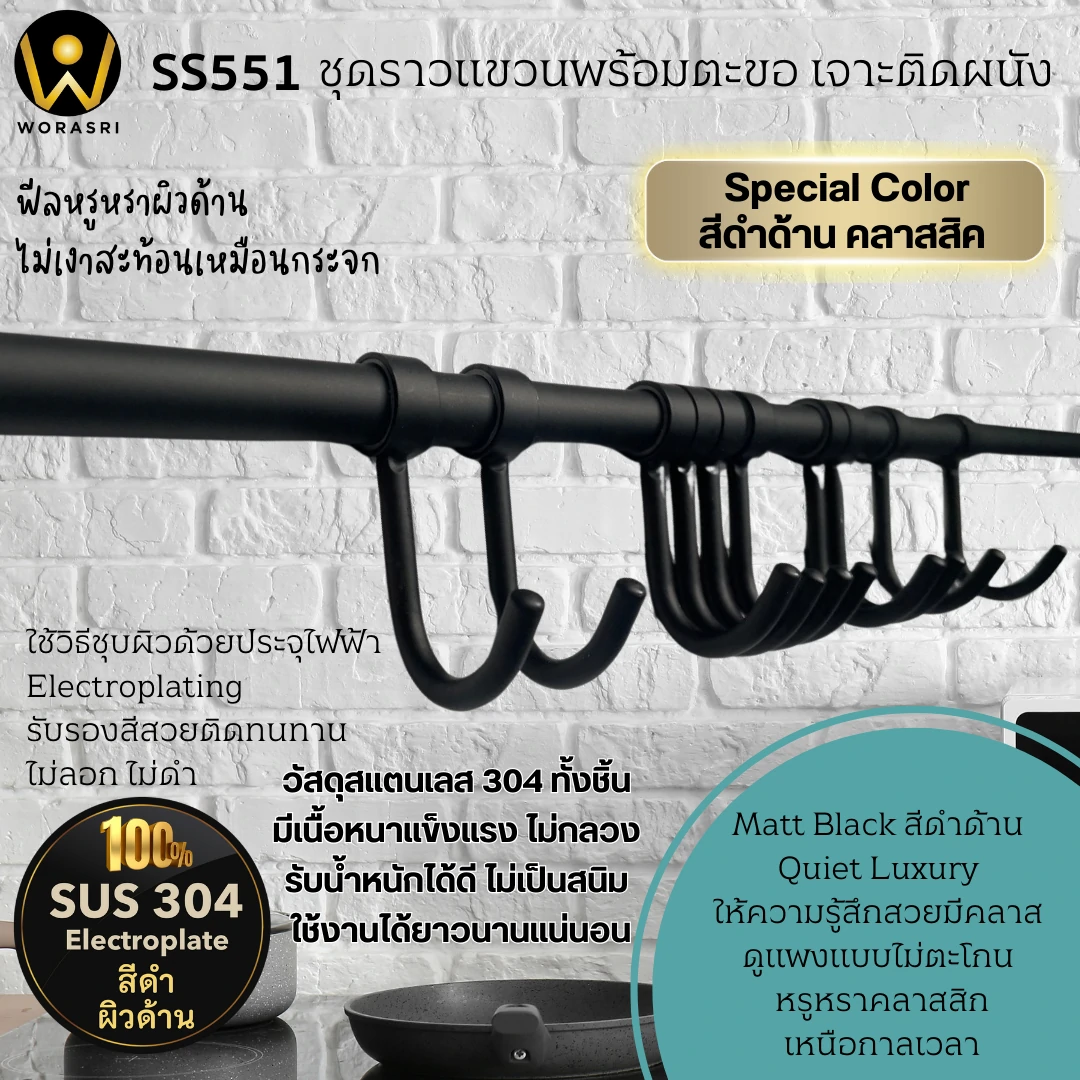 ชุดราวแขวนในครัว10ตะขอสีดำด้าน ยาว 80 ซม. สแตนเลส 304 SS551 Black Stainless Kitchen Hanger Rack with Hooks