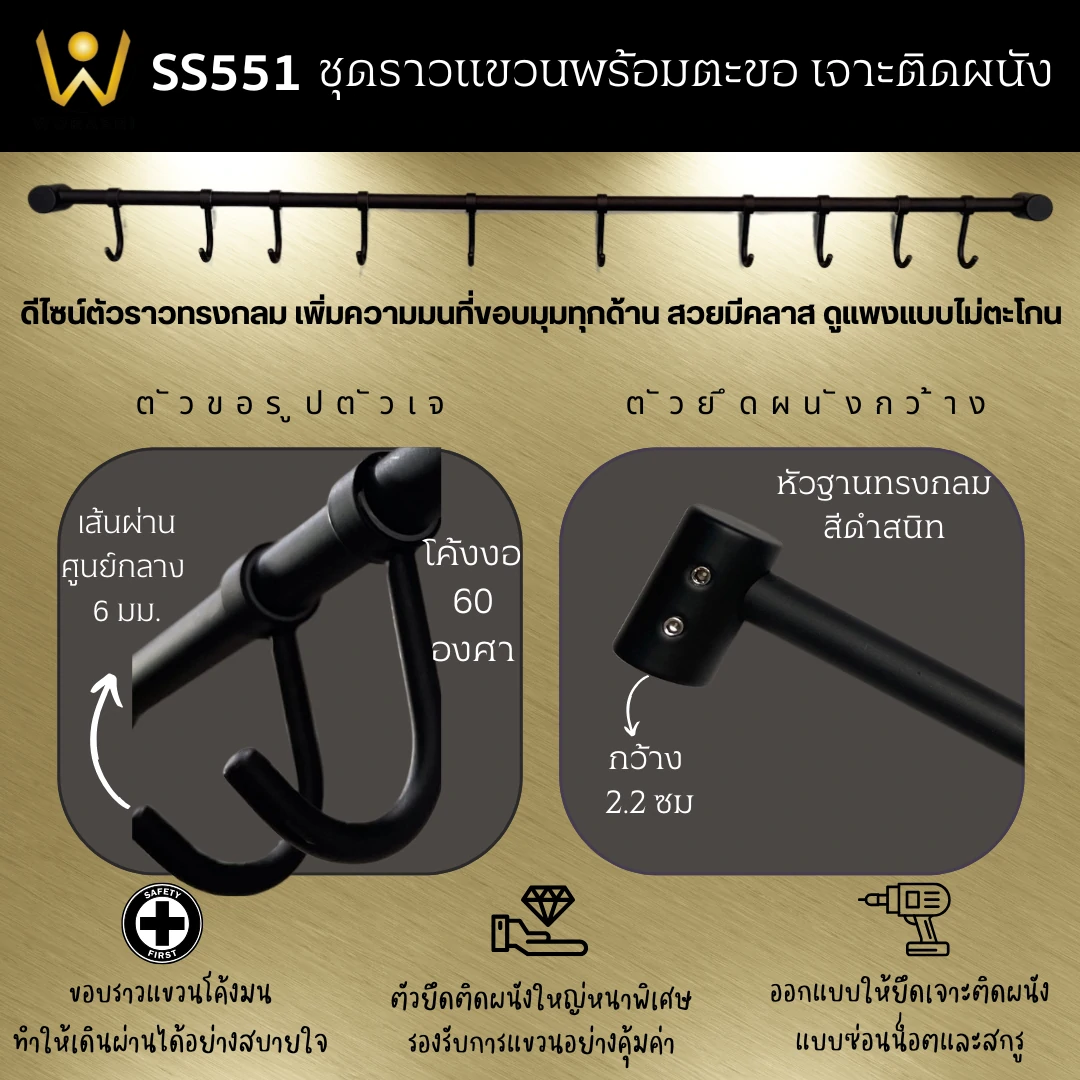- ตัวขอแขวนมีความหนาไม่บอบบาง และปลายขอแขวนมีเส้นผ่านศูนย์กลาง 6 มม.