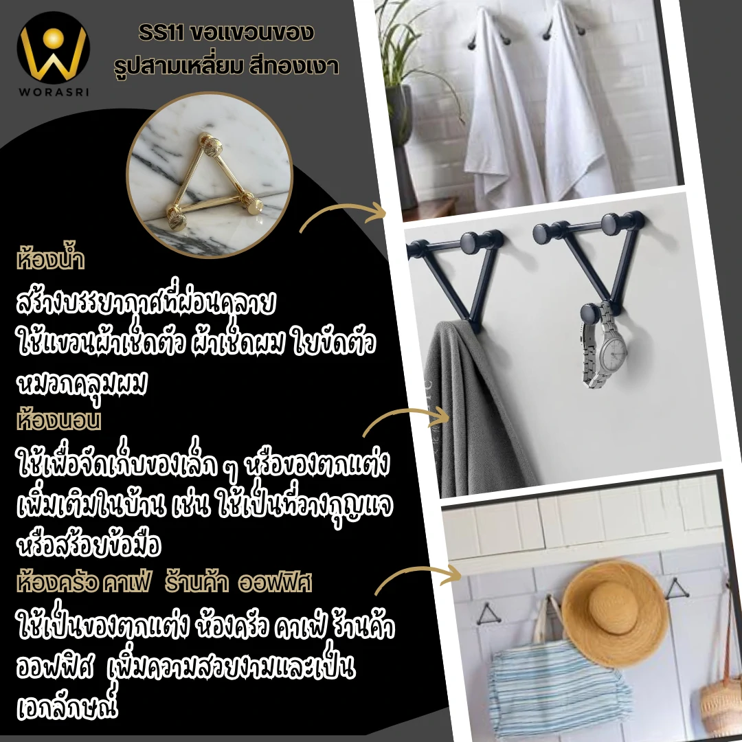 - เป็นจุดเด่นที่น่าสนใจ: ตะขอแขวนรูปสามเหลี่ยมทรงโมเดิร์นสามารถเป็นจุดเด่นที่น่าสนใจในการตกแต่งห้อง ทำให้พื้นที่ดูน่าสนใจและมีความเป็นมากมาย