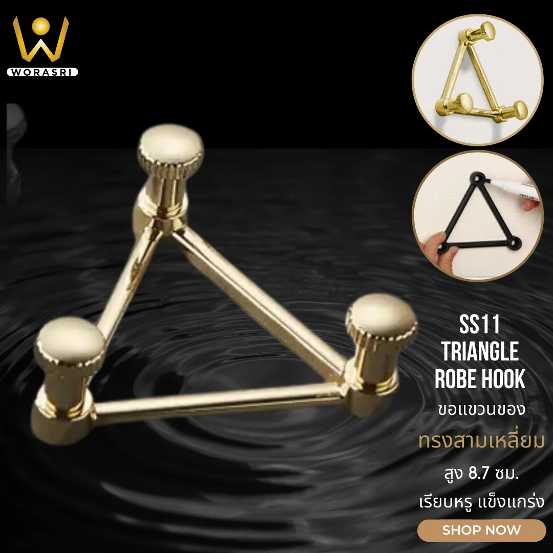 ตะขอฮุคราวแขวนผ้าติดผนังรูปสามเหลี่ยม ตัวช่วยที่ช่วยประหยัดพื้นที่ได้มากกว่าเดิม ตะขอแขวนรูปสามเหลี่ยมสีทองเงาวิบวับสะดุดตา ดีไซน์ที่ตอบโจทย์การใช้งาน แถมยังแฝงไปด้วยความทันสมัยและพลังงานเชิงบวกของรูปสามเหลี่ยม ที่สื่อถึงความเจริญรุ่งเรืองความกว้างหน้าและความมั่นคง ตัวขอแขวนมีโครงสร้างที่แข็งแรงใหญ่พิเศษกว่าขอแขวนรุ่นอื่น ถึงจะมีพื้นที่น้อยแต่แขวนของได้เยอะเยอะกว่าเดิม ผลิตด้วยวัสดุอย่างดี ZINC ALLOY ELECTROPLATE กระบวนการการเคลือบโลหะที่ใช้กระแสไฟฟ้าที่ต้องการเคลือบลงบนพื้นผิวของวัสดุแถมยังช่วยเพิ่มความแข็งแรงและลดการสึกหรอของวัสดุอีกด้วย