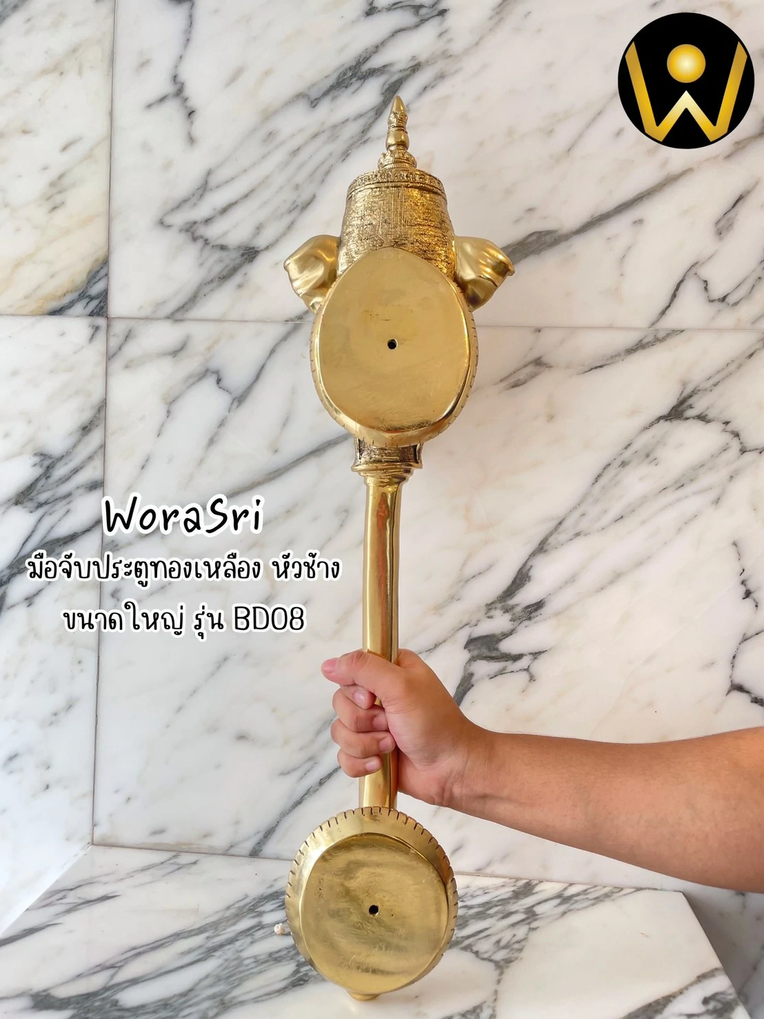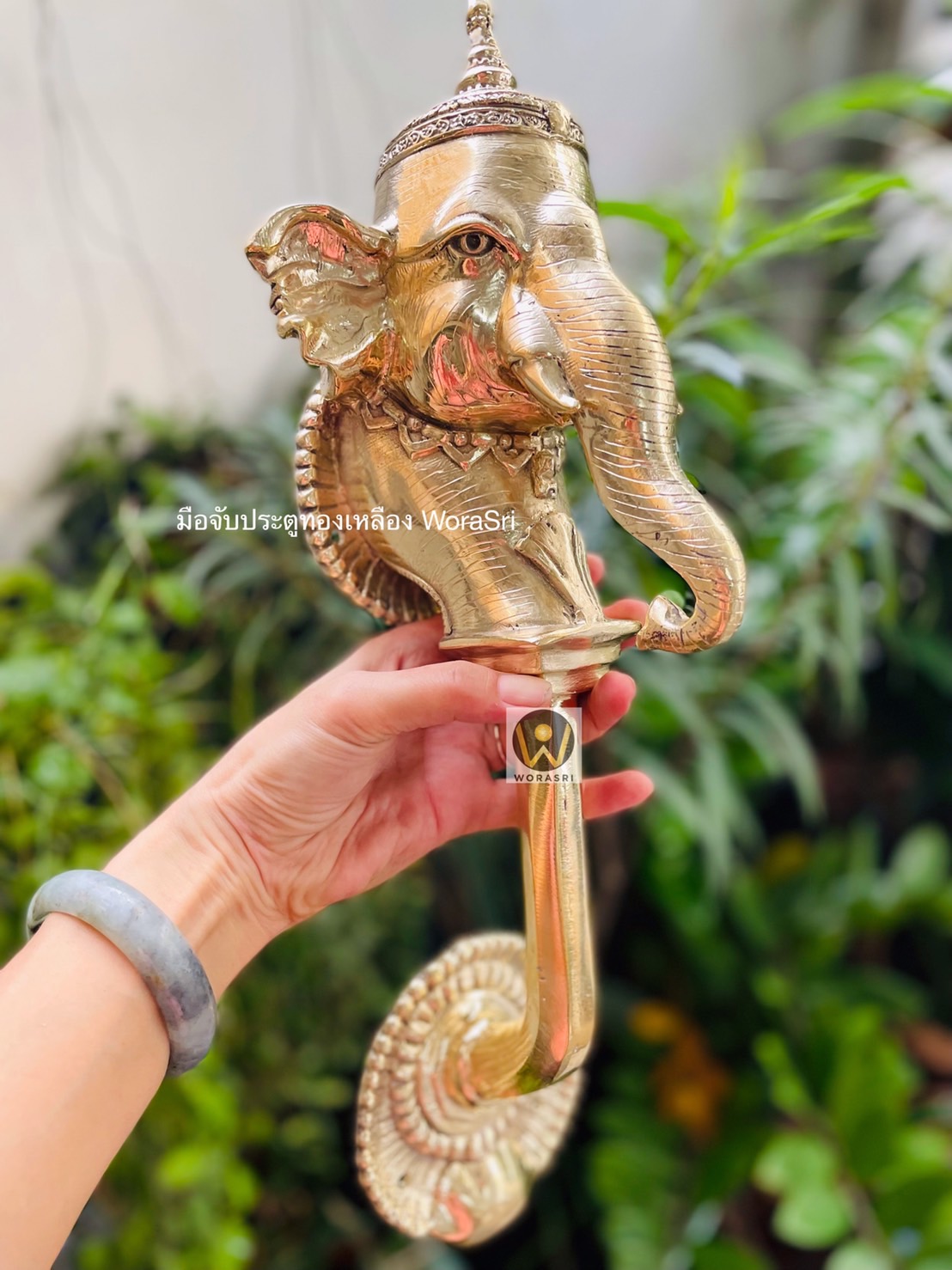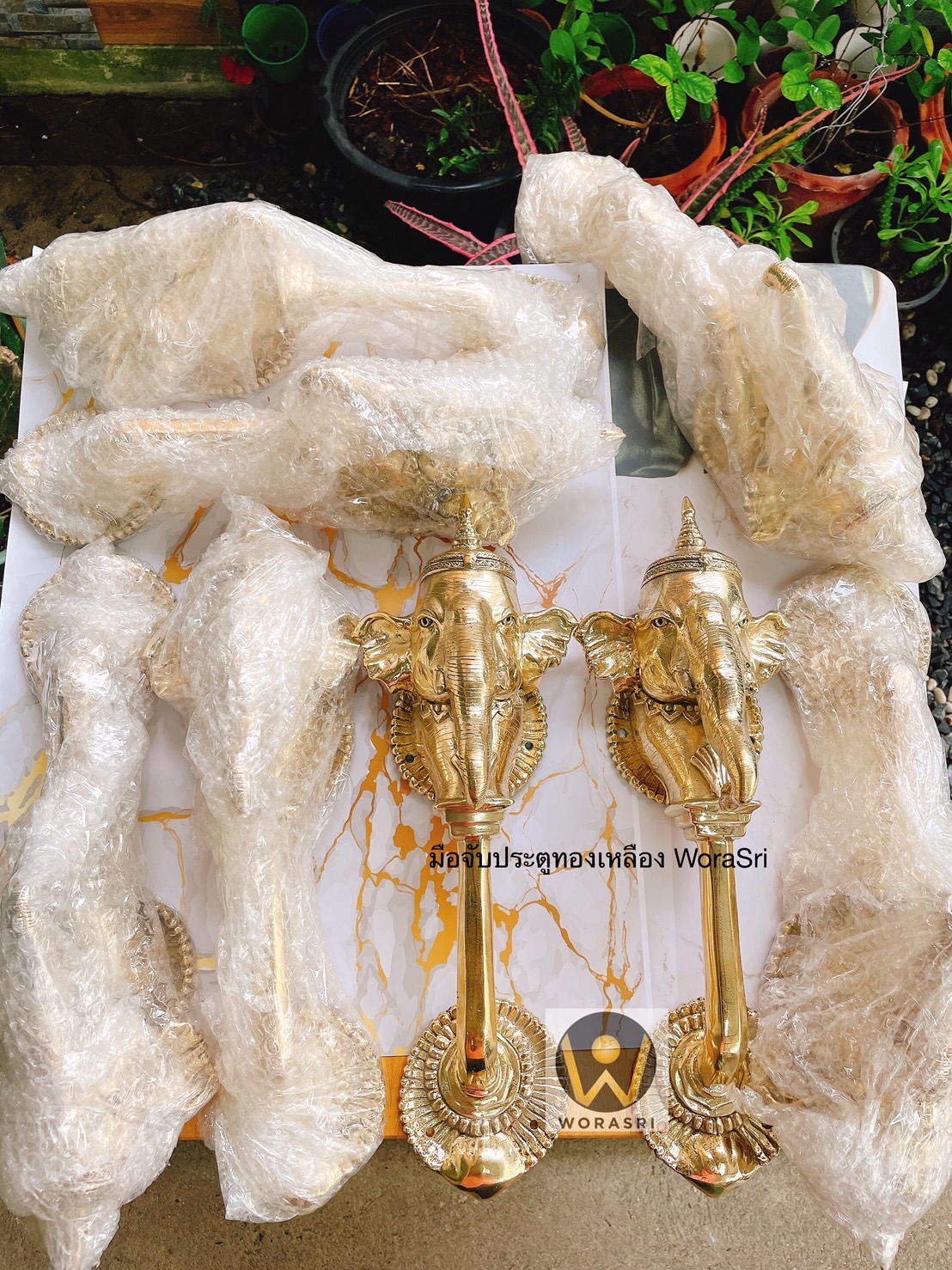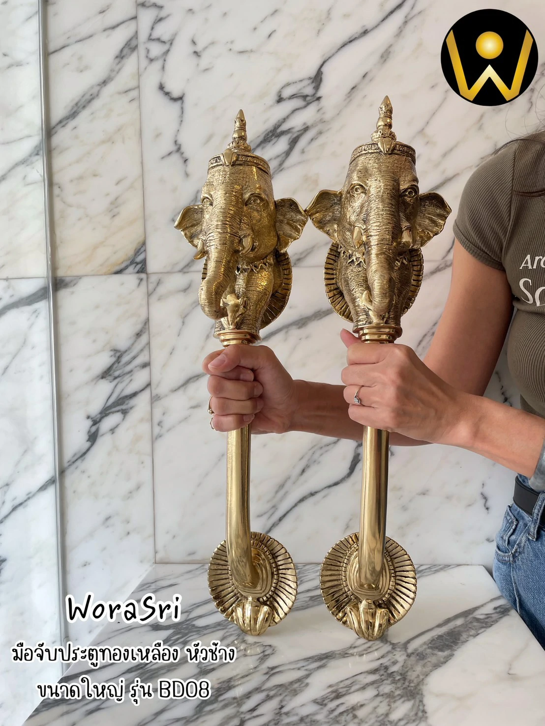 มือจับประตูทองเหลืองหัวช้างขนาดใหญ่ ทำจากทองเหลืองแท้ ขนาดใหญ่ถึง 54 ซม. งานแฮนด์เมดที่ไม่เหมือนใคร แตกต่างจากในตลาด เหมาะกับการยกระดับบ้านธรรมดาให้ดูหรูหรา สร้างบารมีให้กับเจ้าของบ้าน งานมาสเตอร์พีช น้ำหนักมาก แข็งแรง ทนทาน ใช้ได้นาน