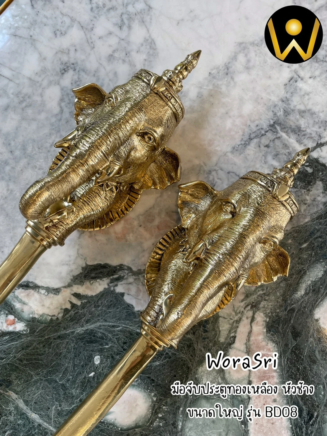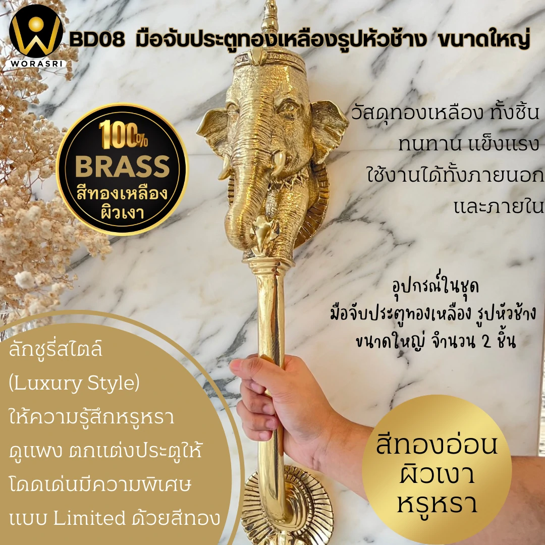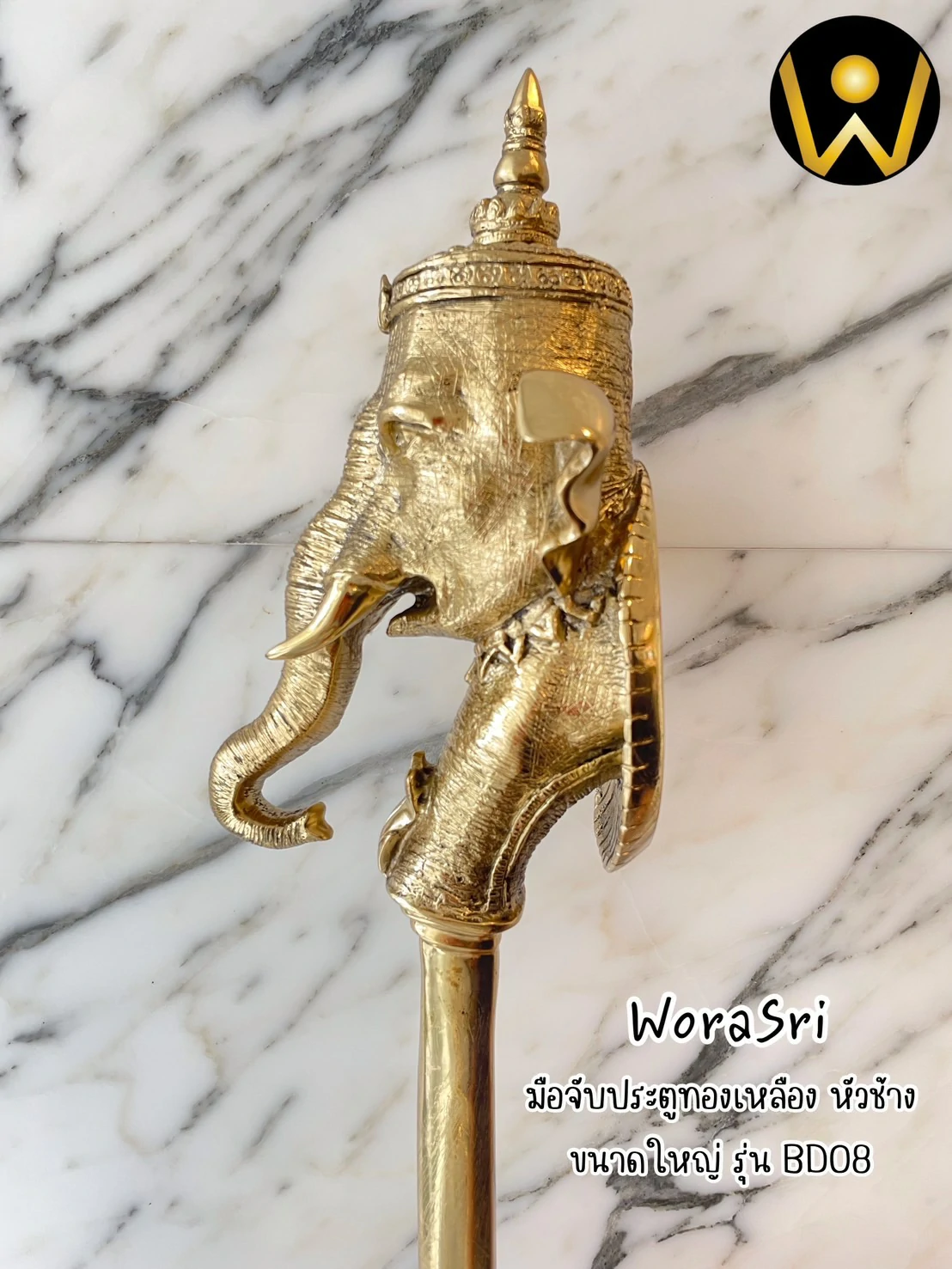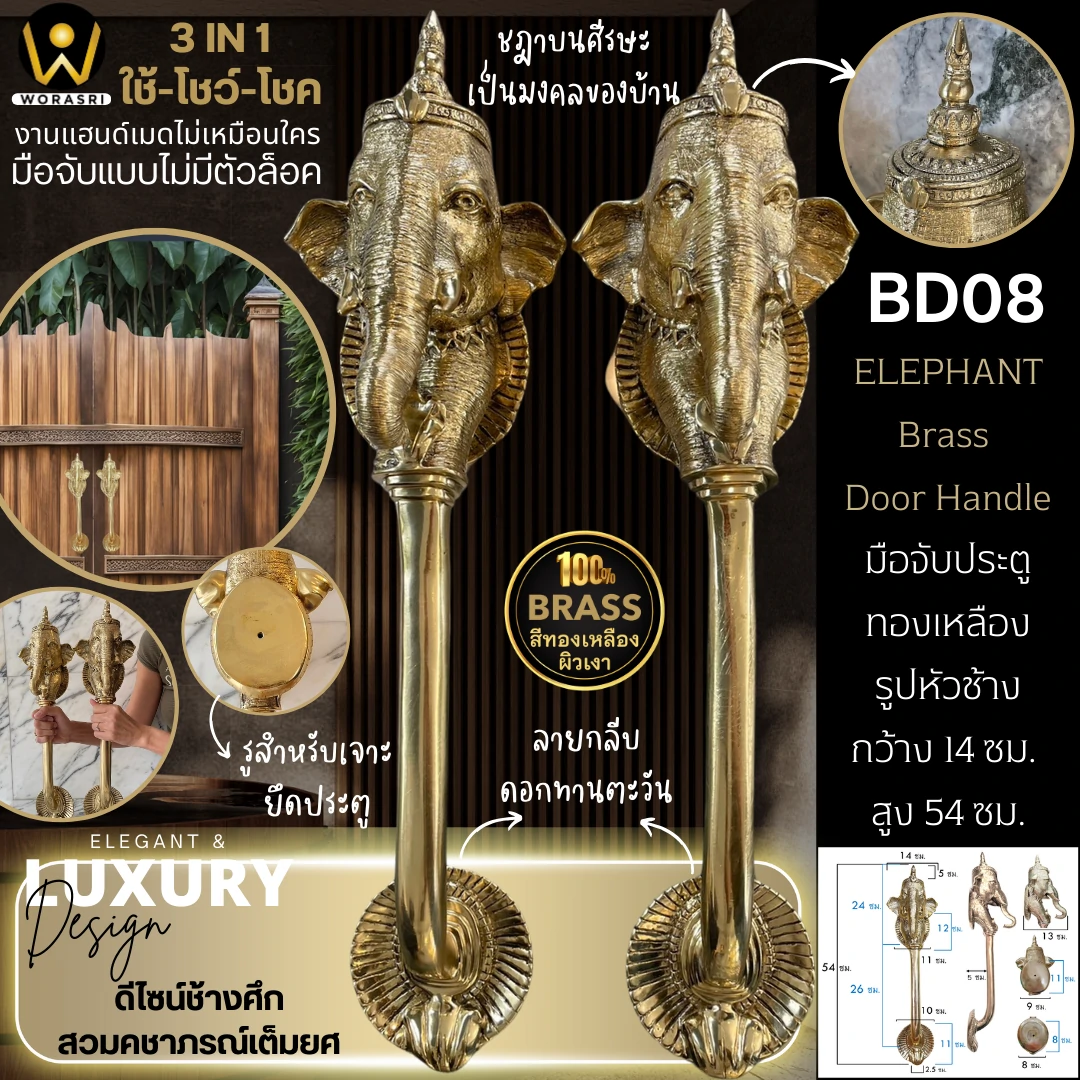 มือจับประตูทองเหลืองหัวช้างขนาดใหญ่ ทำจากทองเหลืองแท้ ขนาดใหญ่ถึง 54 ซม. งานแฮนด์เมดที่ไม่เหมือนใคร แตกต่างจากในตลาด เหมาะกับการยกระดับบ้านธรรมดาให้ดูหรูหรา สร้างบารมีให้กับเจ้าของบ้าน งานมาสเตอร์พีช น้ำหนักมาก แข็งแรง ทนทาน ใช้ได้นาน