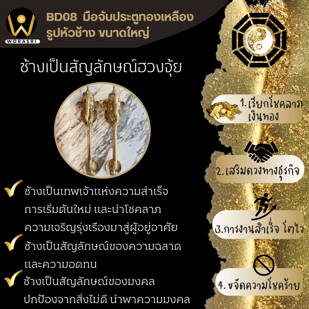 - รูปหัวช้างน่าเกรงขามมากบารมี แสดงถึงความแข็งแกร่งและสง่างาม ช่วยเสริมความรู้สึกมั่นคงและมั่งคั่งให้กับบ้านของคุณ