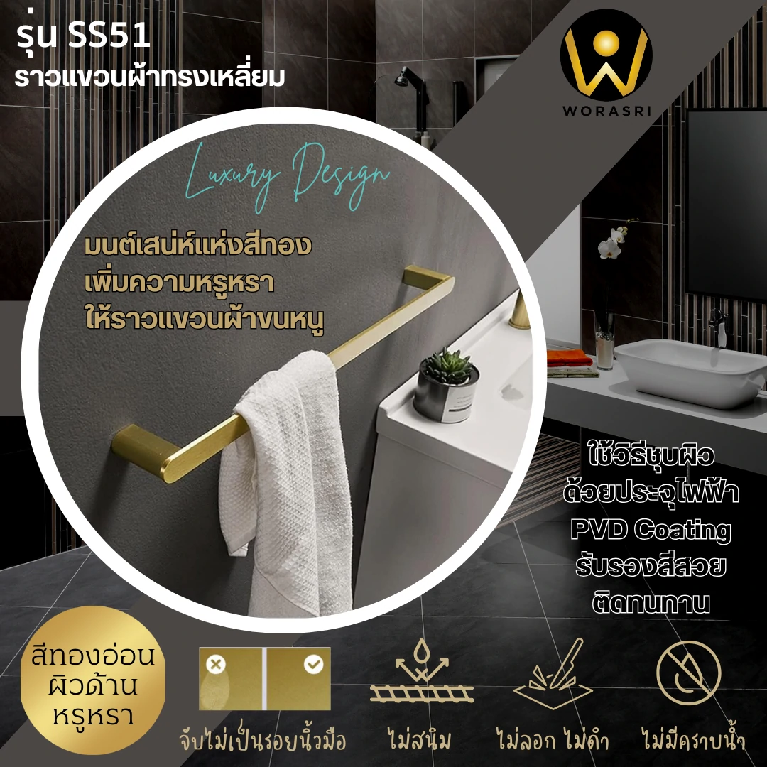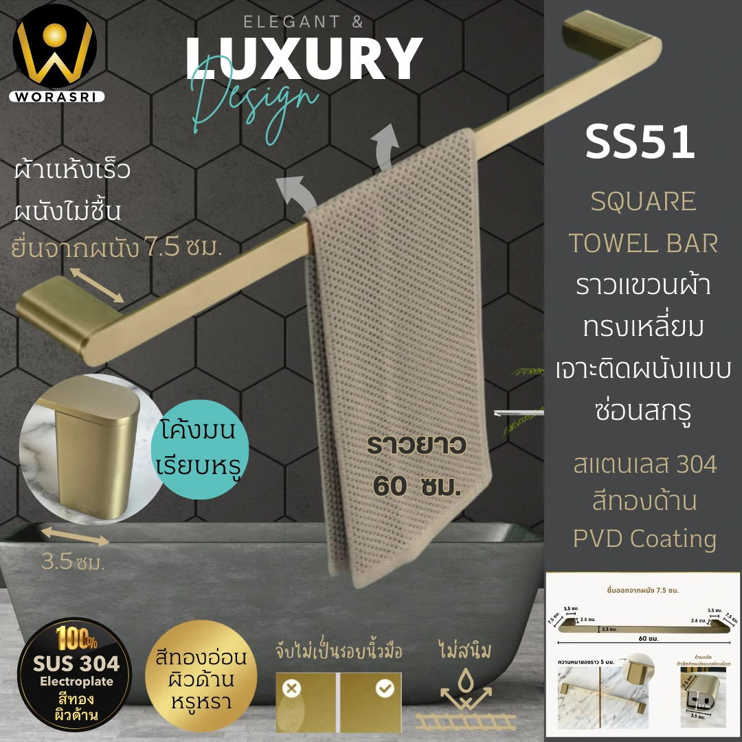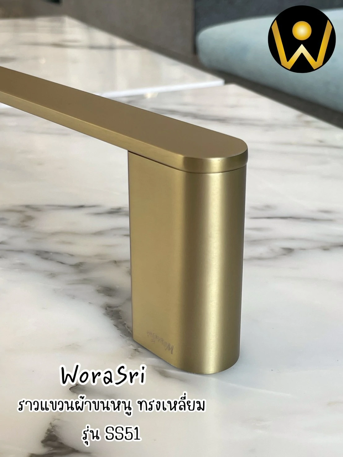 ราวแขวนผ้าขนหนูทรงเหลี่ยม ผู้ช่วยตัวเก่งของคุณแขวนผ้าขนหนูได้กว้างกว่าเดิม ราวแขวนผ้าเดี่ยว สไตล์โมเดิร์นที่จะเพิ่มความลักซ์ชัวรี่ให้กับห้องน้ำของคุณ ตัวราวแขวนขอบโค้งมนสุดแสนจะเรียบหรู ตัวราวยาวถึง 60 ซม. สีทองผิวด้านแต่มีความเงางามที่โดดเด่น ดีไซน์ตัวราวที่คิดมาแล้ว ไม่ต้องกลัวว่าจะโดนตัวราวแขวนเกี่ยวขณะเดินผ่านเพราะขอบราวแขวนโค้งมนทำให้เดินผ่านได้อย่างสบายใจ และยังแขวนผ้าได้เต็มผืน คลี่ผ้าก่อนแขวนได้เต็มที่ ตัวฐานยึดติดผนังเหล็กชิ้นหนาพิเศษ ไม่กลัวความเปียกชื้นเพราะผลิตจากวัสดุสแตนเลส 304 เนื้อหนาสุดๆ
