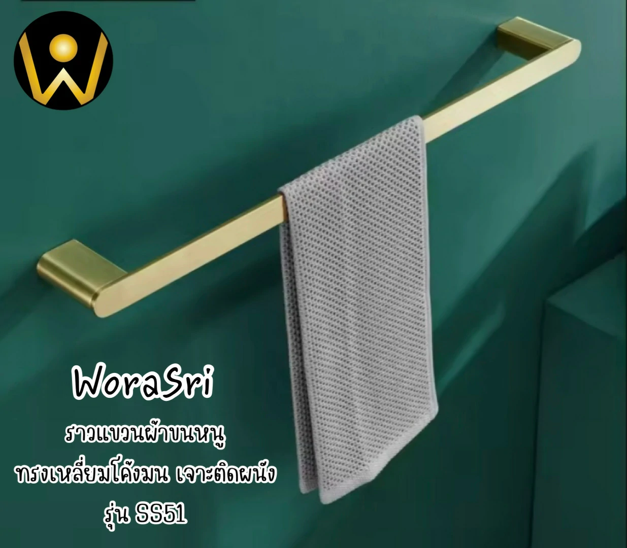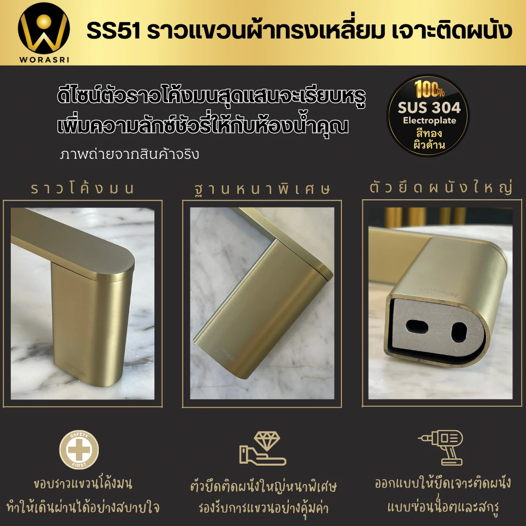 ราวแขวนผ้าขนหนูทรงเหลี่ยม สีทองผิวด้าน ยาว 60 ซม. สแตนเลส 304 SS51 Brushed Gold Towel Bar