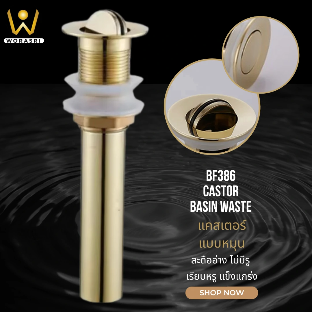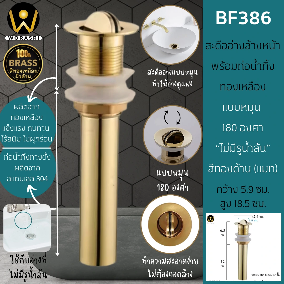 BF385-386 สะดืออ่างทองเหลือง แบบหมุน พร้อมท่อน้ำทิ้งแบบตั้งสแตนเลส 304 สีทองแมทหรูหรา (ฺBrushed Gold Waste Basin)