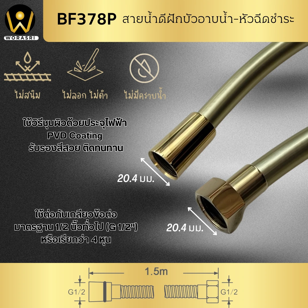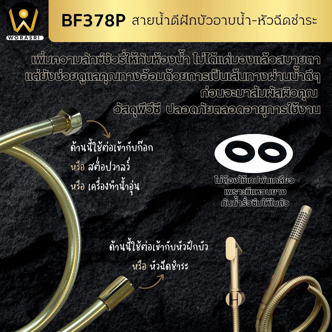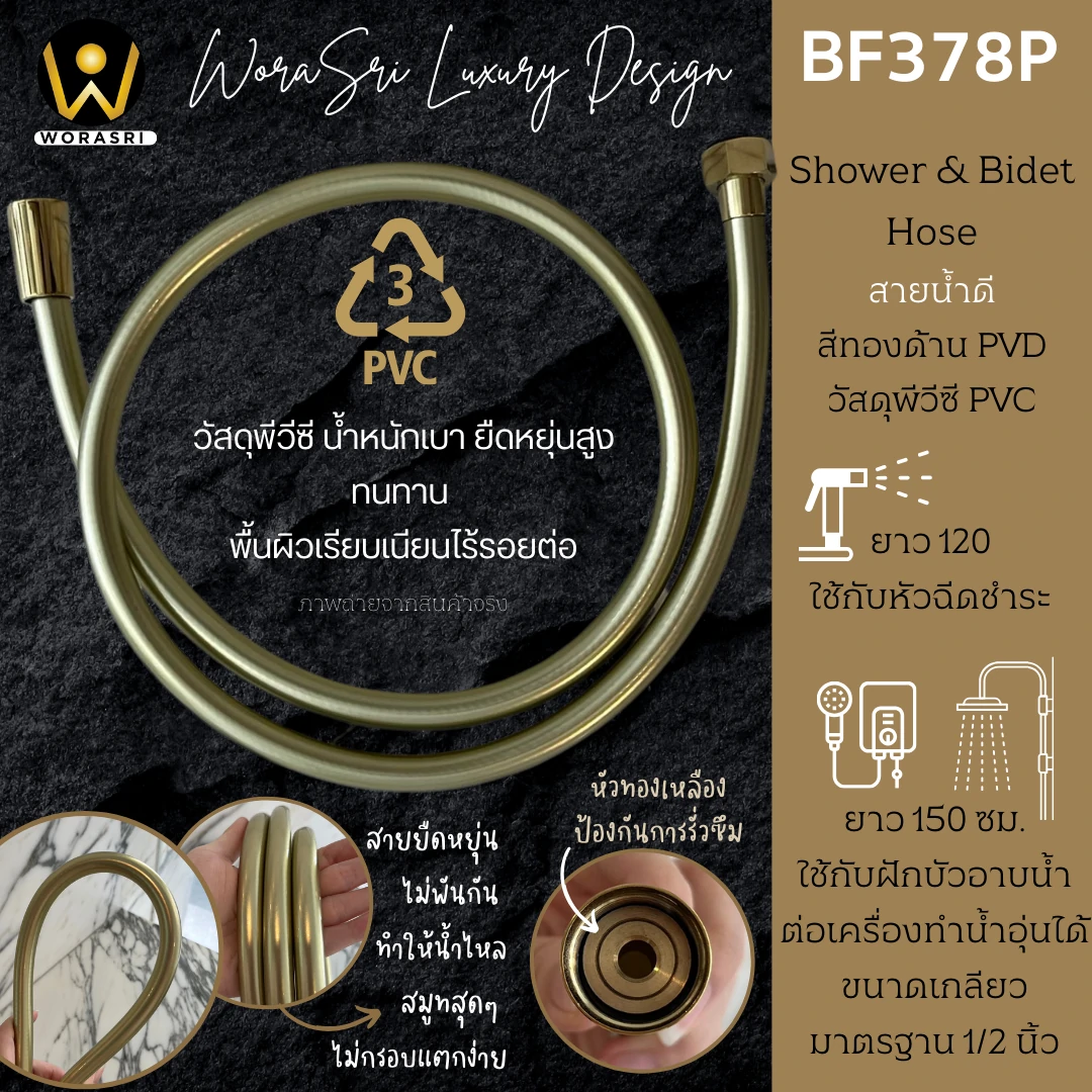 สายน้ำดีพีวีซีสายฉีดชำระ สายน้ำดีสีทองตะโก๊นนนน จาก WoraSri สายน้ำดีคุณภาพดีที่จะช่วยเปลี่ยน Mood & Tone ห้องน้ำของคุณให้เป็นห้องน้ำสุดหรูแสนรัก เพิ่มความลักซ์ชัวรี่ให้กับห้องน้ำง่ายๆ ไม่ได้แค่มองแล้วสบายตา แต่ยังช่วยดูแลคุณทางอ้อมด้วยการเป็นเส้นทางผ่านน้ำดีๆ ก่อนจะมาสัมผัสผิวคุณ ด้วยวัสดุพีวีซีอย่างดีเป็นมิตรกับสิ่งแวดล้อม ปลอดภัยขั้นสุดตลอดอายุการใช้งาน