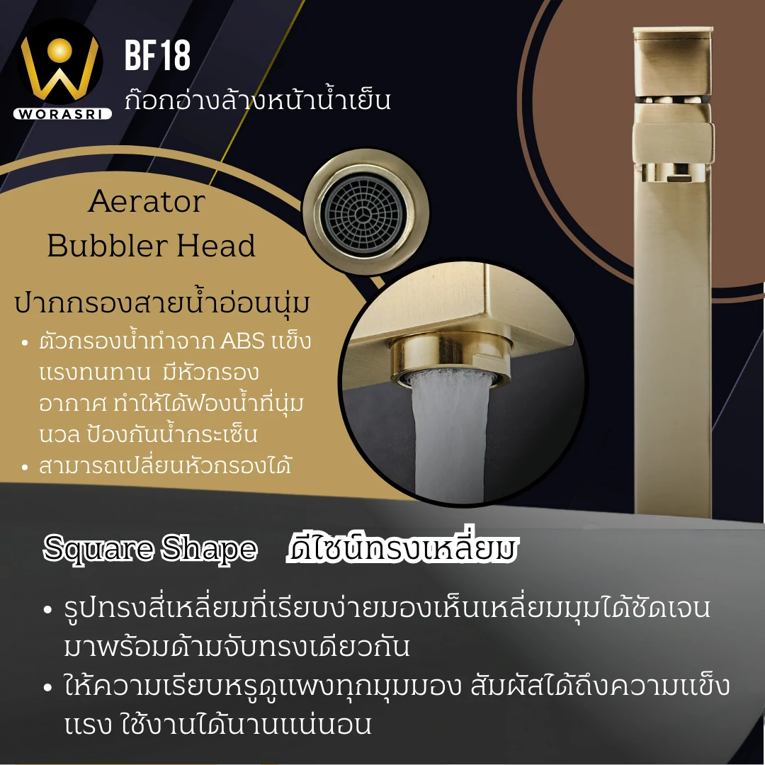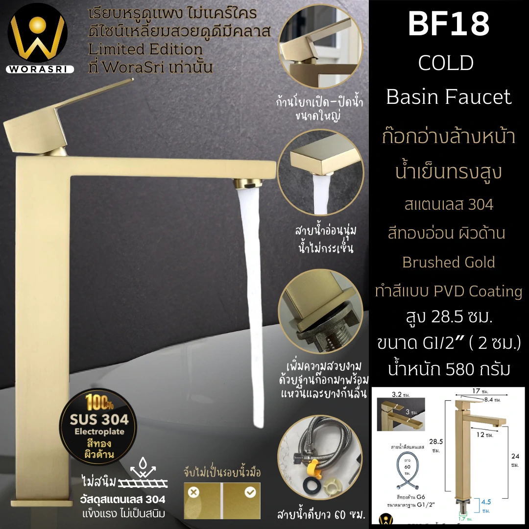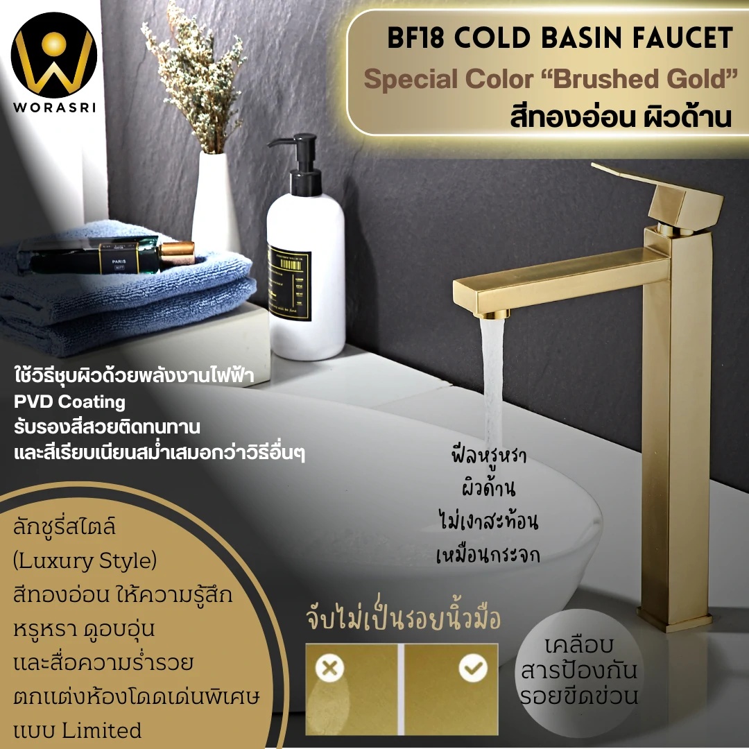 1. รุ่น BF18 สีทองด้าน Brushed Gold เคลือบผิวแบบ PVD (Physical Vapor Deposition)