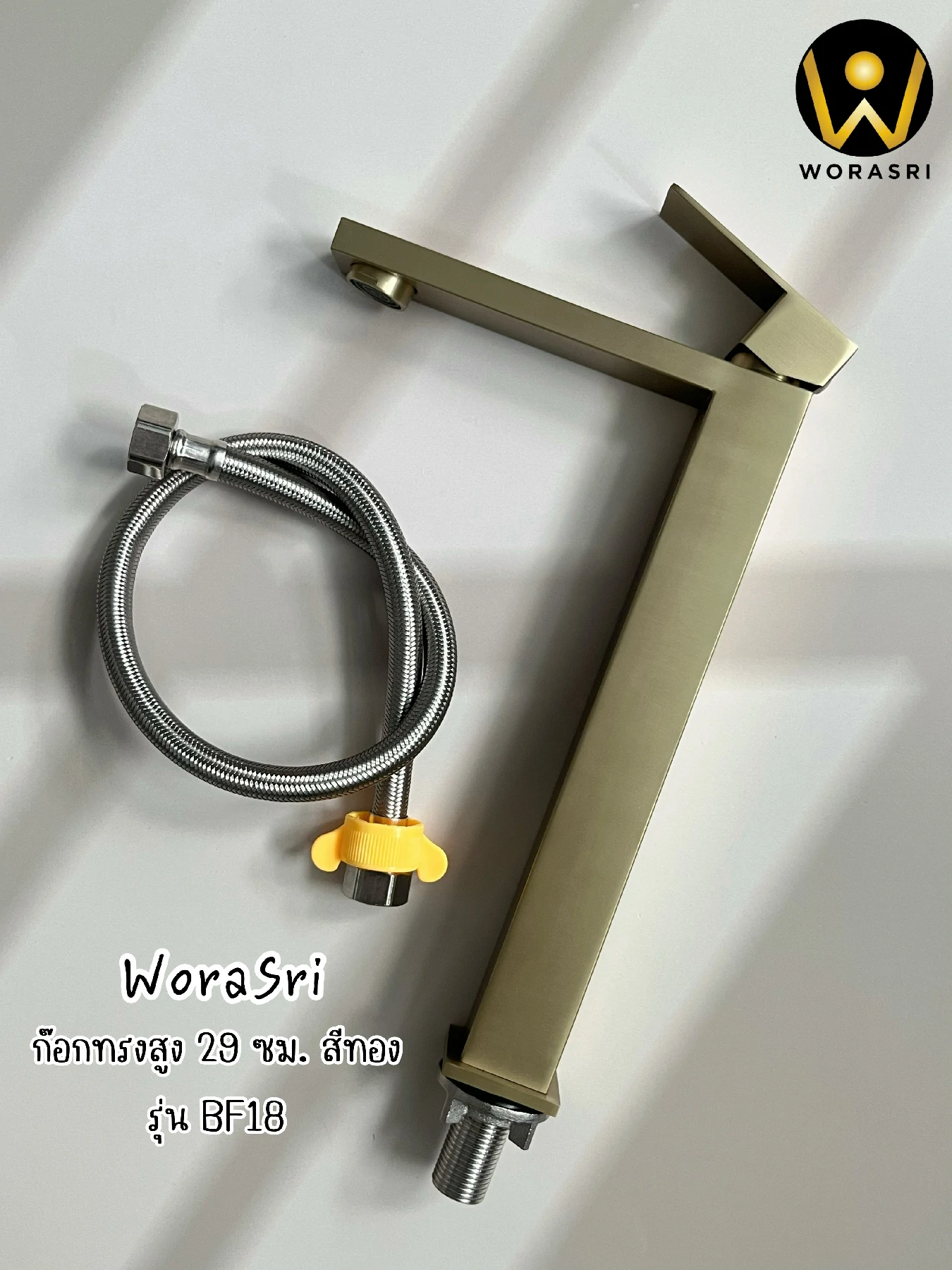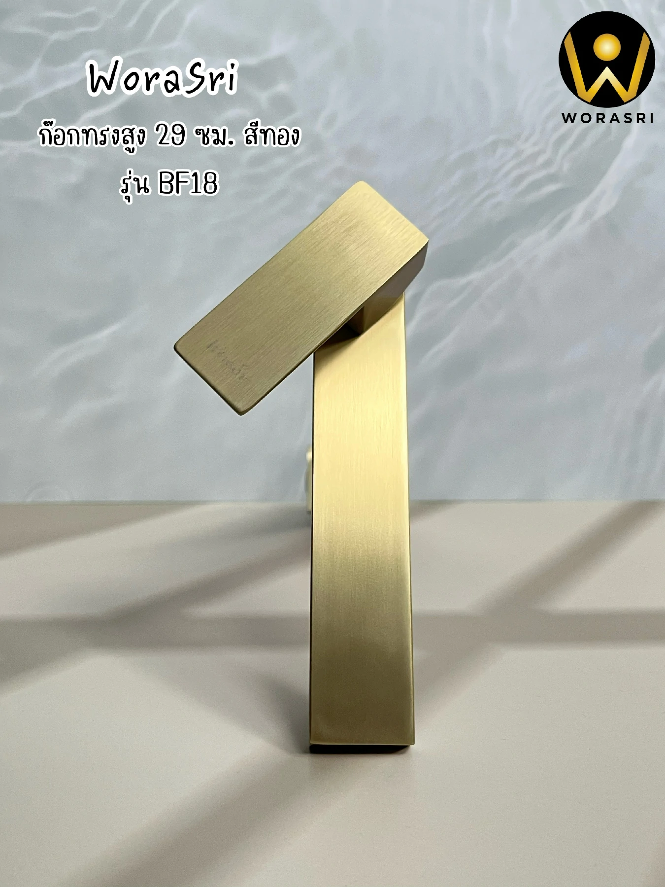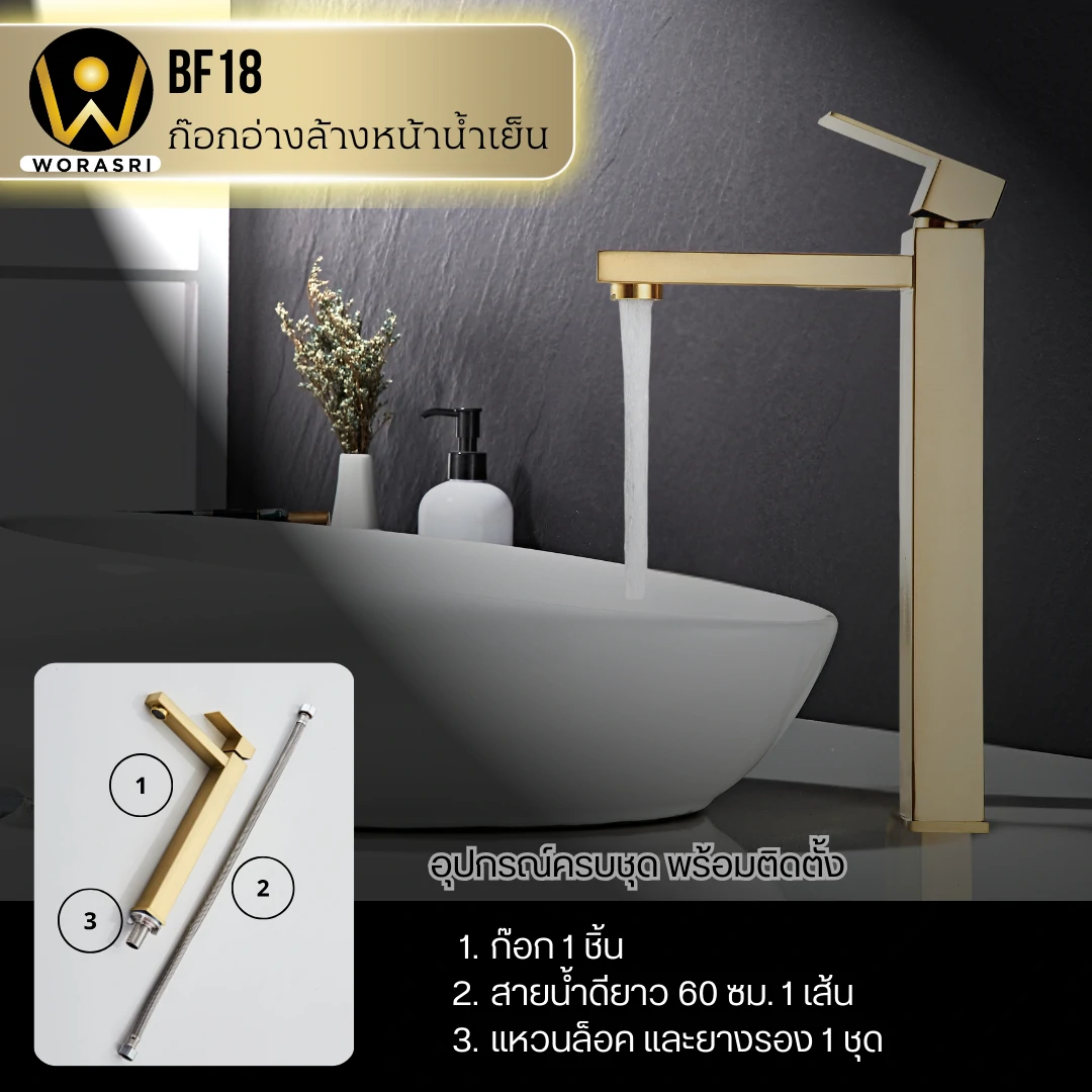 ก๊อกอ่างล้างหน้าทรงสูงดีไซน์เหลี่ยมสีทอง BF18 Brushed Gold Tall Square Shape Basin Faucet