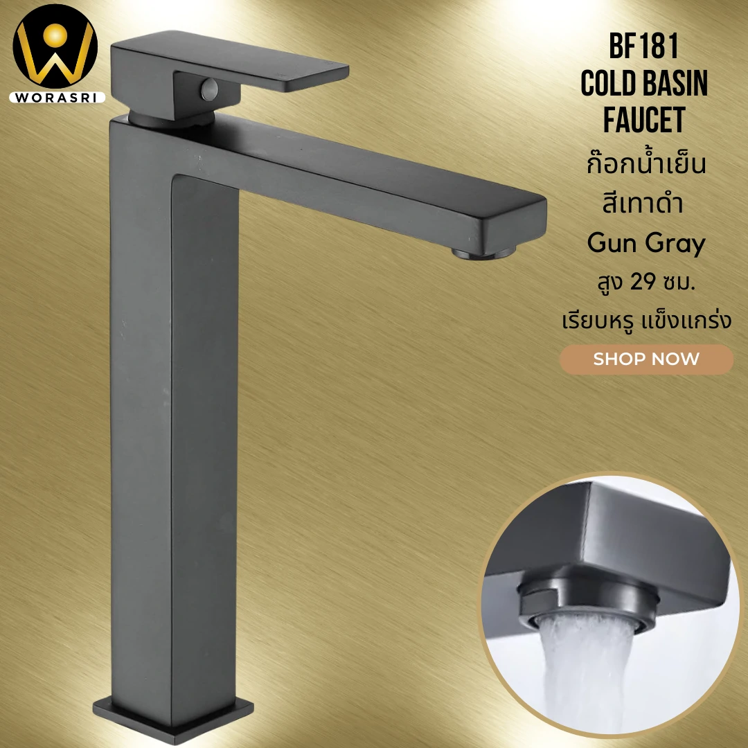 ก๊อกอ่างล้างหน้าทรงสูงดีไซน์เหลี่ยมสีทอง ก๊อกน้ำเย็นที่เรียบหรูคลาสสิคไม่ตกยุค และแฝงไปด้วยความแข็งแรงด้วยดีไซน์ทรงเหลี่ยม สไตล์โมเดิร์นรูปทรงที่มีเหลี่ยมมุมชัดเจน ด้ามจับทรงเดียวกับตัวก๊อก ก้านโยกเปิด-ปิดน้ำขนาดใหญ่ มีหัวกรองอากาศกันน้ำกระเซ็นให้น้ำไหลนุ่มนวล ไม่พุ่งแรงกระเด็นเปียก ก๊อกทรงสูงใช้ได้กับอ่างล้างหน้าทุกประเภท มีให้เลือกถึง 3 สี สีทองด้าน, สีเทาดำ และสีเงินด้าน ตกแต่งห้องน้ำได้หลากหลายสไตล์ ผลิตจากวัสดุสแตนเลส 304 เนื้อหนา แข็งแรง ทนทาน รับแรงดันน้ำได้ดี
